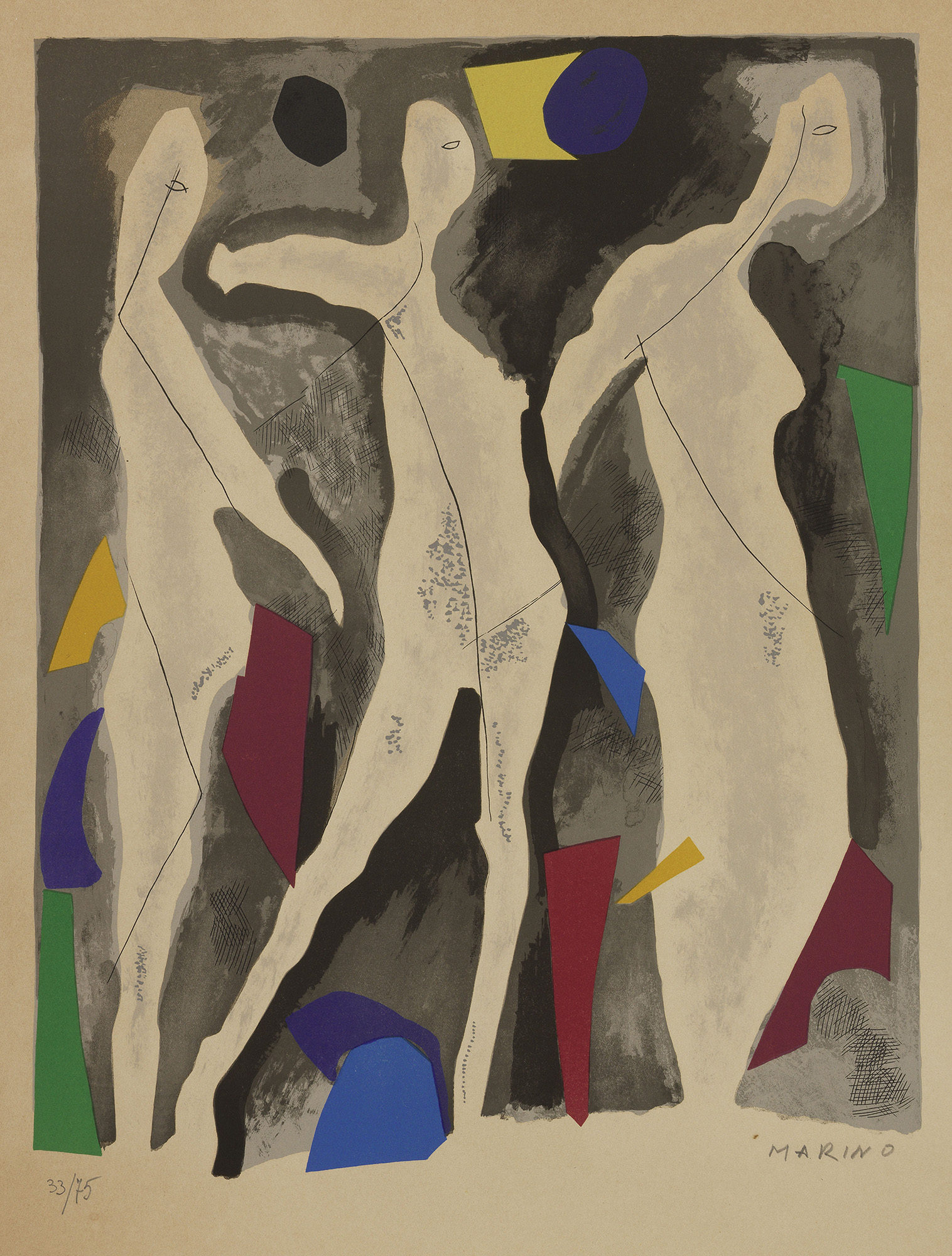 B) Personnages du sacre du printemps VII, 1974, litografia a colori, es. 33/75, cm. 51x39,5 (lastra), cm. 64x50 (carta). Firma a matita sul margine in basso a destra: Marino, tiratura in basso a sinistra: 33/75. Tavola VII dall'album Personnages du sacre du printemps VII; tiratura di 10 esemplari in numeri romani, 75 in numeri arabi, 25 fuori commercio in numeri romani e 3 nominativi, stampatore Mourlot, Parigi.
