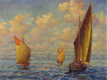 A. Vahl (XX secolo) Barche a vela Olio su cartone pressato Firmato Senza cornice Misure 61x82 cm