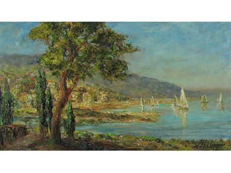 Wolfgang Heinz Unger (1929) Sul lago di Garda Olio su compensato Firmato Misure 51x91 cm