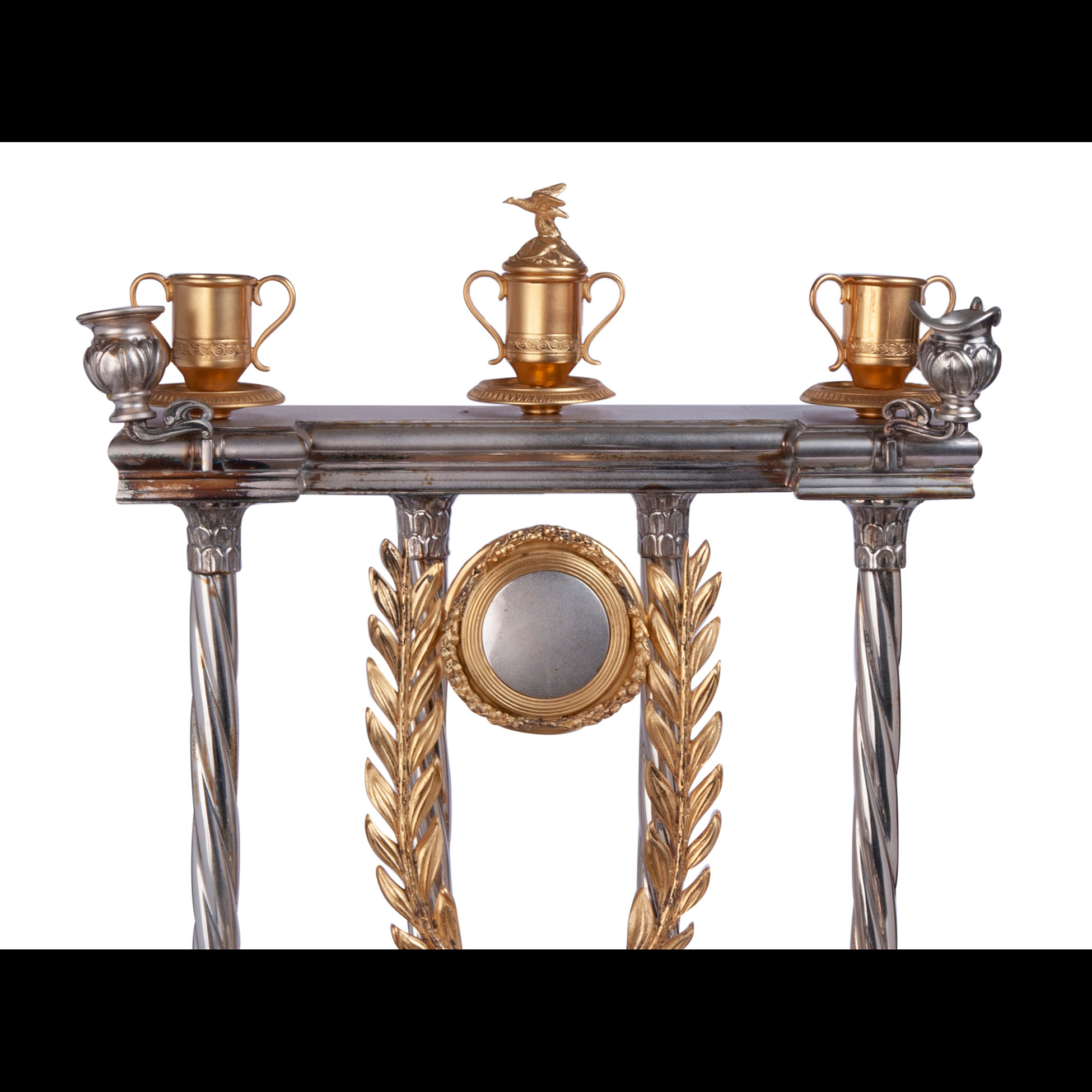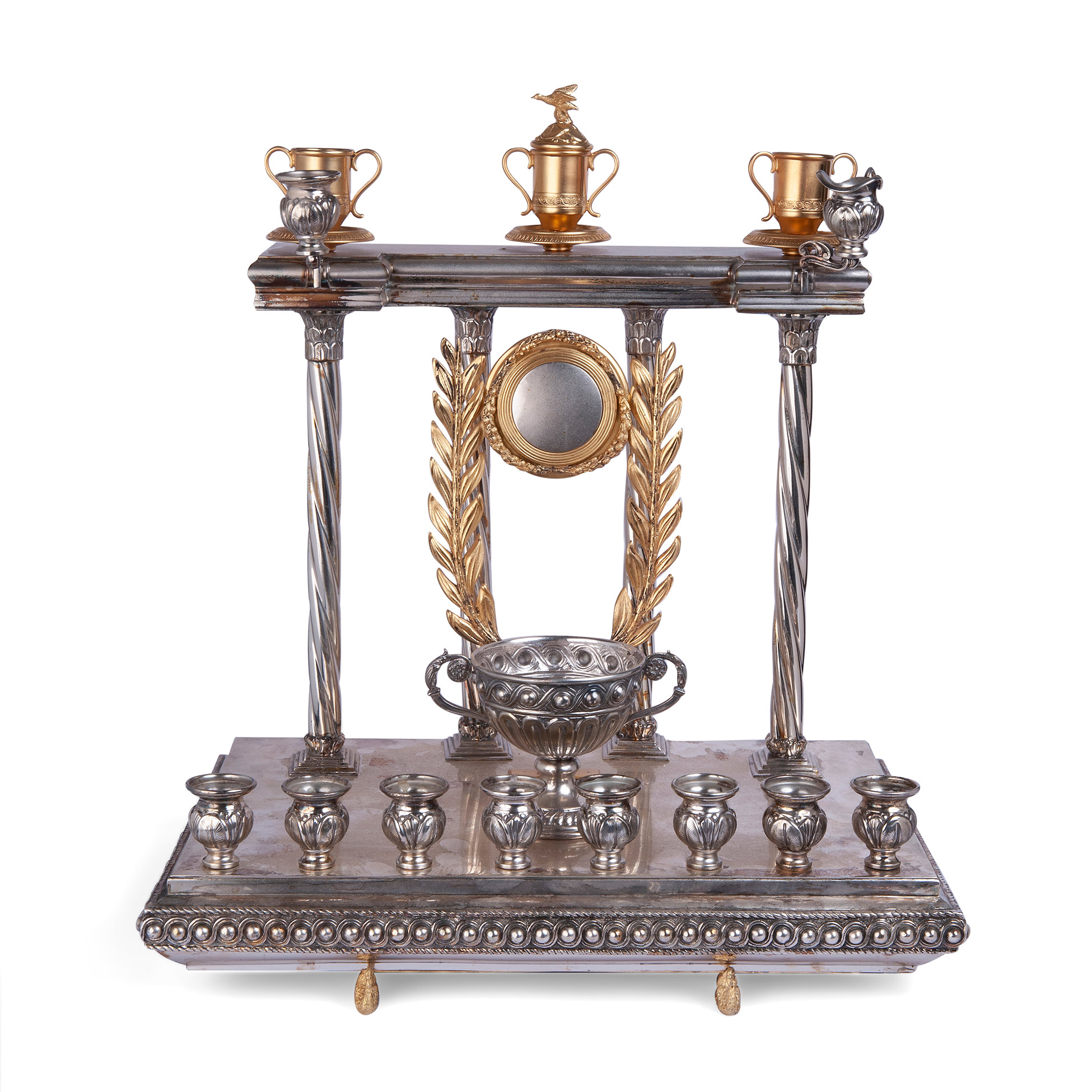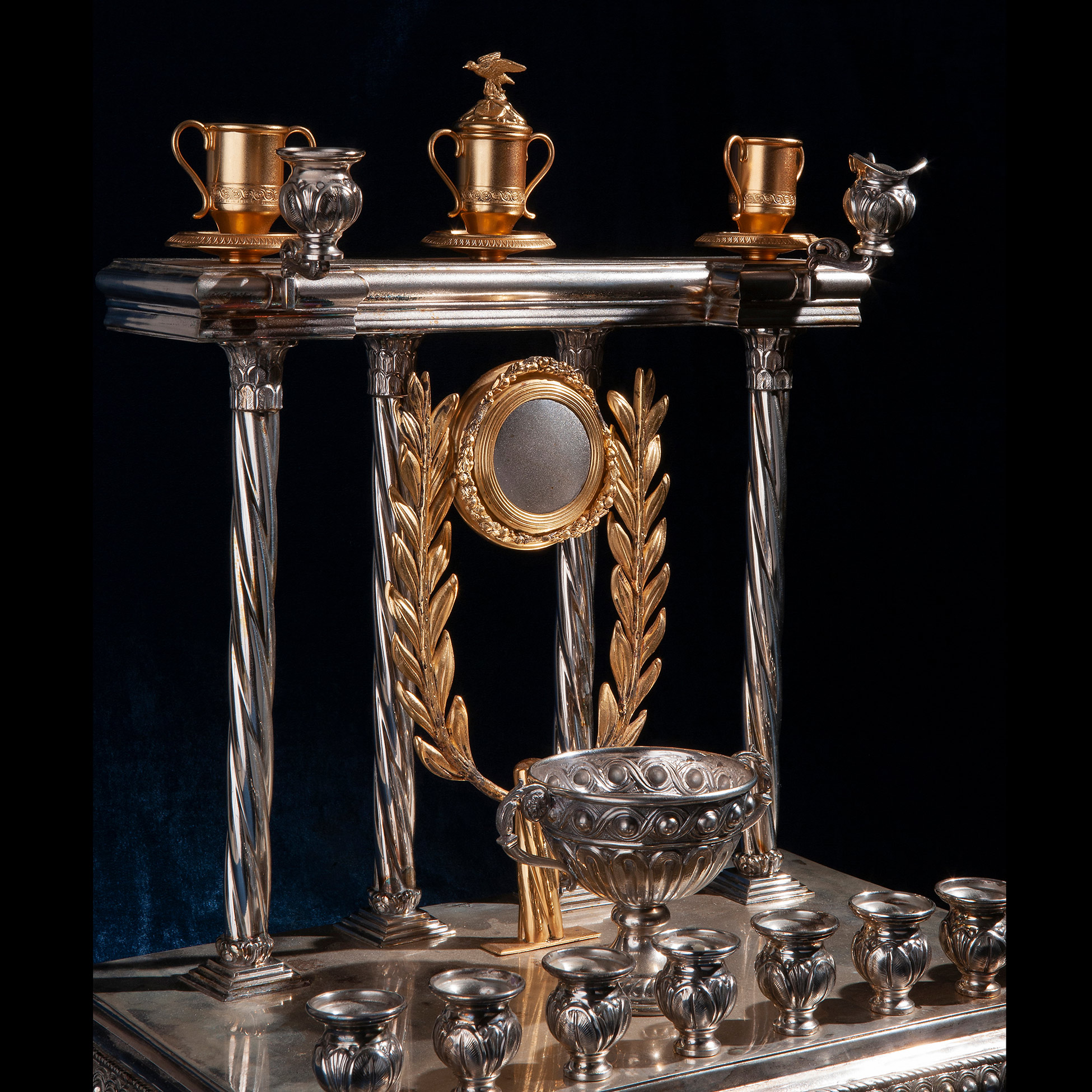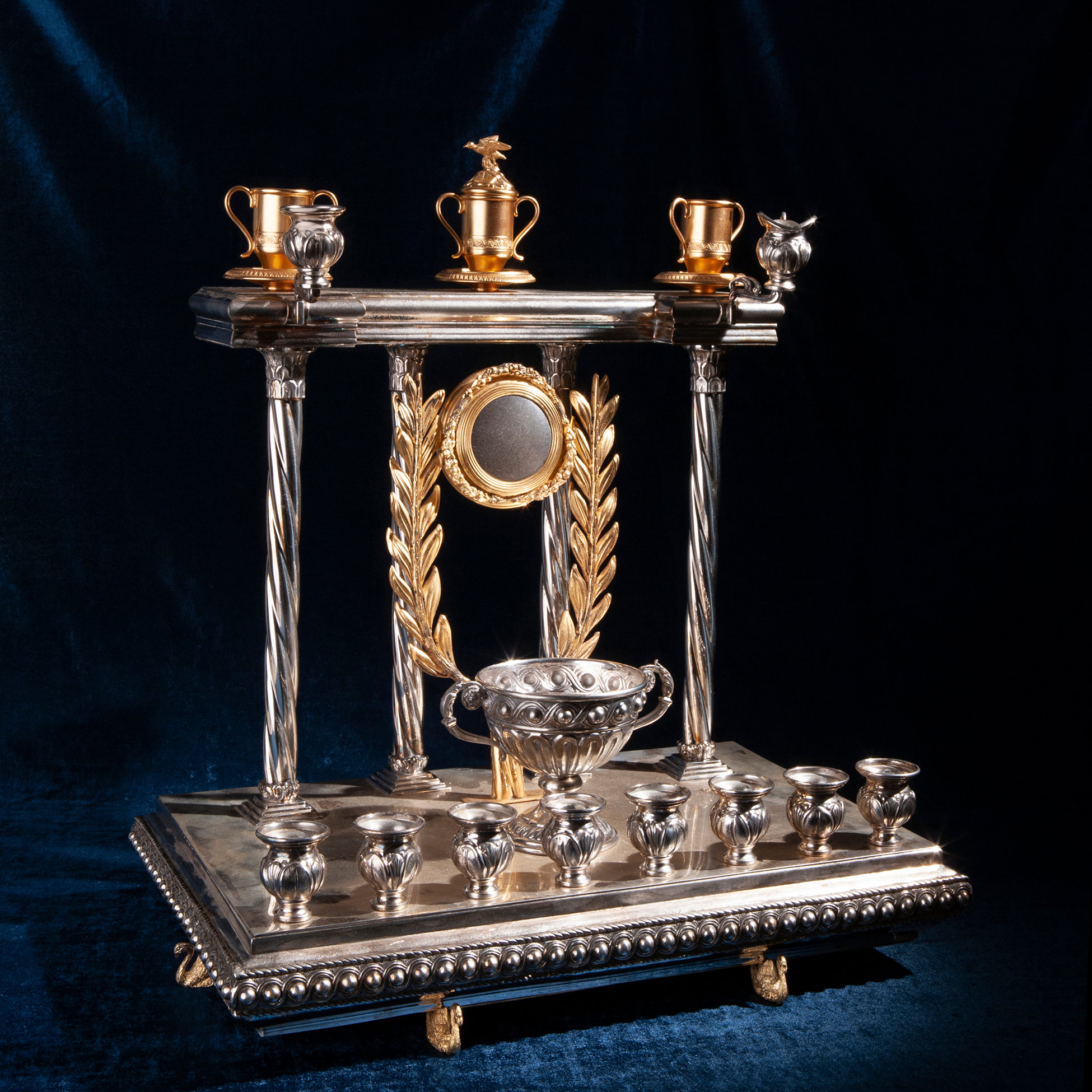 Hannukkah in argento, manifattura italiana 1980 ca Decorata con parti in argento dorato Peso complessivo gr. 6000, 50x44x29 cm.