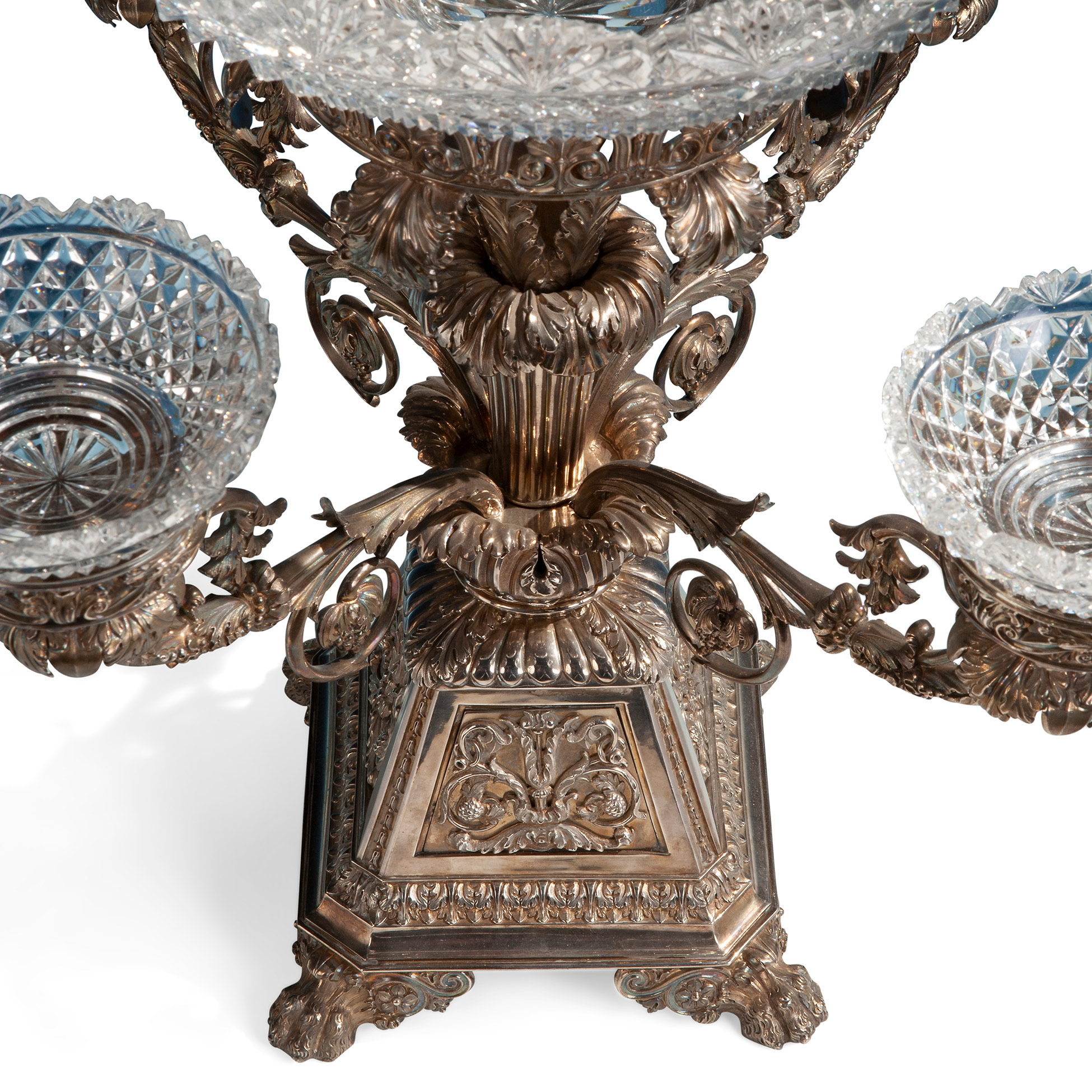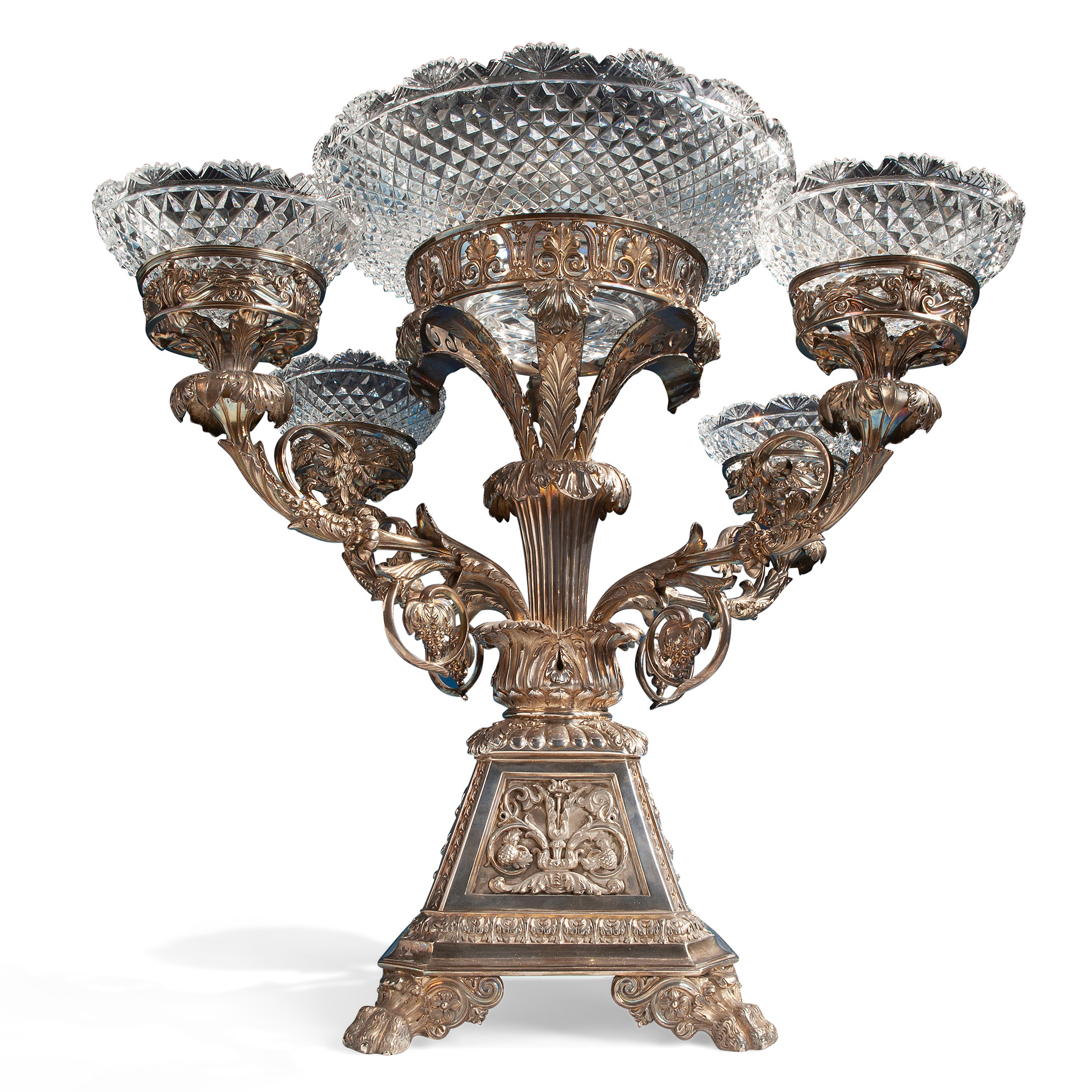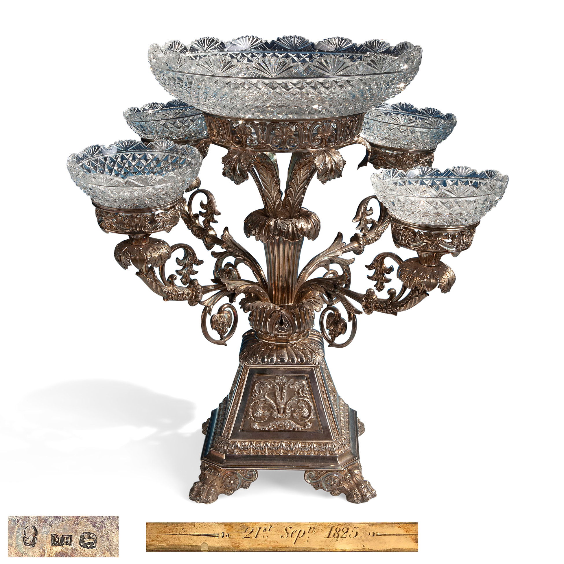 Epergne in argento, Birmingham 1824 Titolo 925, periodo Giorgio IV, maestro argentiere Matthew Bolton Peso complessivo - senza cristallo - gr. 4542, 41x36x36 cm.