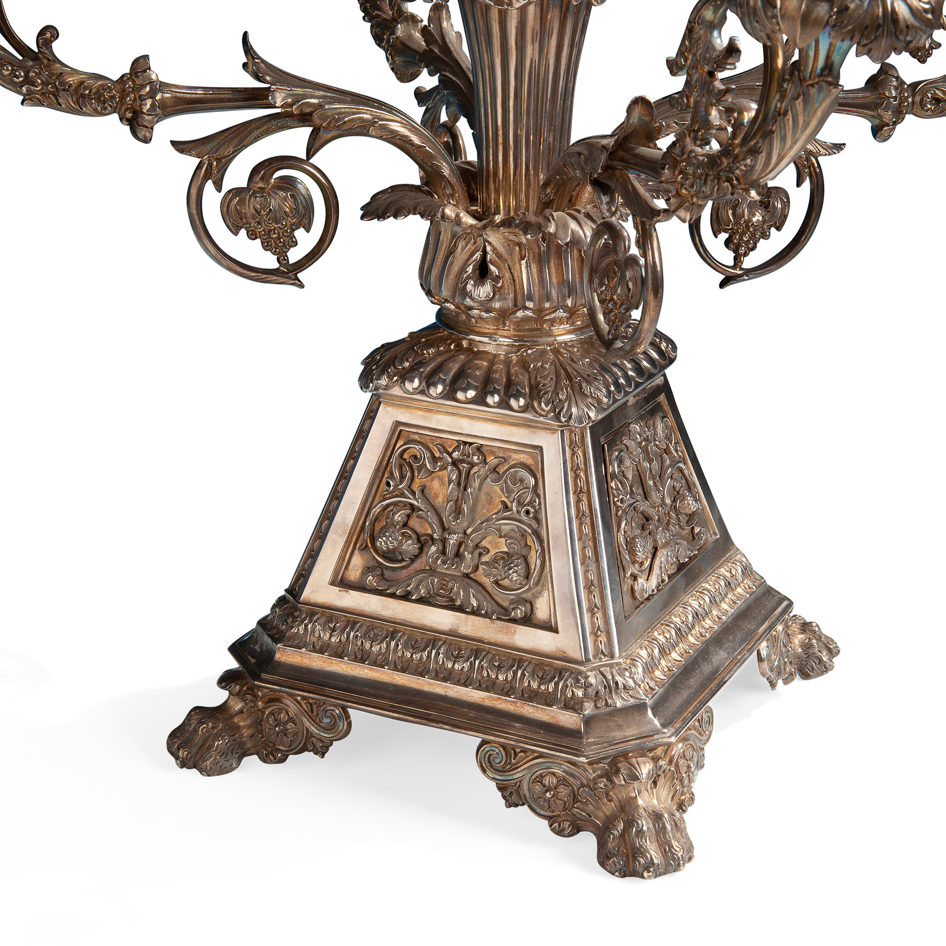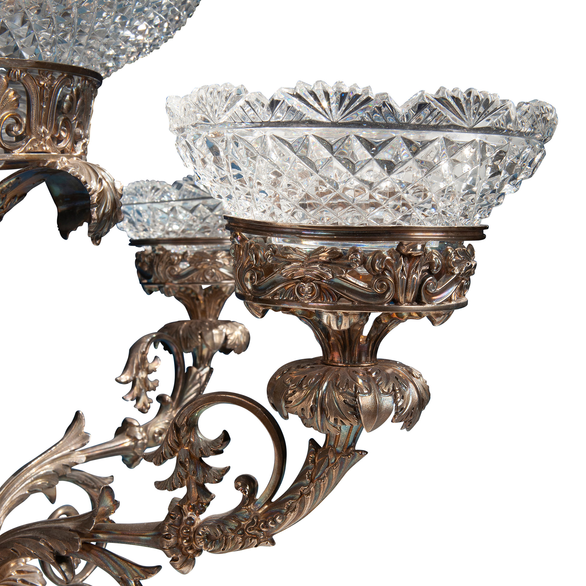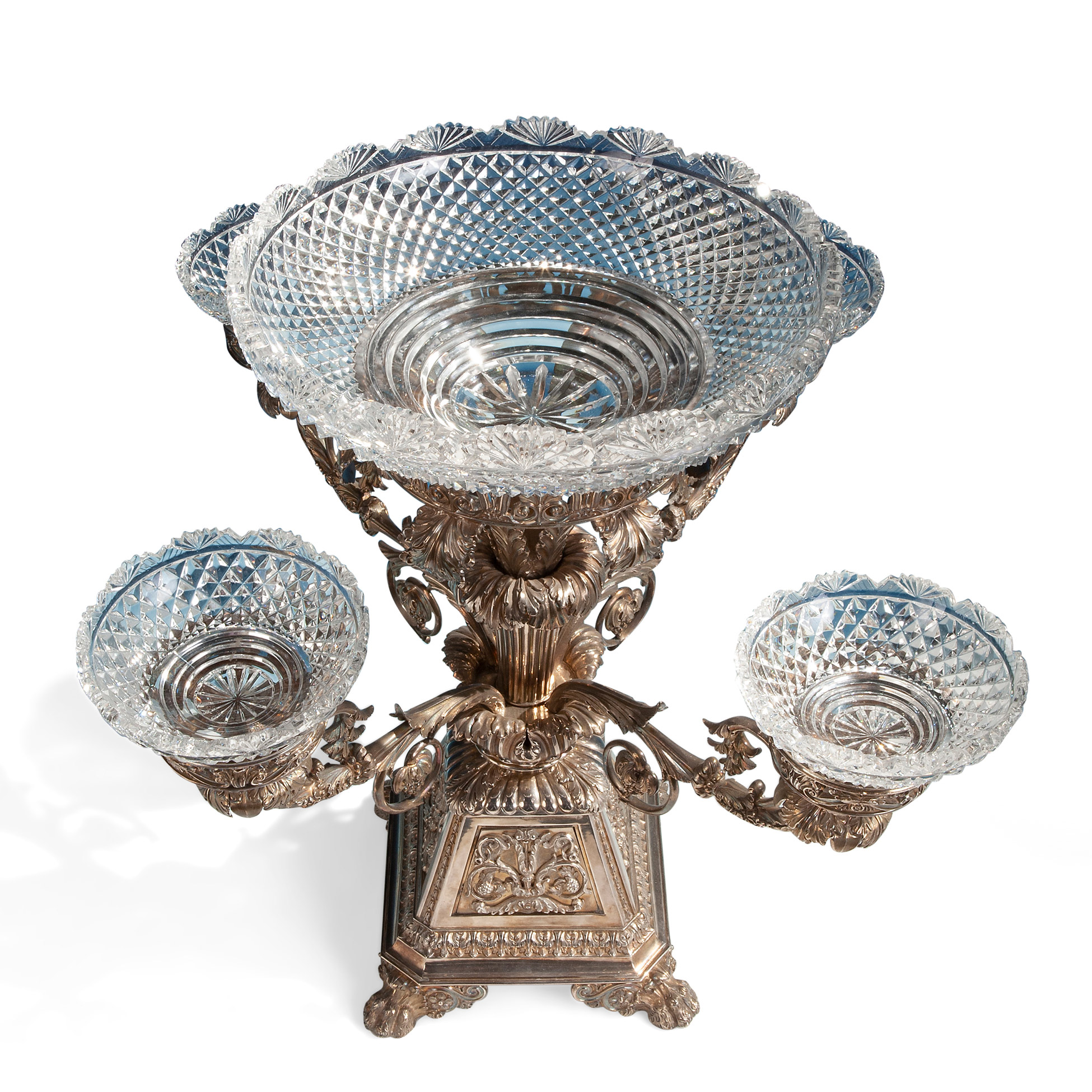 Epergne in argento, Birmingham 1824 Titolo 925, periodo Giorgio IV, maestro argentiere Matthew Bolton Peso complessivo - senza cristallo - gr. 4542, 41x36x36 cm.