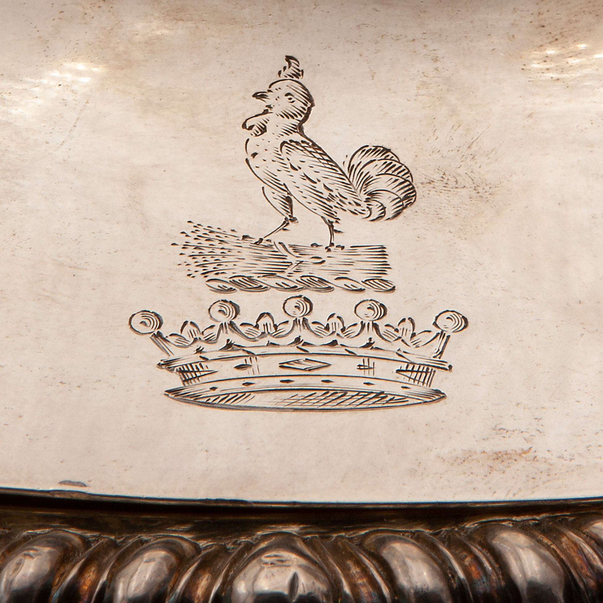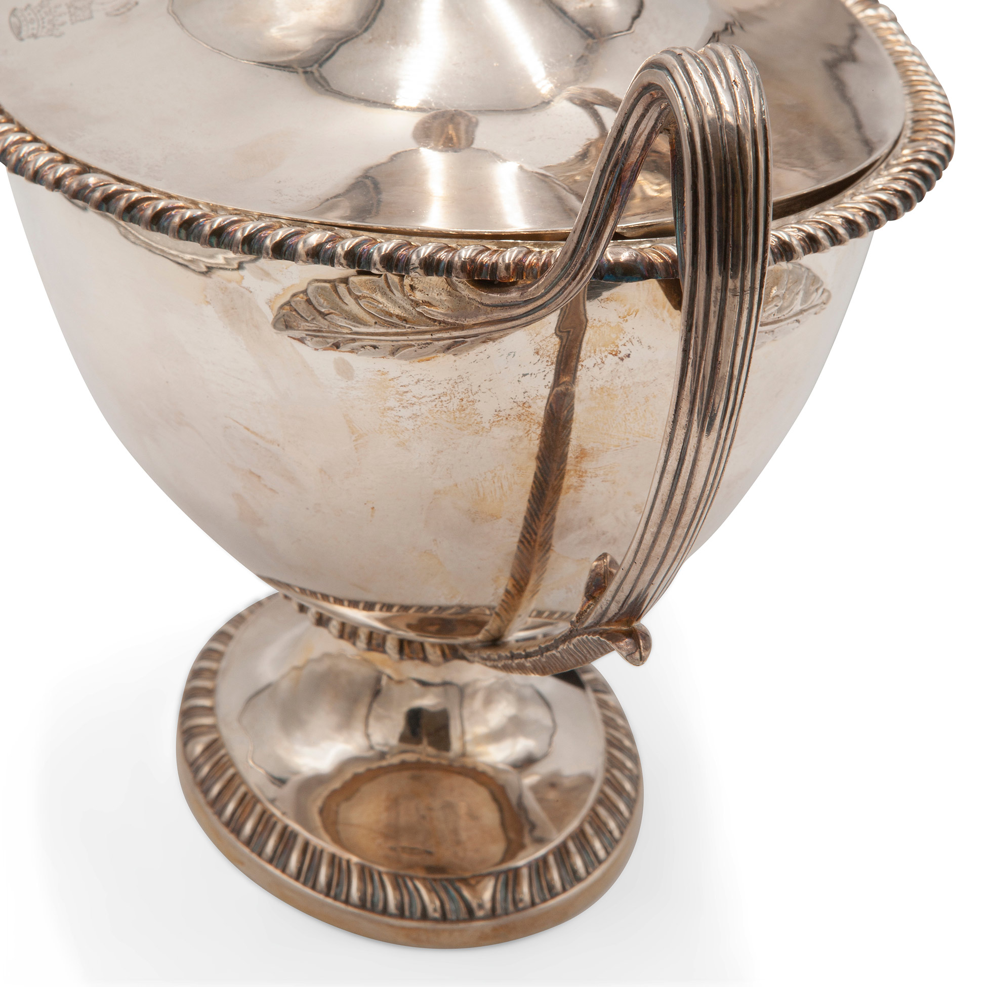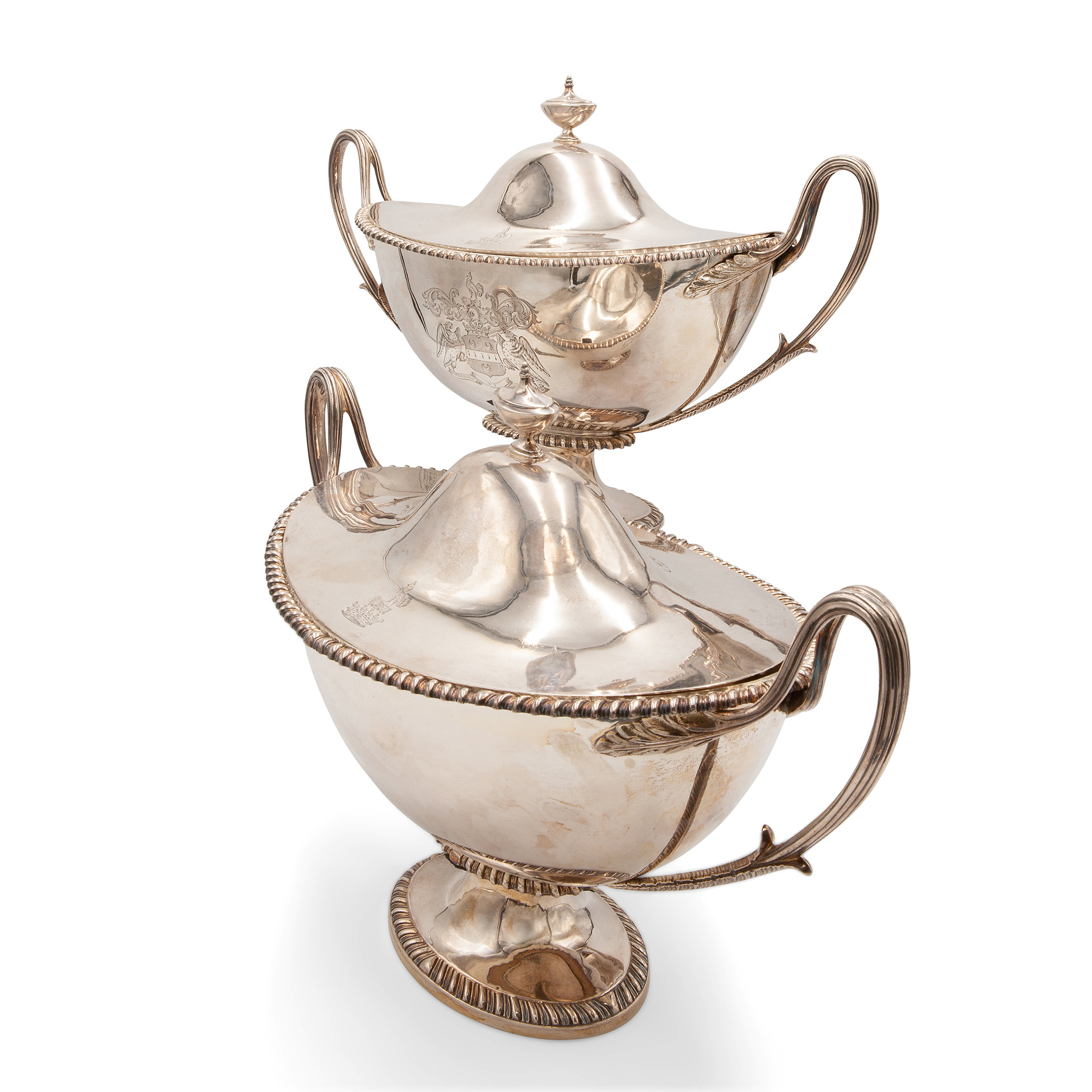 Coppia di zuppiere di forma ovale, Londra 1804 Peso complessivo gr. 4600, 31x42x21 cm. Cad.