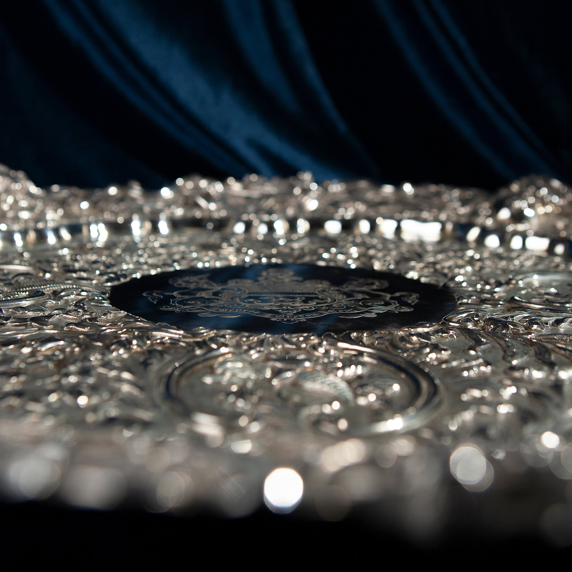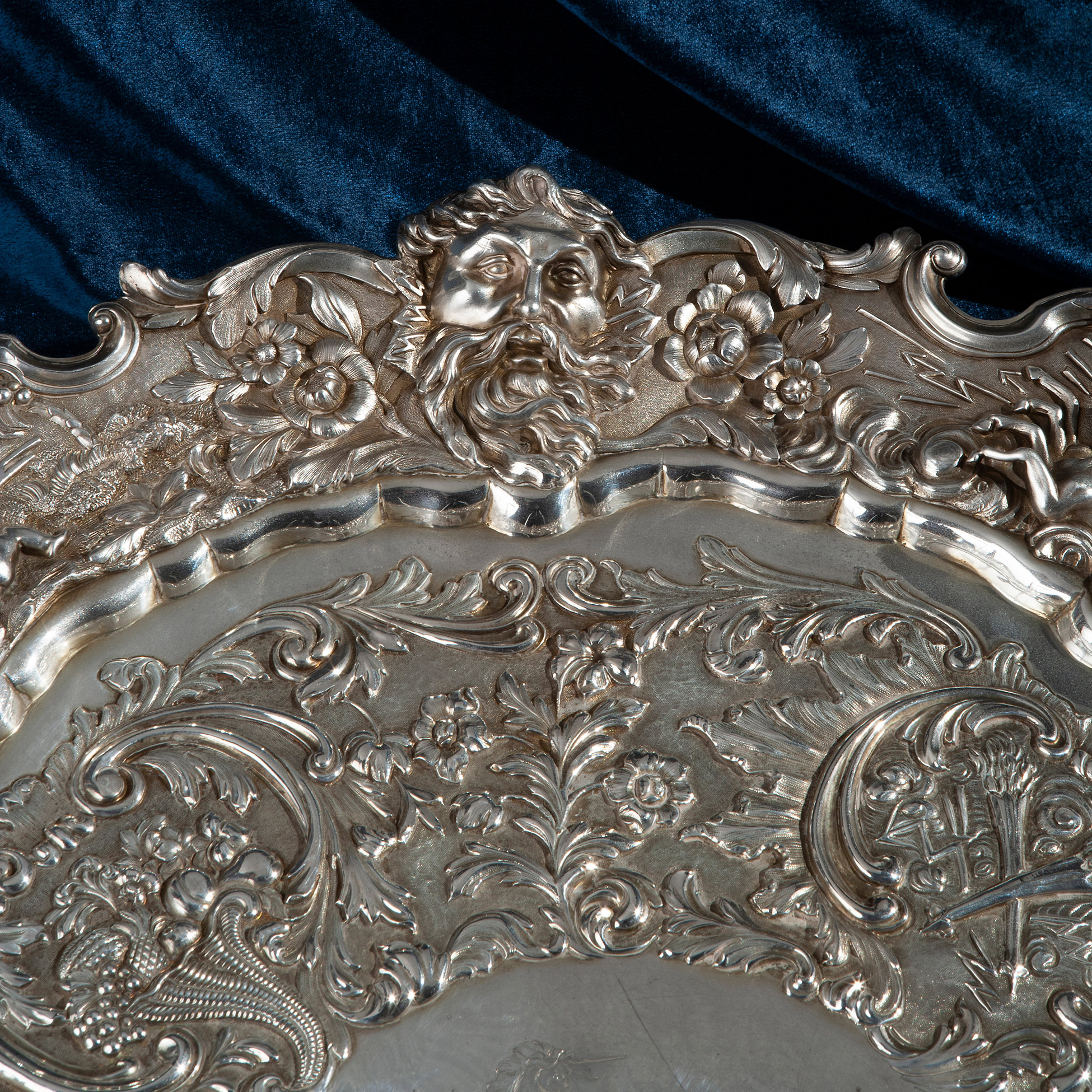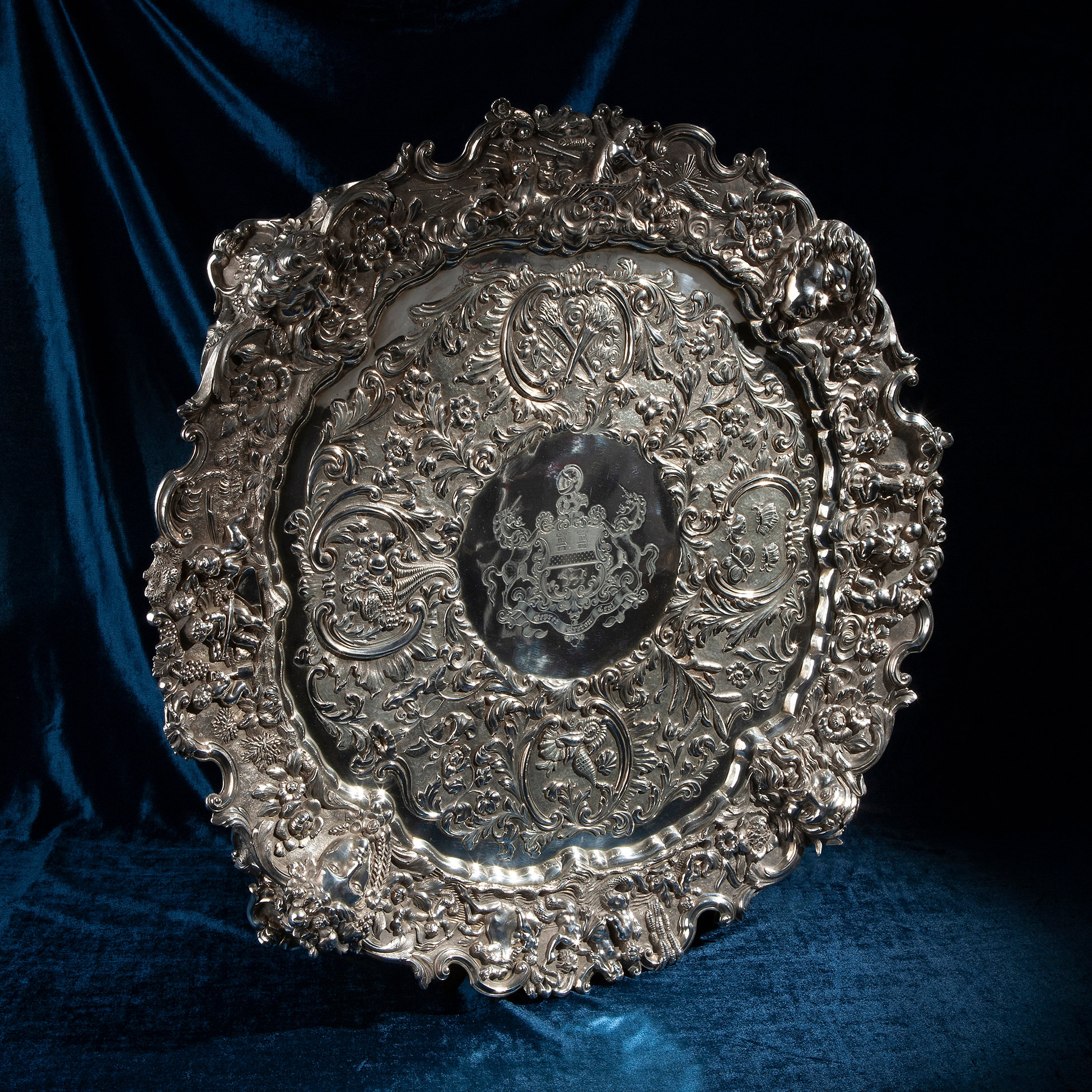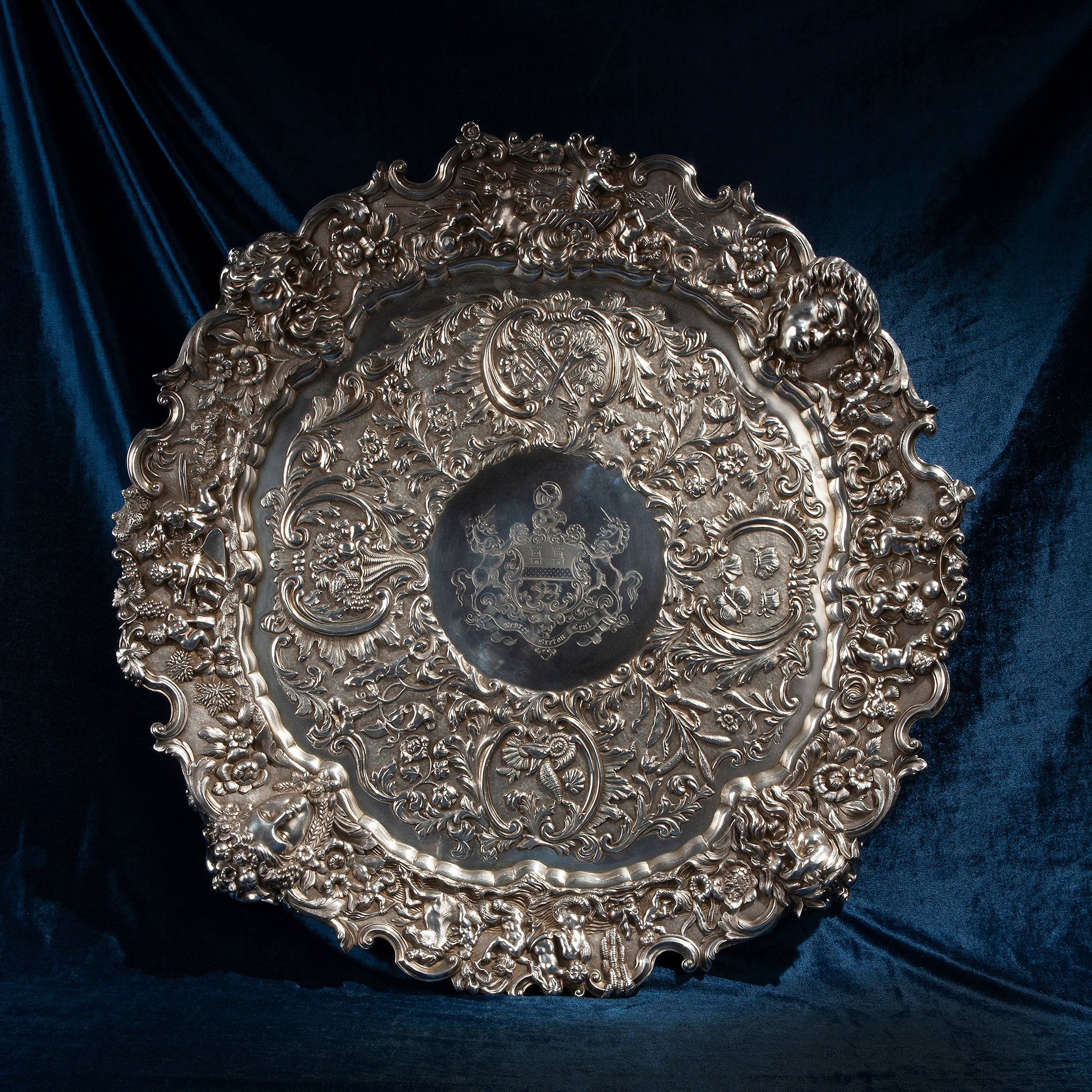 Salver "dei quattro elementi" in argento, Londra 1844 Questo Salver fu commissionato all'argentiere John Edward Terry. L'artista ha disegnato il manufatto descrivendo un'allegoria dei quattro elementi, rappresentati da quattro figure principali e da alt