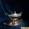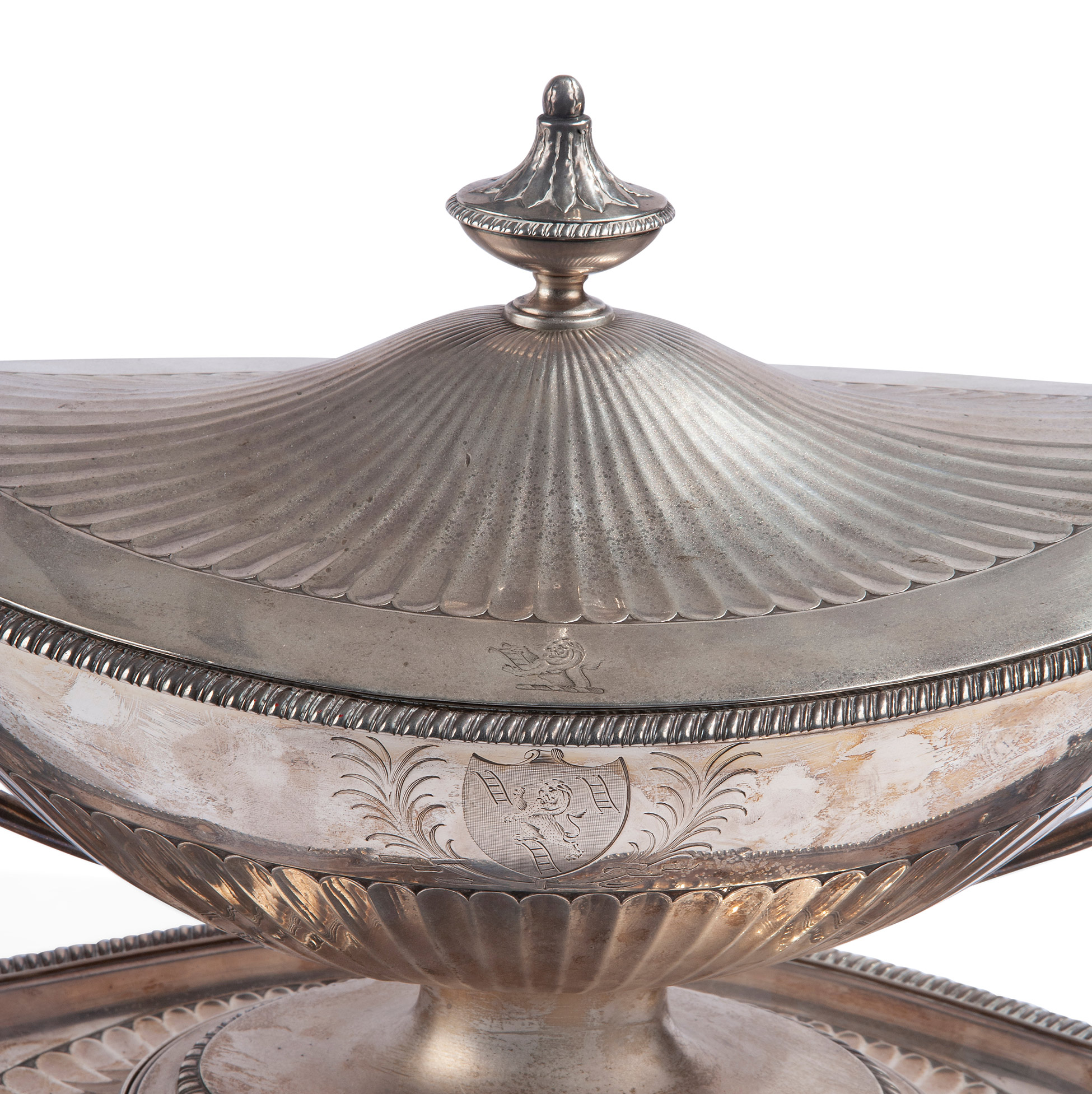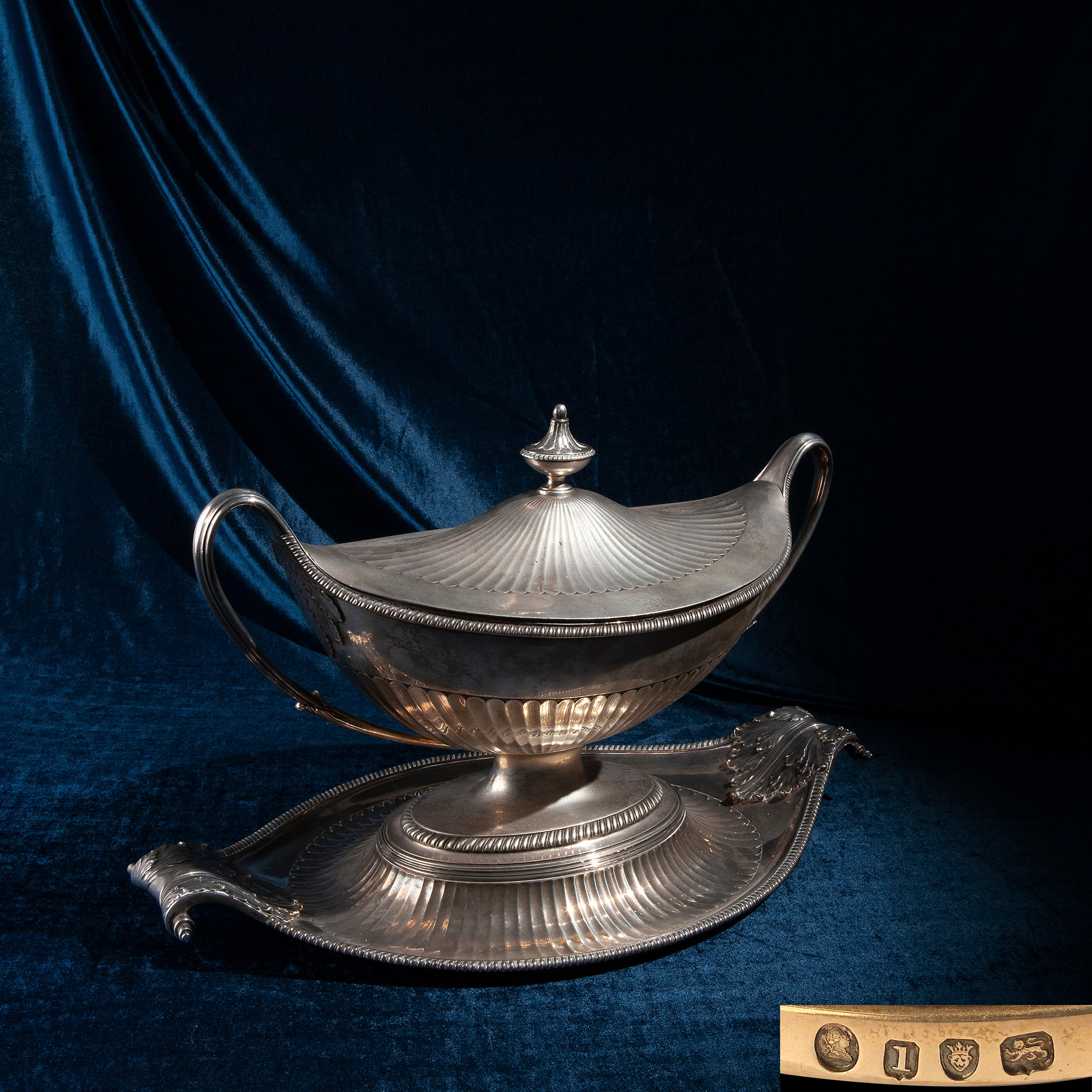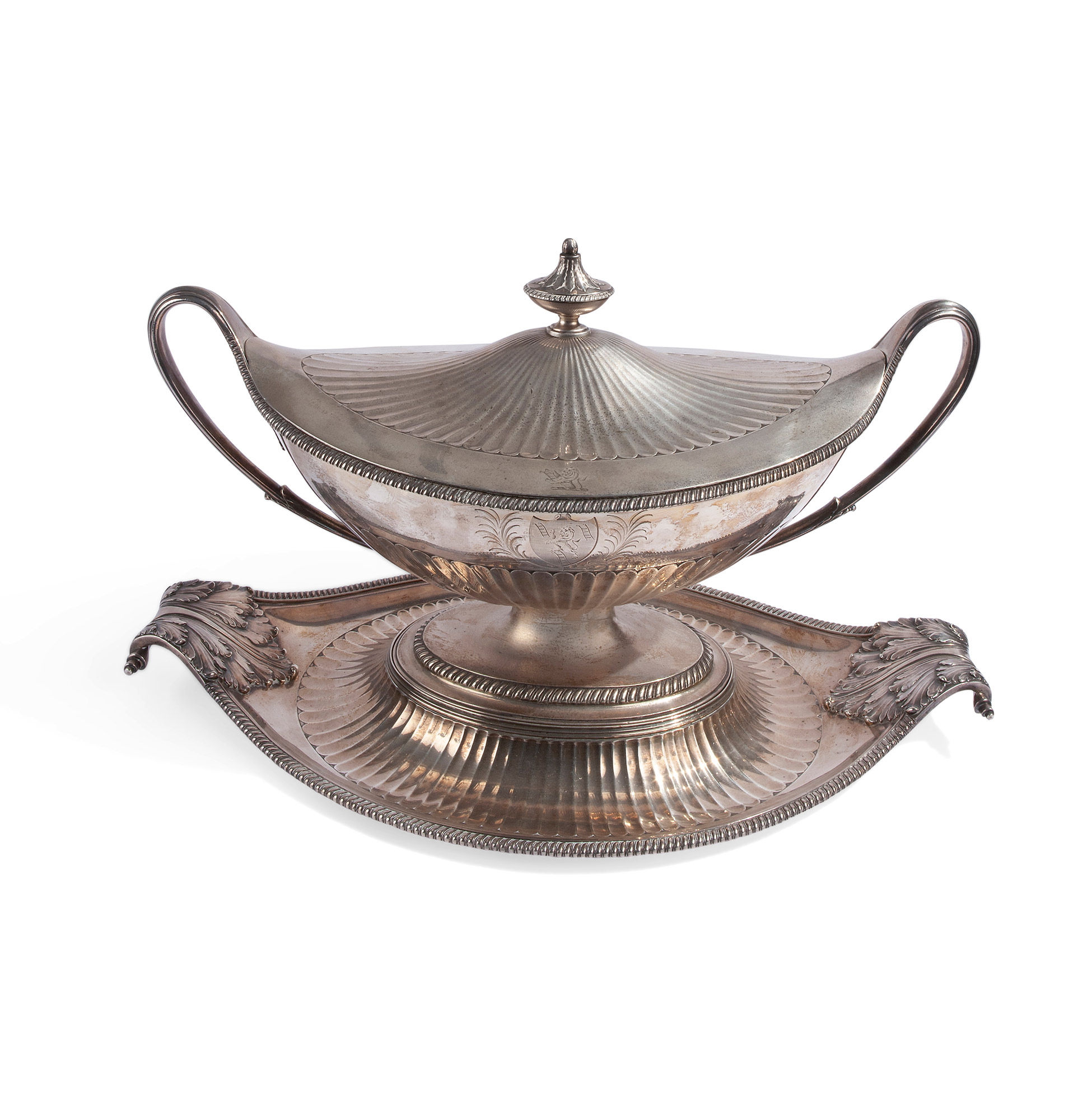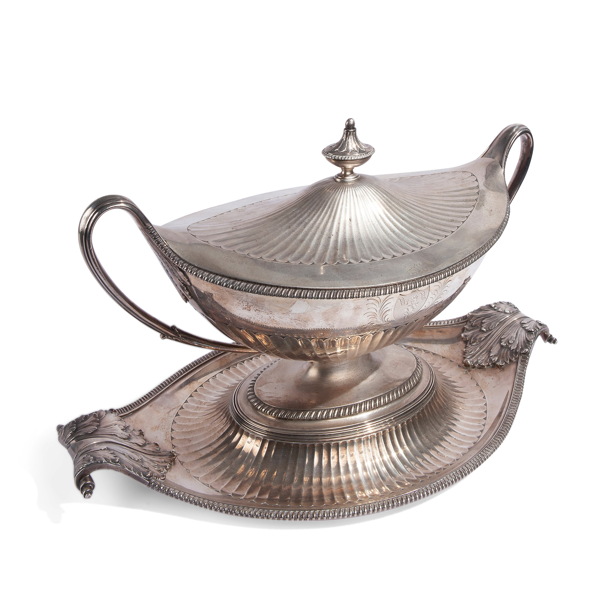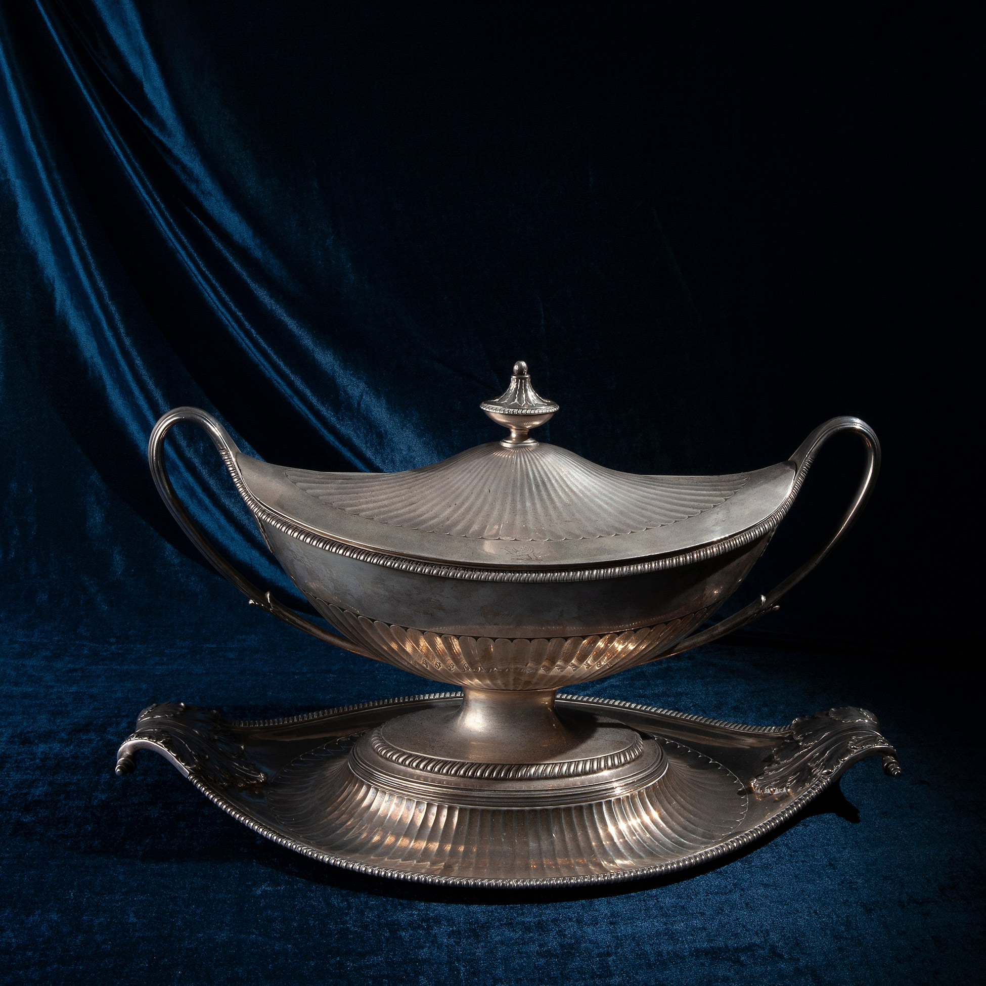 Zuppiera in argento con présentoir, Londra 1804 Manifattura inglese, periodo Giorgio III, opera dei maestri argentieri Smith & Sharp Peso complessivo gr. 6015, 37x51x30 cm.