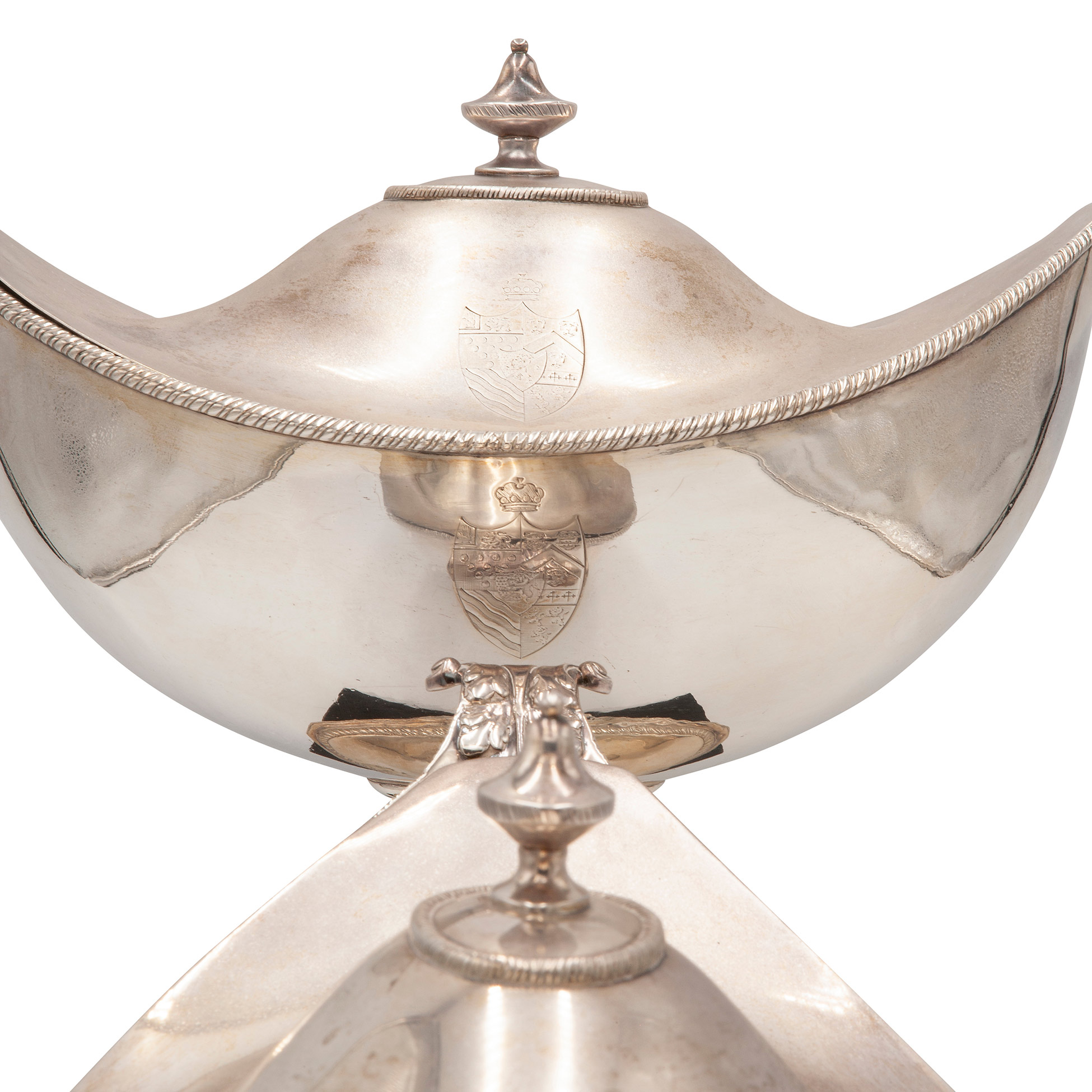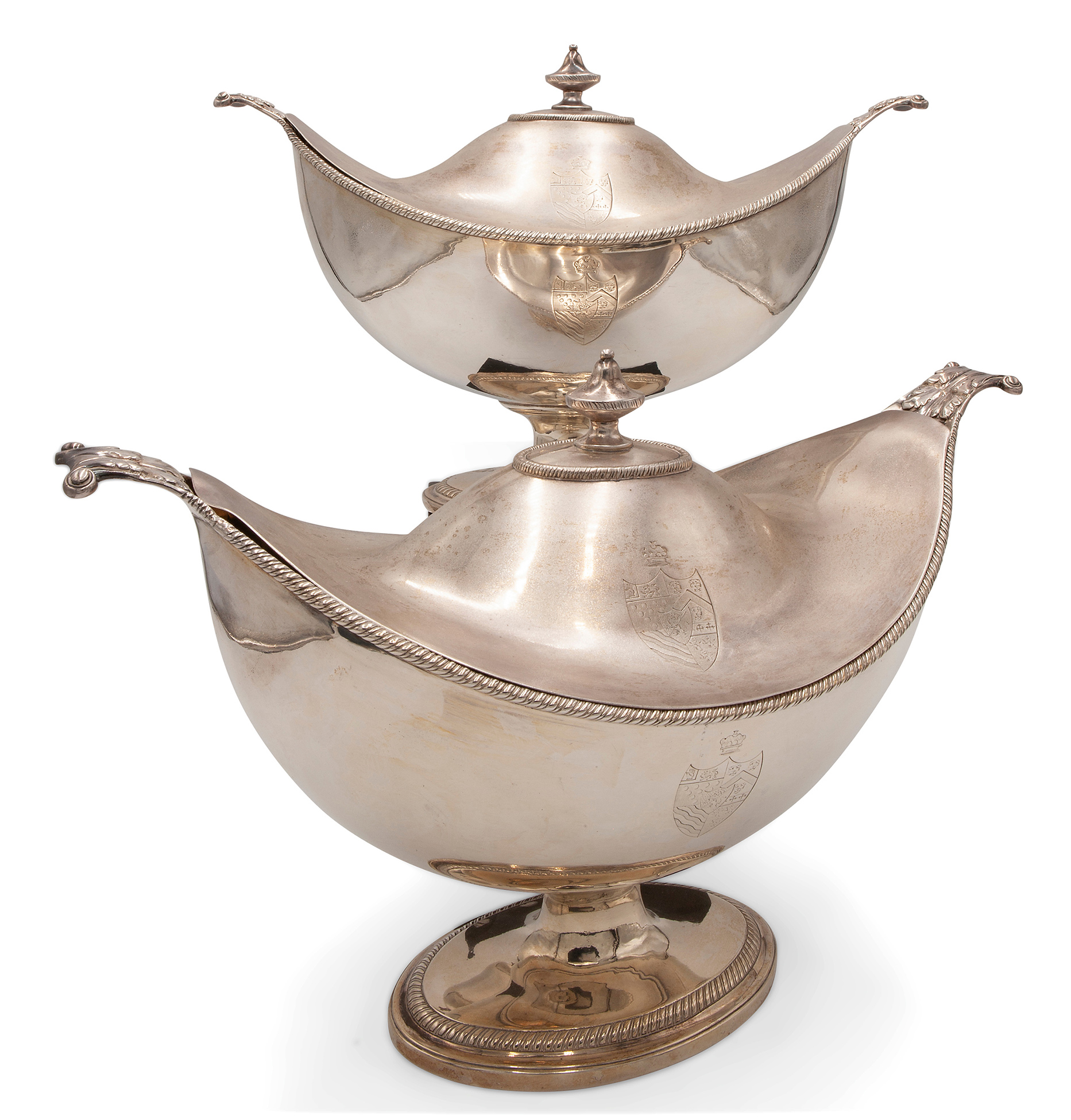 Coppia di zuppiere a barca in argento, Londra 1804 Marchio del maestro argentiere E. Fennell Peso complessivo gr. 3557, 27x37,5x19,5 cm. Cad.