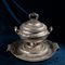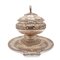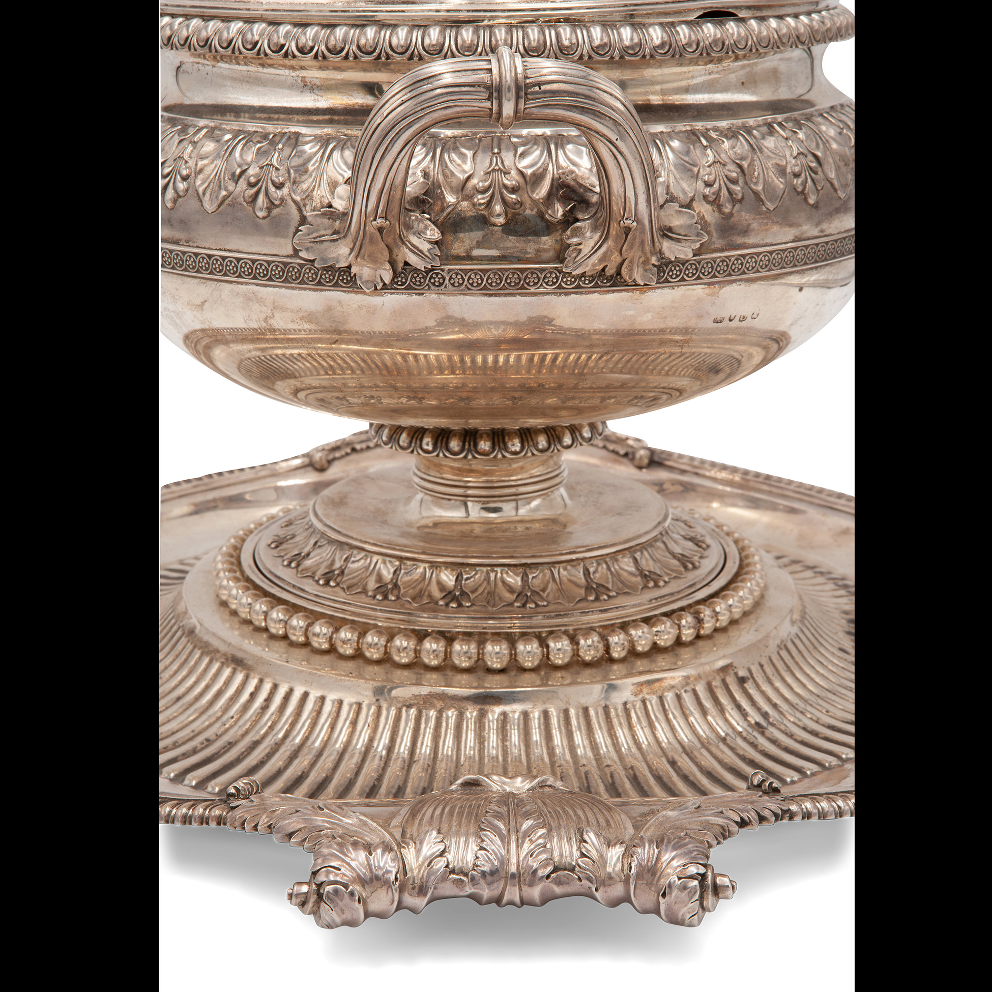 Grande zuppiera in argento con présentoir, Londra 1815 La zuppiera reca il punzone del maestro argentiere B. Smith Peso complessivo gr. 7402, 36x51x43,5 cm.