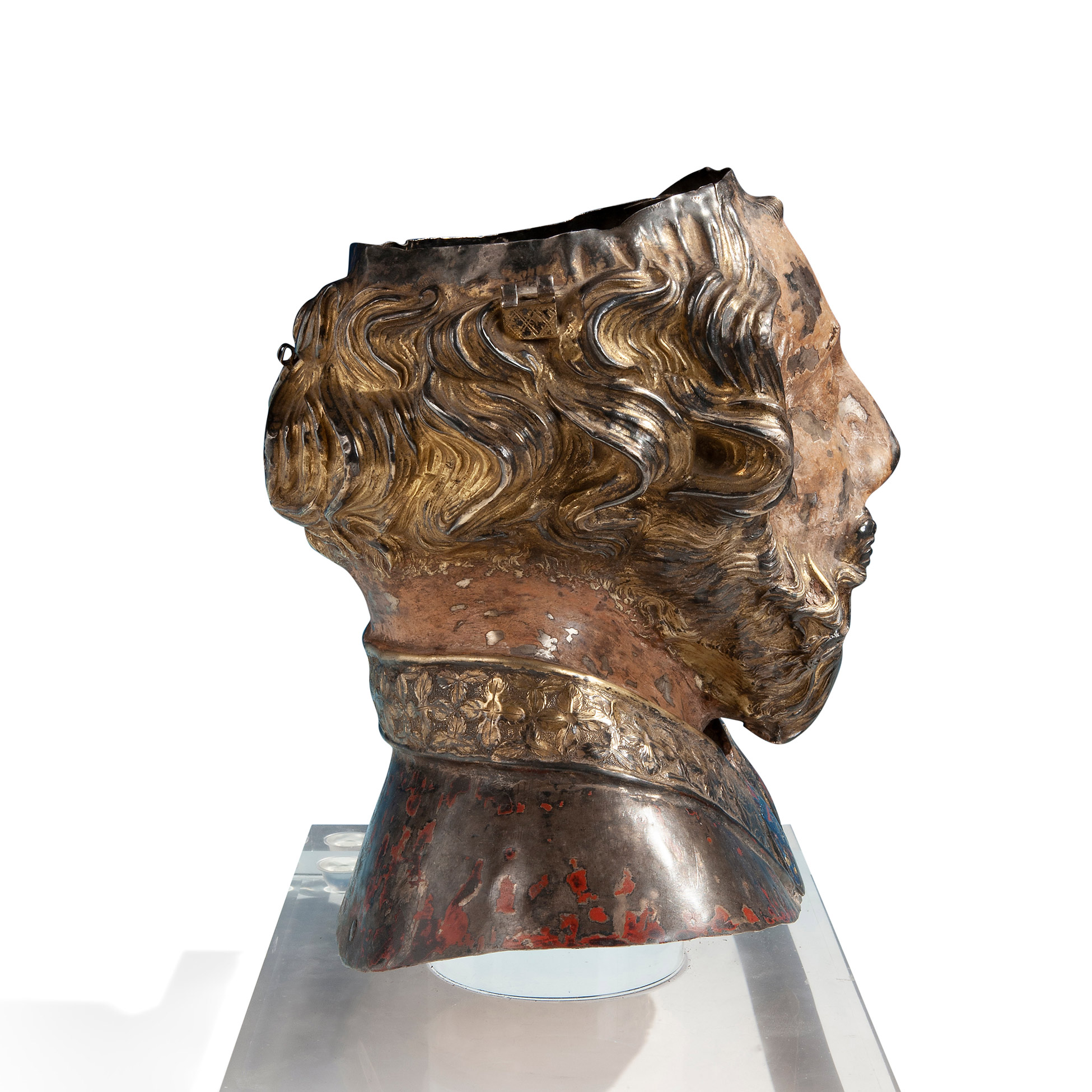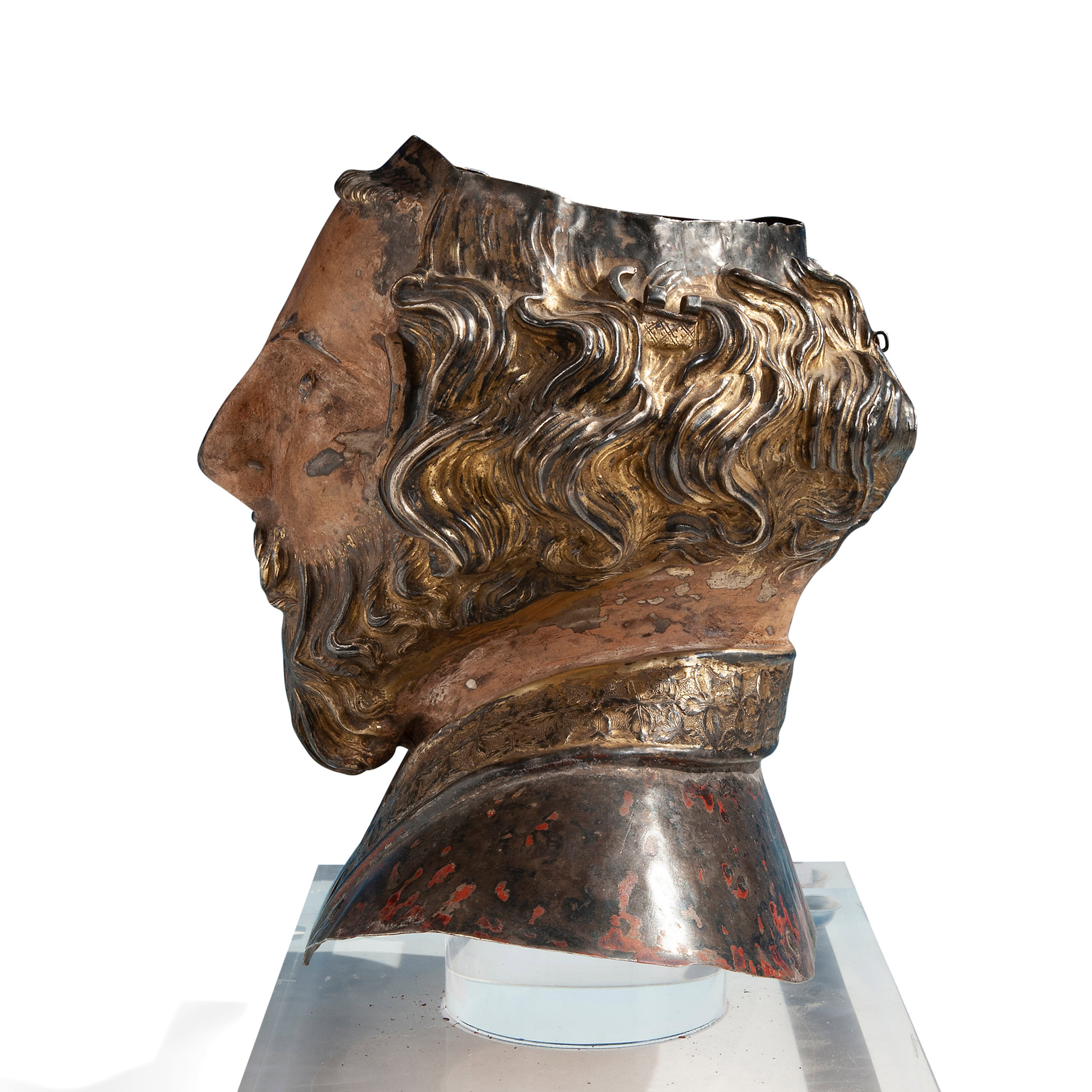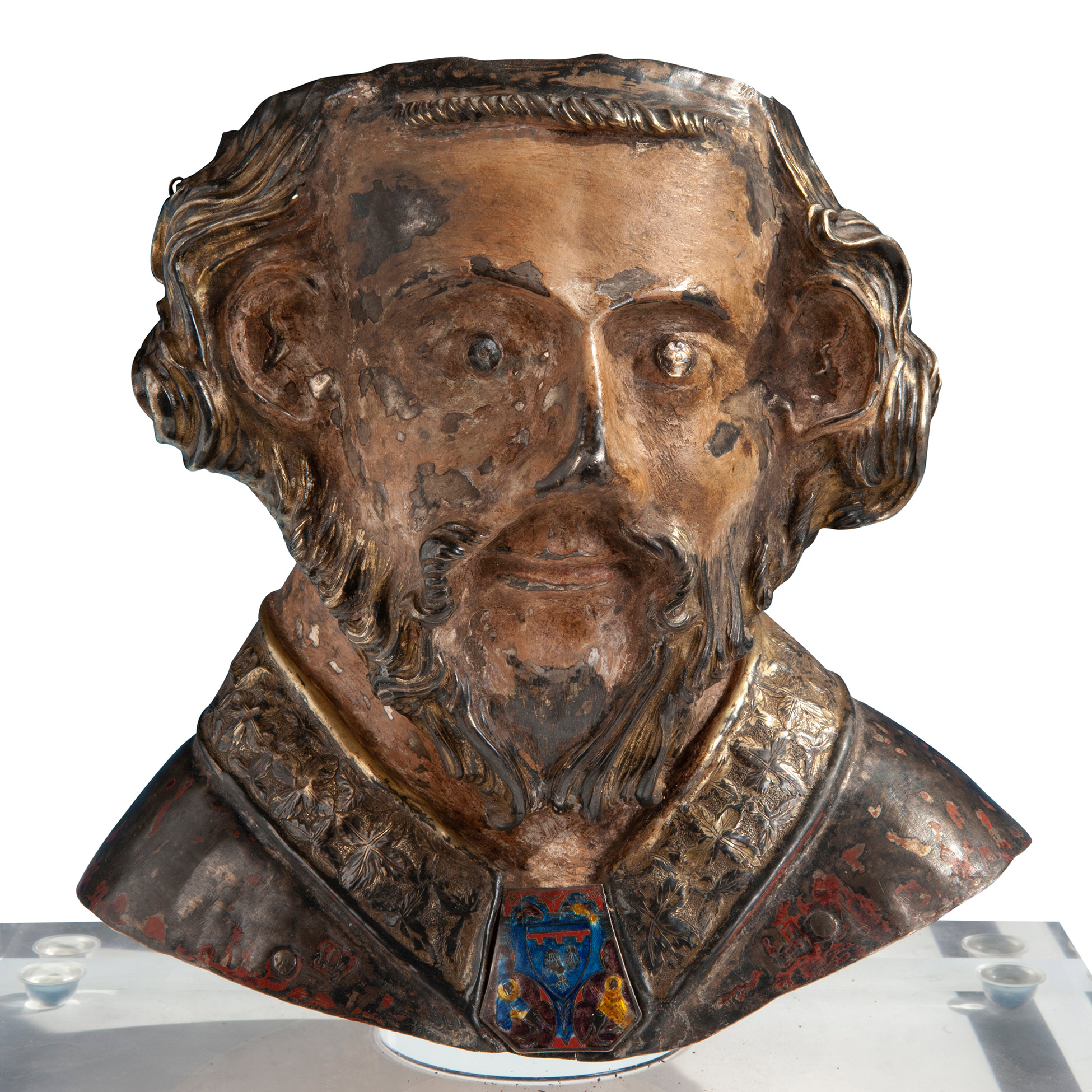 Busto reliquiario raffigurante la testa di San Policarpo in argento sbalzato, parzialmente dorato, con parti smaltate e dipinte
