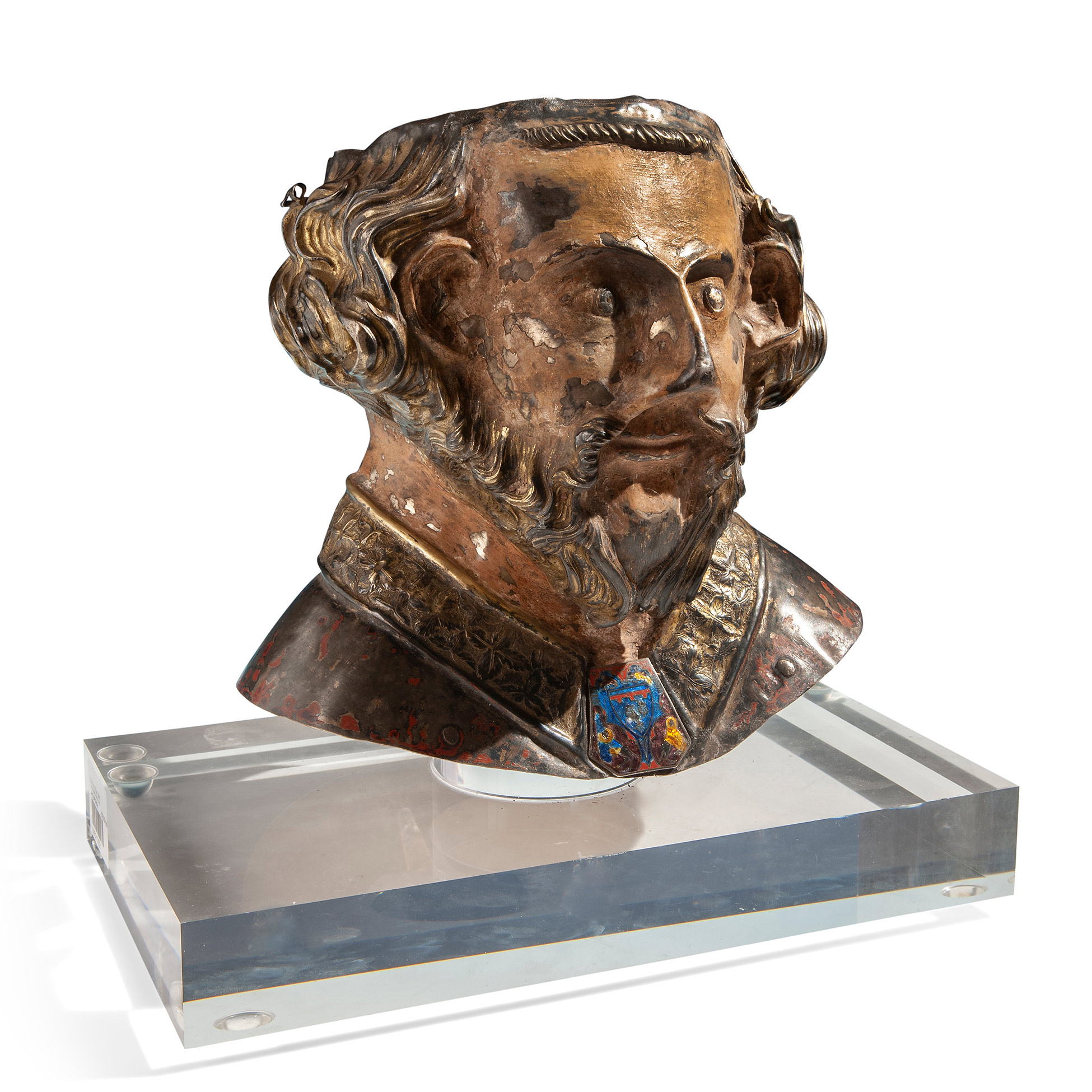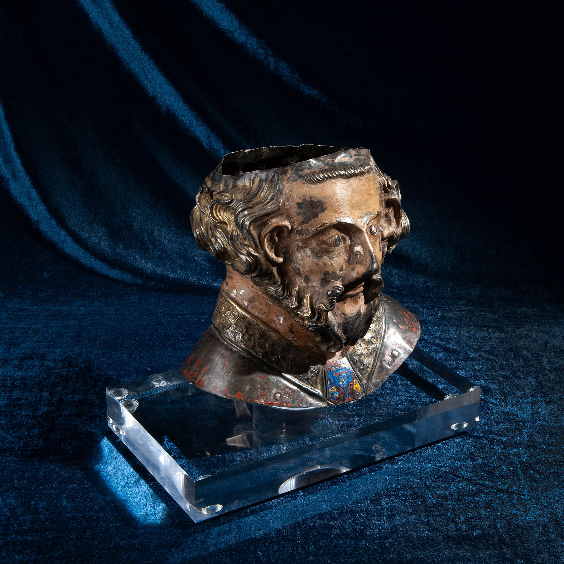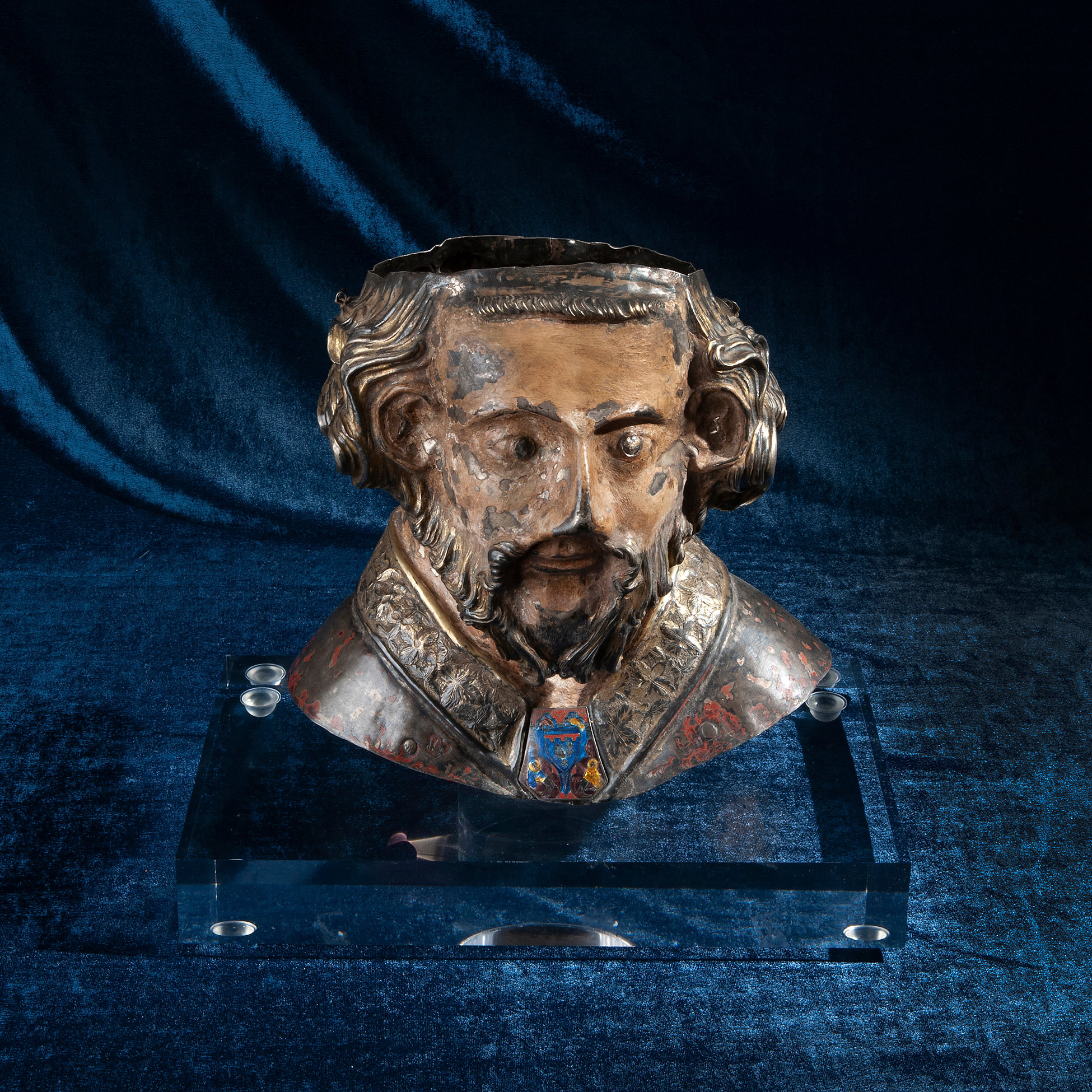 Busto reliquiario raffigurante la testa di San Policarpo in argento sbalzato, parzialmente dorato, con parti smaltate e dipinte