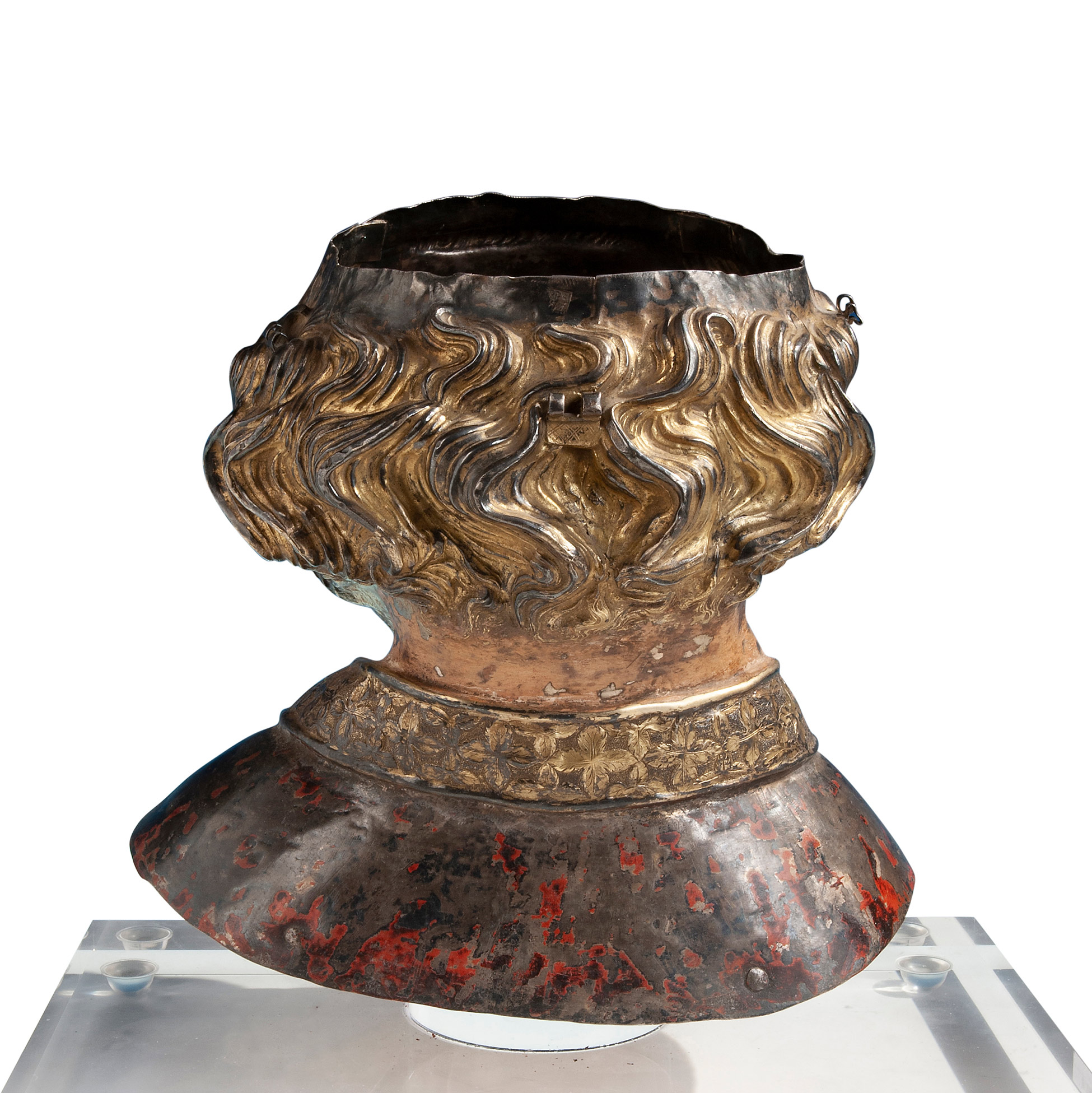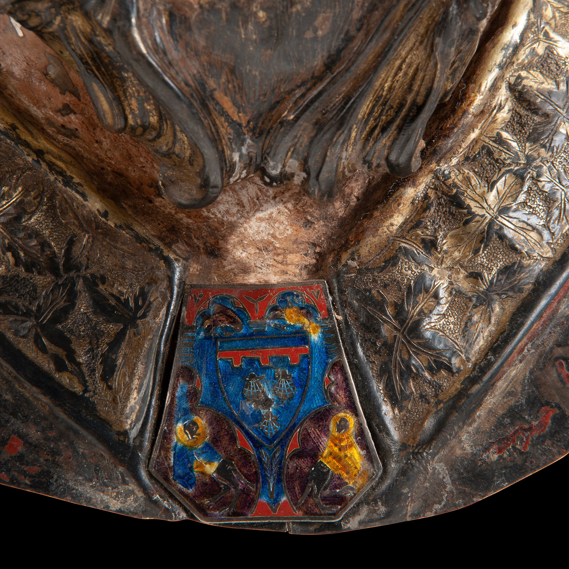 Busto reliquiario raffigurante la testa di San Policarpo in argento sbalzato, parzialmente dorato, con parti smaltate e dipinte Presenza di uno stemma nobiliare di cui non si è riusciti ad indentificare l’appartenenza, forse una confraternita. Reca punz