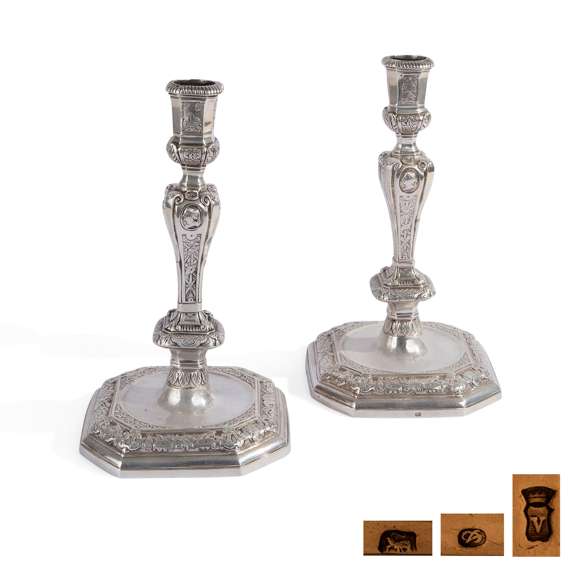 Coppia di candelieri cesellati in argento fuso, XVIII secolo I manufatti recano punzioni di importazione olandese, dopo il 1814. Probabile origine belga, della citta di Mons Peso complessivo gr. 1210, 23x13x13 cm. Cad.