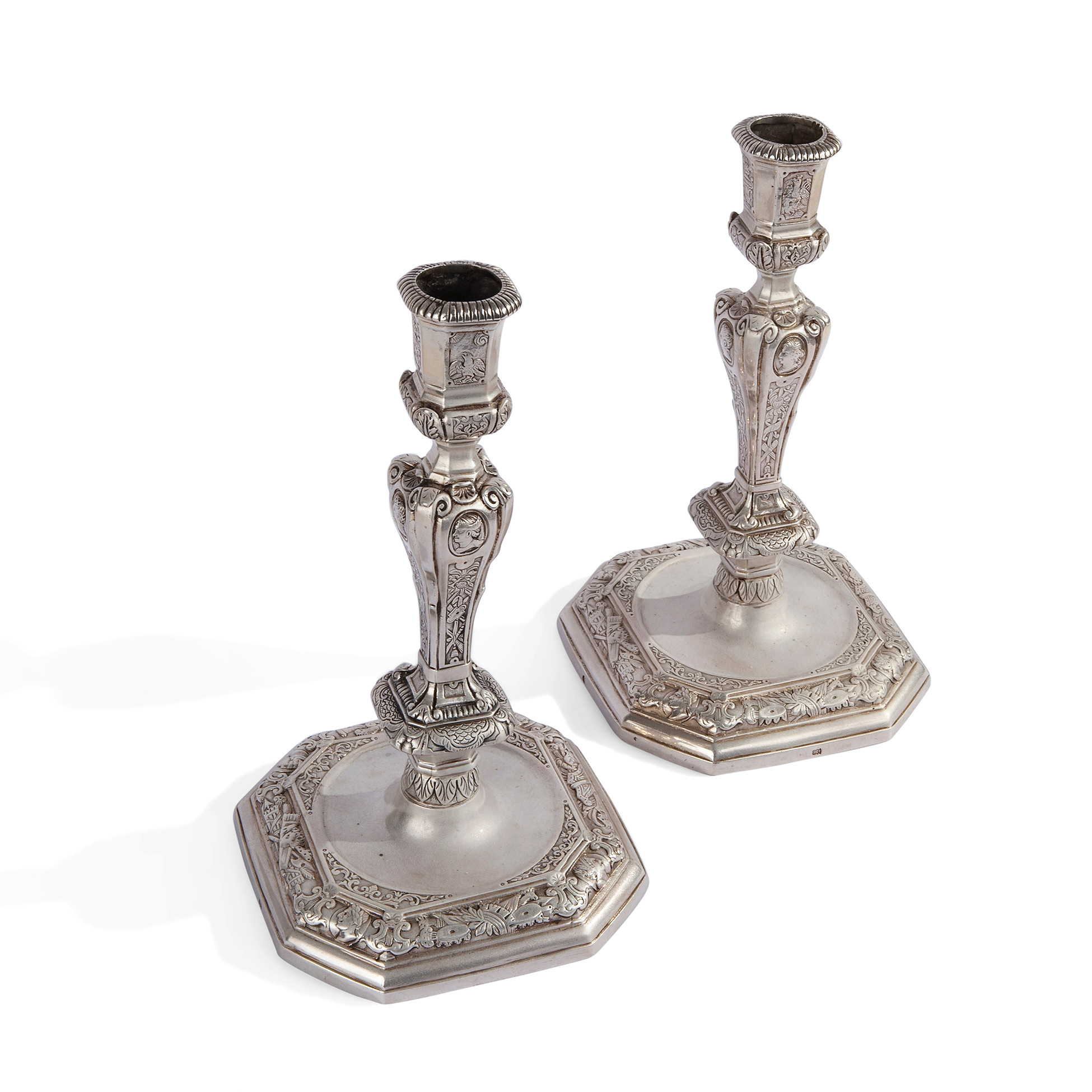 Coppia di candelieri cesellati in argento fuso, XVIII secolo