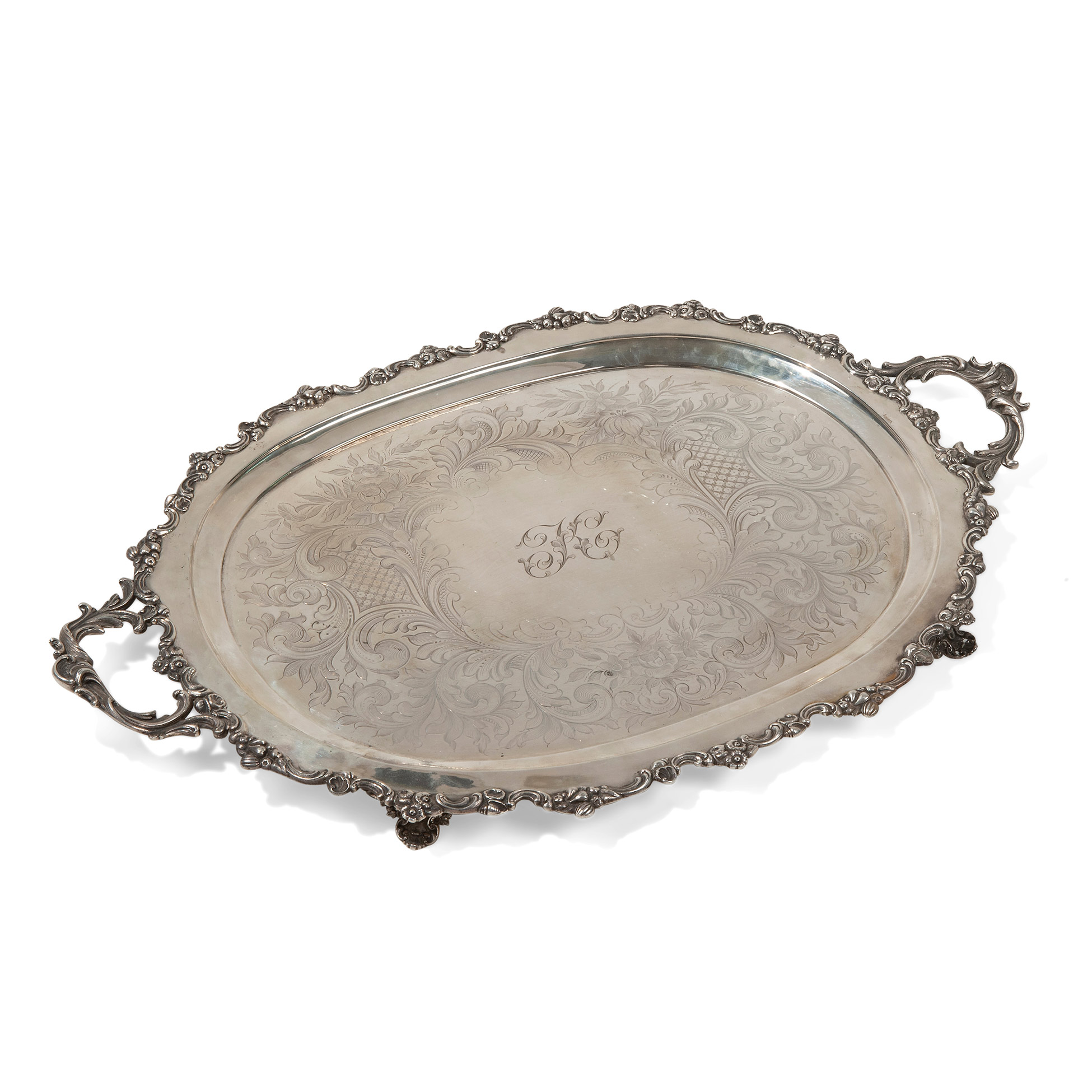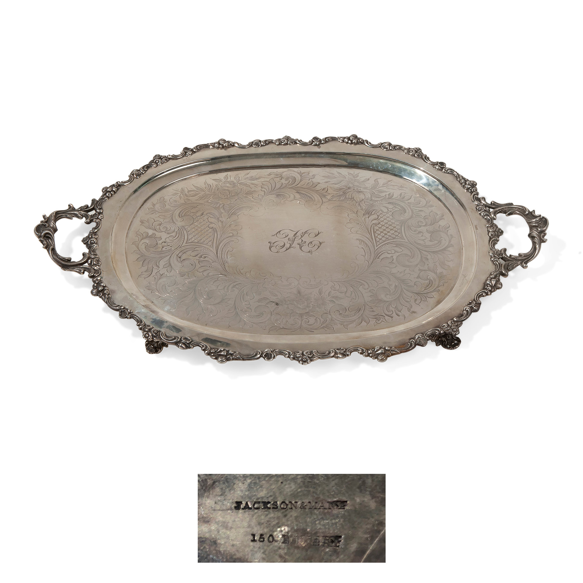 Vassoio in argento, metà del XIX secolo Di forma ovale, centrale inciso a bulino, cornice e manici applicati. Jackson and Many 160 Bowery Peso complessivo gr. 3327, 5x78x50 cm.