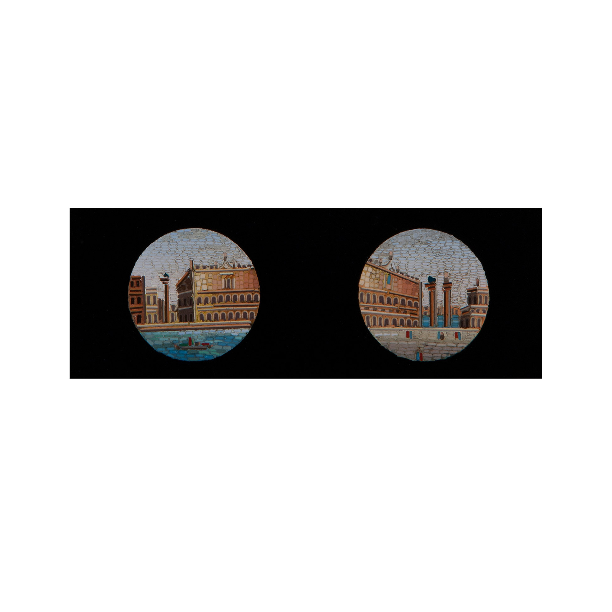 Scatola in bronzo dorato con micromosaici, 1850 ca. Manifattura della RFSP, decorazioni a motivi vegetali e vedute raffiguranti la città di Venezia Dimensioni 8x14x10,5 cm.