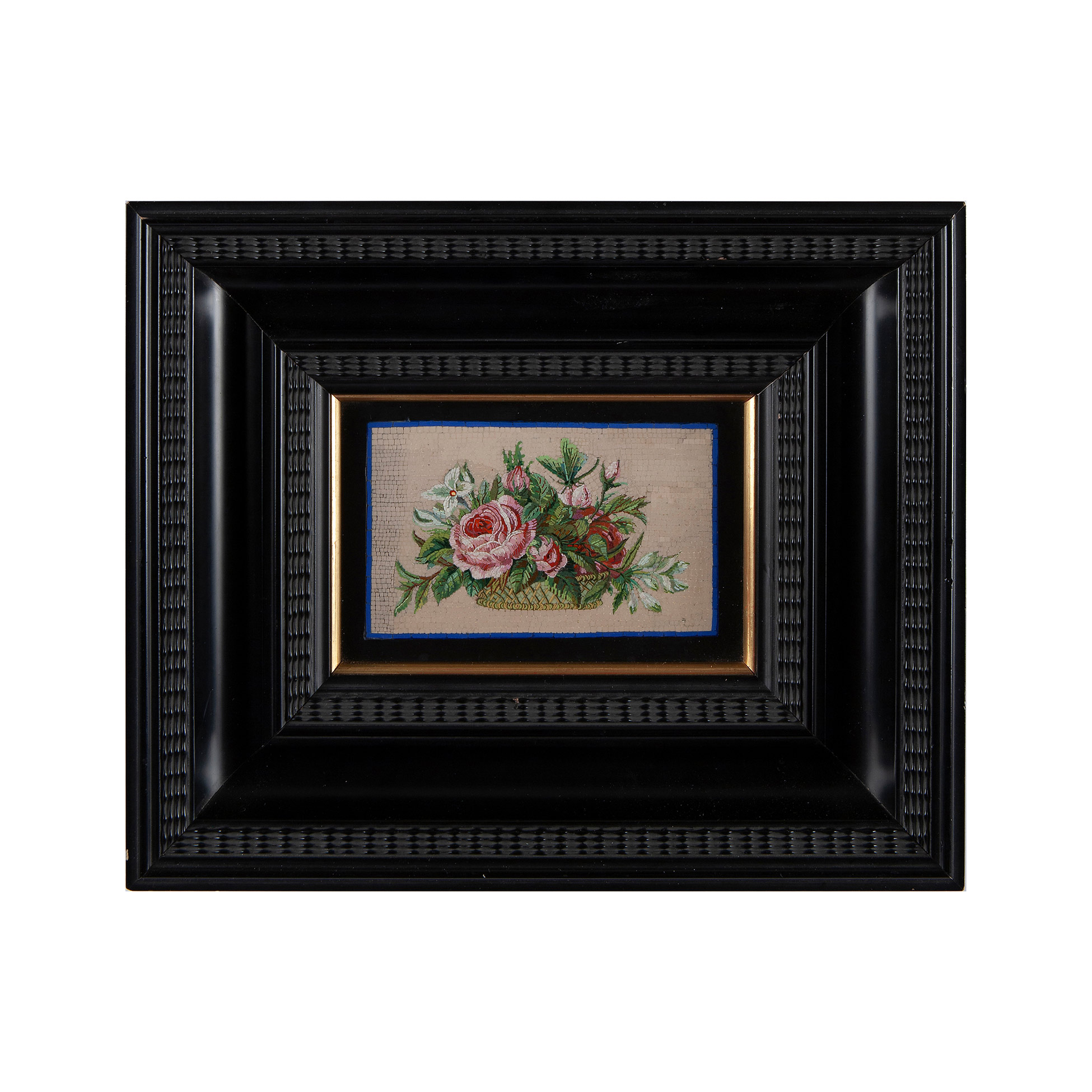 Placca in micromosaico, metà del XIX secolo Manifattura della RFSP, l'immagine raffigura una cesta di fiori Dimensioni est. 23,5x28,5, int. 11,5x16,5 cm.