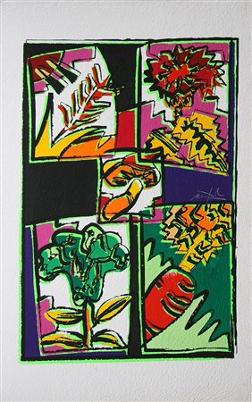 Ugo Nespolo olio su carta 110x74 Frutta Autentica dell'artista su foto