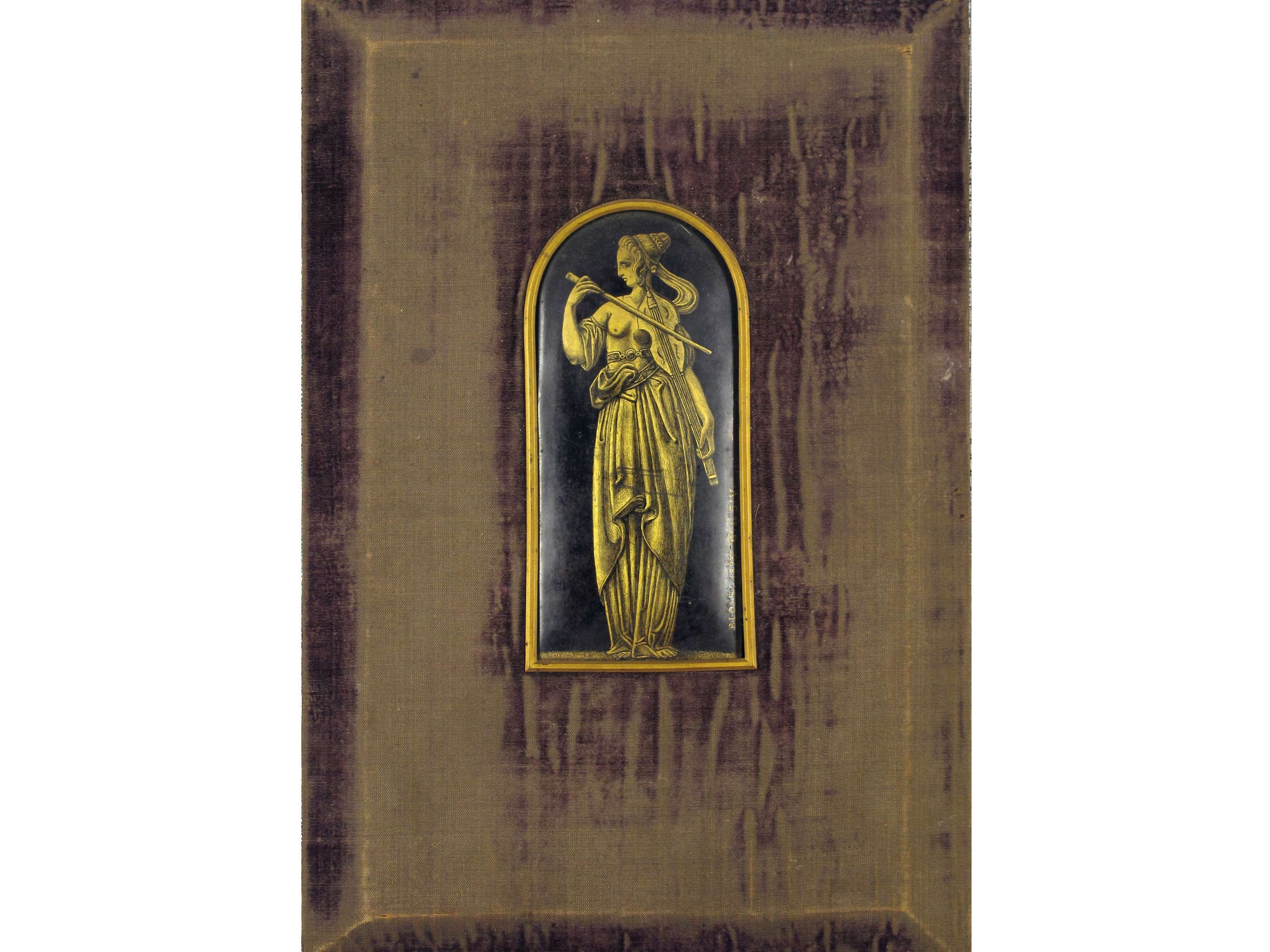 Francia (XIX secolo) Allegoria della Musica Lacca su metallo Misura 13,5x6,2 cm, con pannello 30x20,5 cm