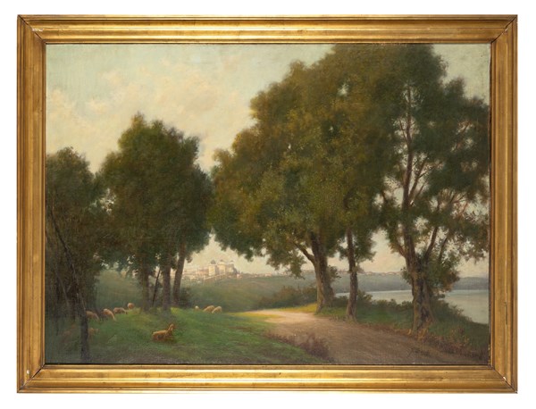 Giovanni Secchi "Paesaggio dell'Emilia con la Rocchetta Mattei sullo sfondo" ol