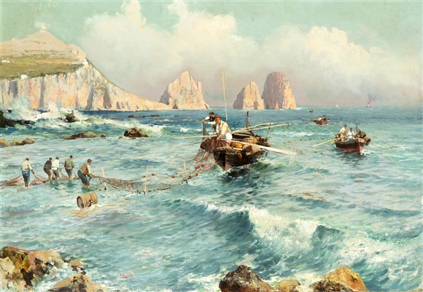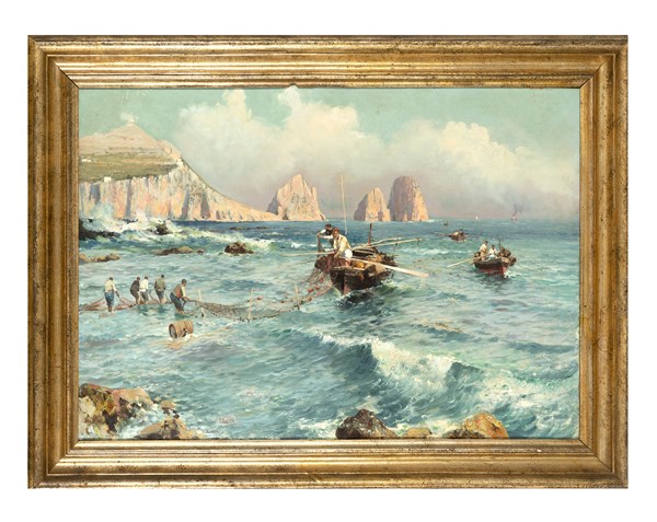 Attilio Pratella "Tirando le reti" olio su tela (cm 44x65) Firmato in basso a s