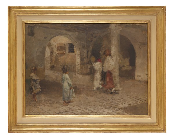Mosè Bianchi "Portico con figure a Chioggia" olio su tavola (cm 46,5x59,5) Firm