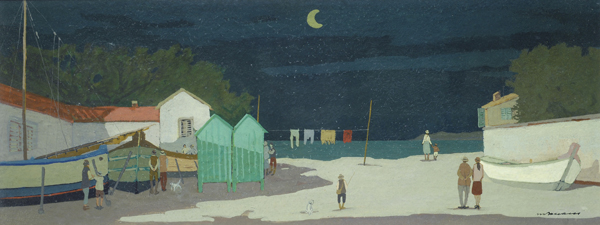 Marcello Boccacci (Firenze, 1914 - 1996) CABINE SULLA SPIAGGIA Encausto su cartone, cm. 20x50 Firma in basso a destra e sul verso.