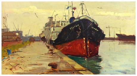 RENZO GUIDUGLI Livorno 1935 Navi all’ormeggio, Livorno Olio su tavola 18 x 33,5. Firma in b. a s.; sul verso firma, titolo e località.