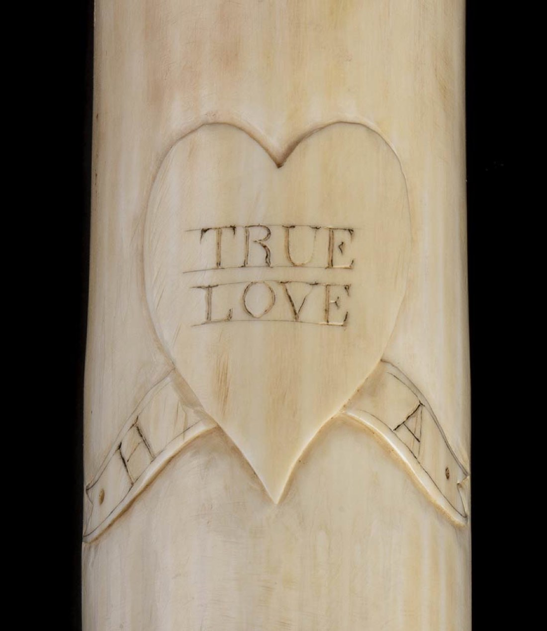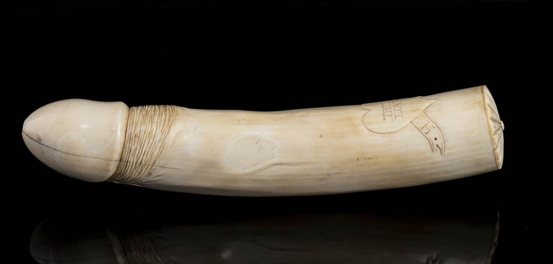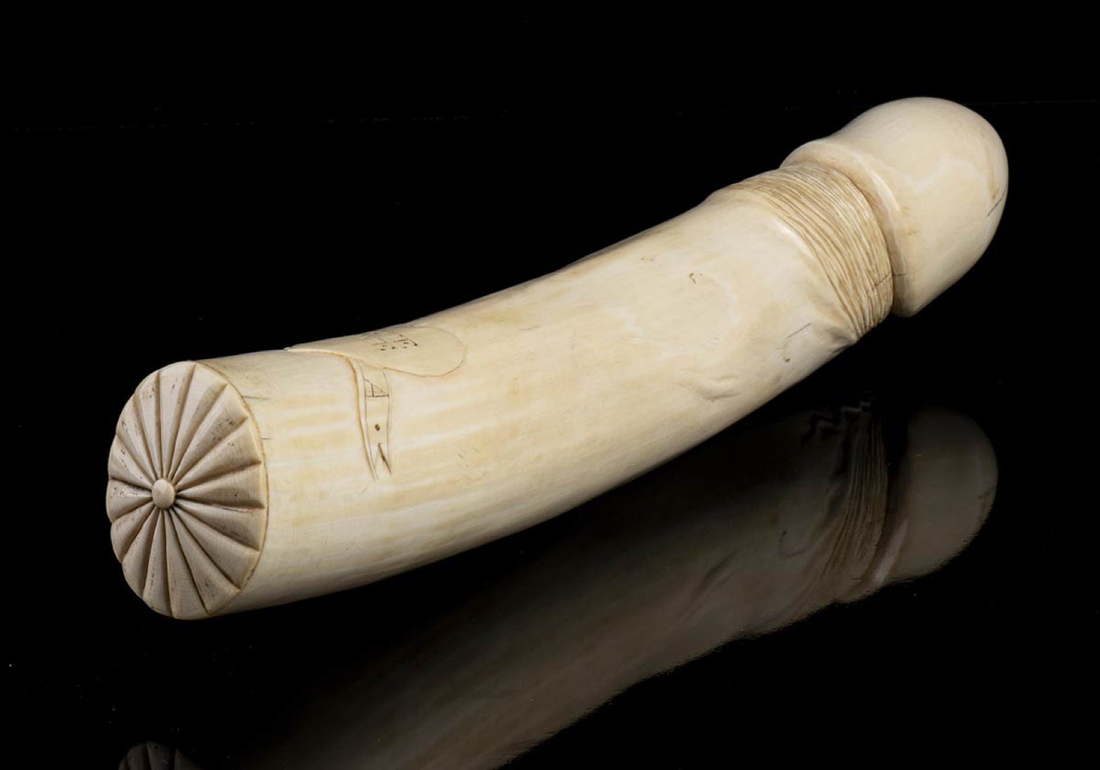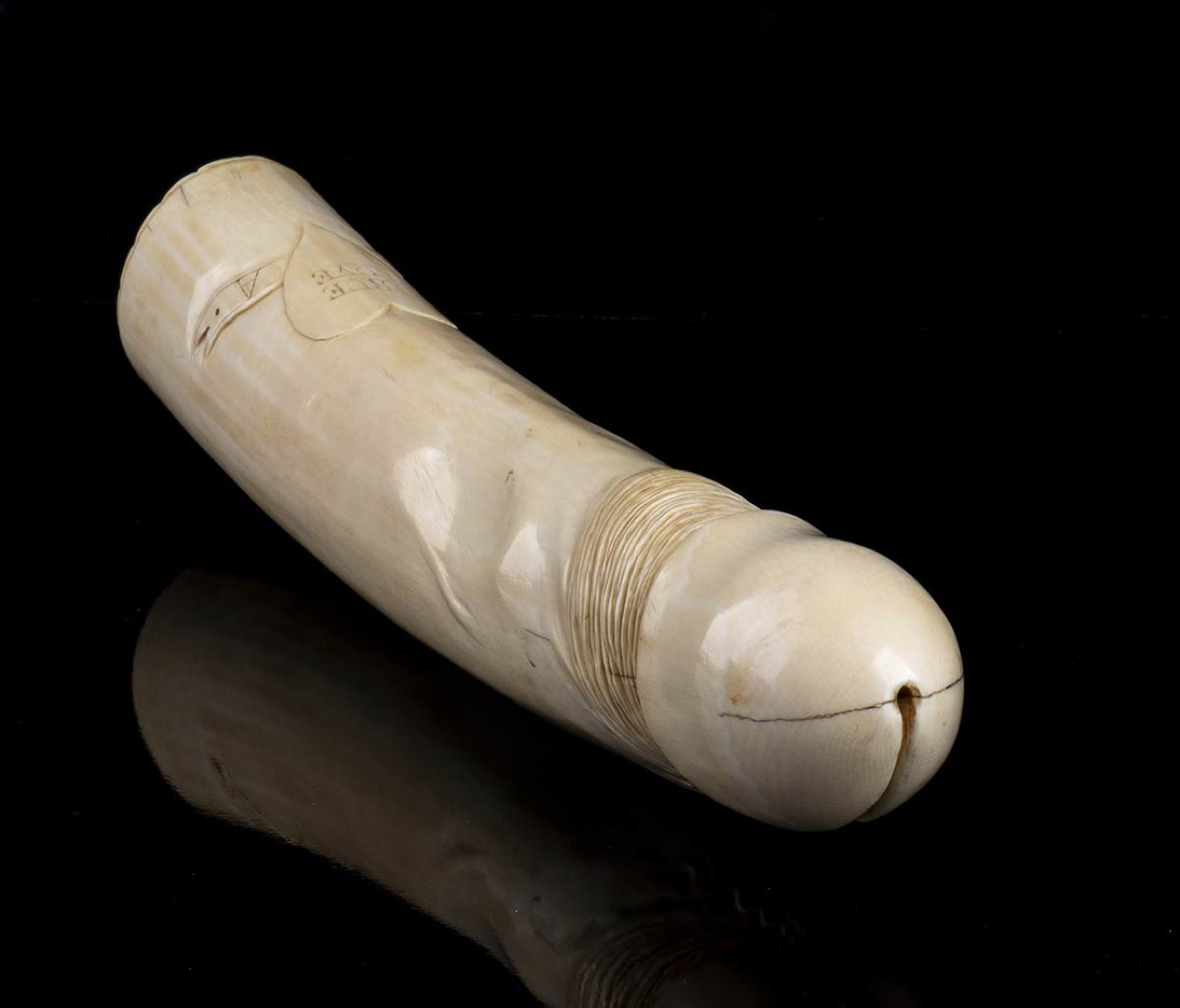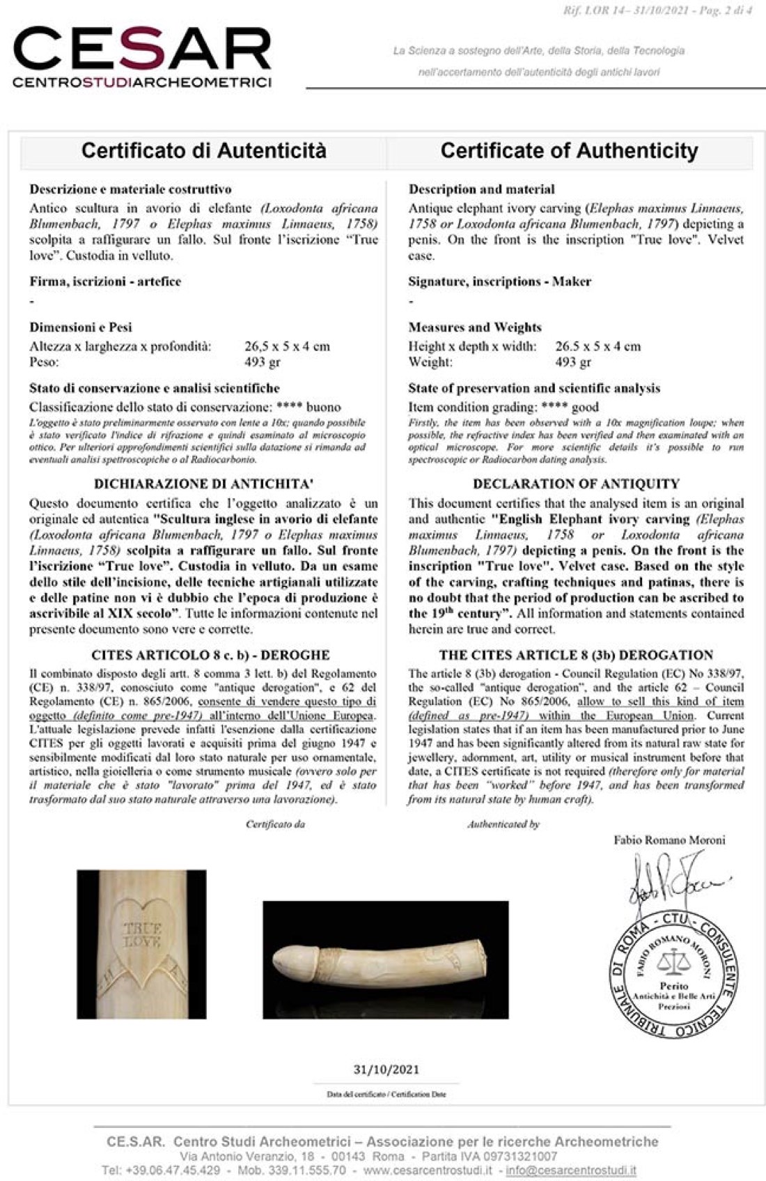 in avorio di elefante (Loxodonta africana Blumenbach, 1797 o Elephas maximus Linnaeus, 1758) scolpita a raffigurare un fallo. Sul fronte l’iscrizione “True love”. Custodia in velluto.
