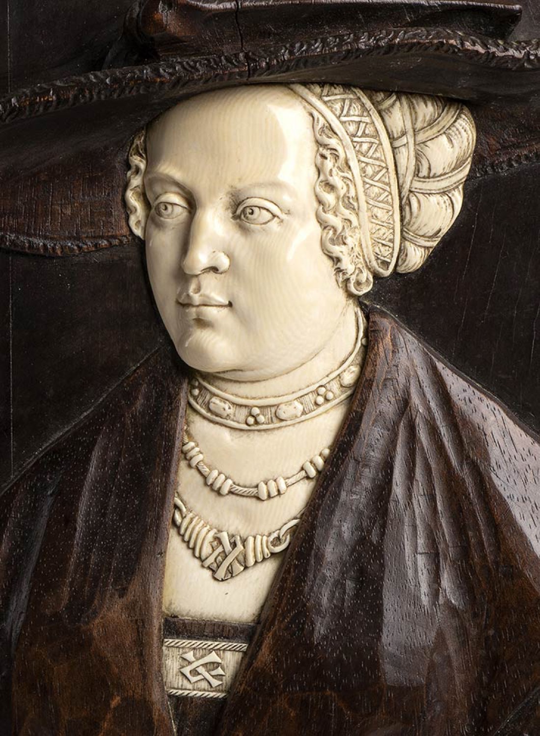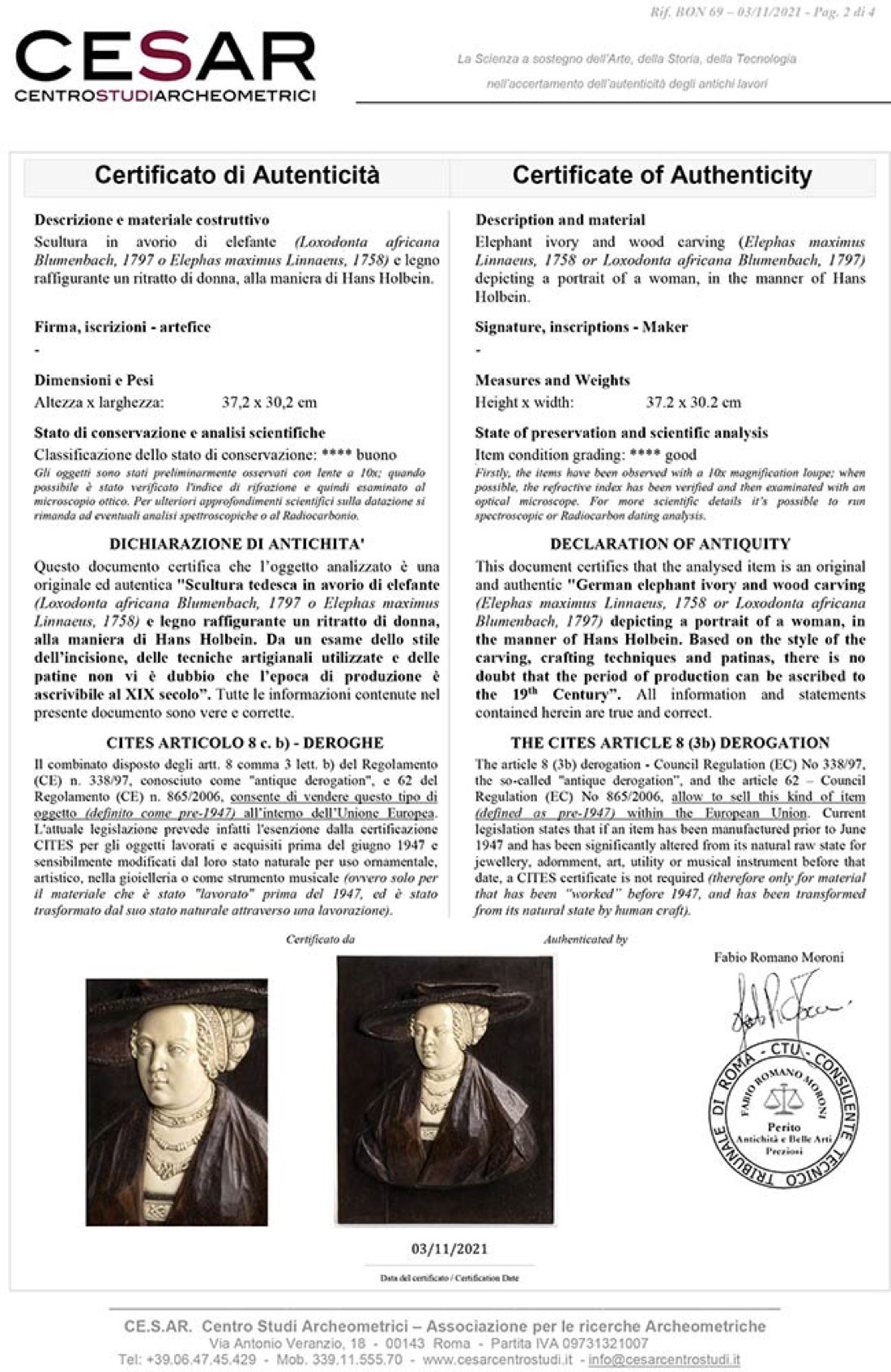 in avorio di elefante (Loxodonta africana Blumenbach, 1797 o Elephas maximus Linnaeus, 1758) e legno raffigurante un ritratto di donna, alla maniera di Hans Holbein. Altezza x larghezza 37,2 x 30,2 cm. Stato di conservazione: **** buono. Accompagnato da certificato di autenticità Ce.S.Ar. Centro Studi Archeometrici (pre-1947).