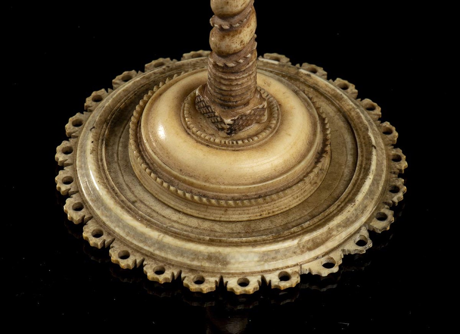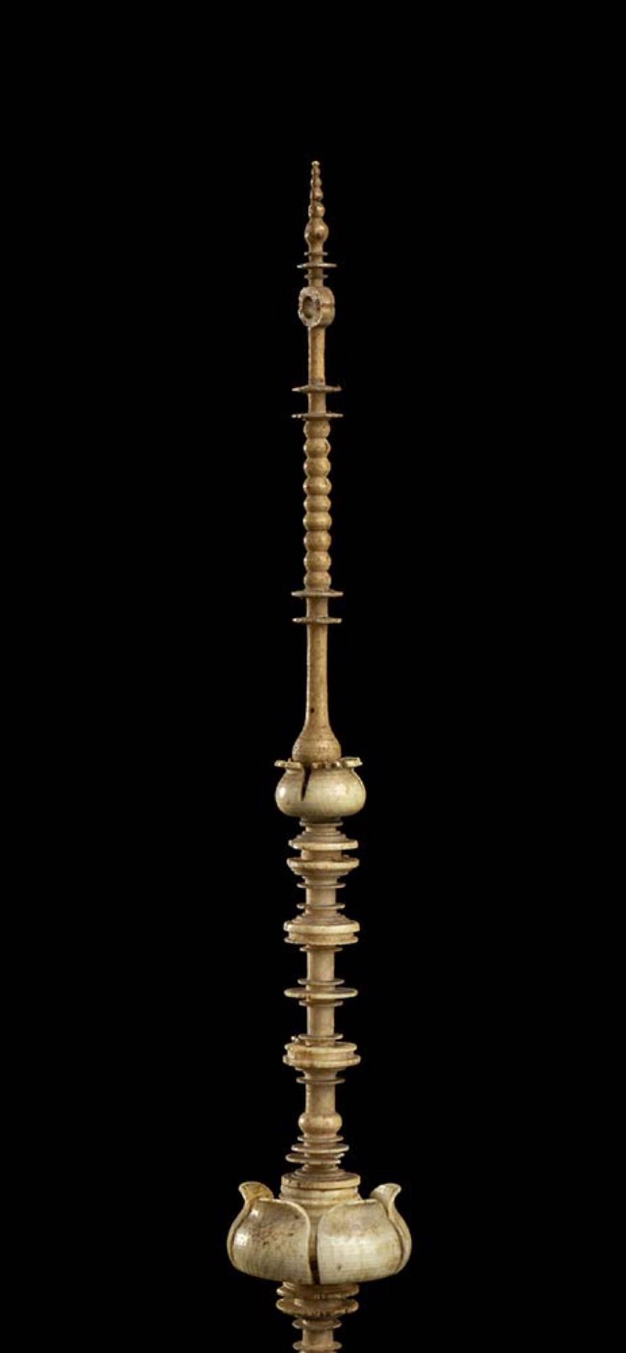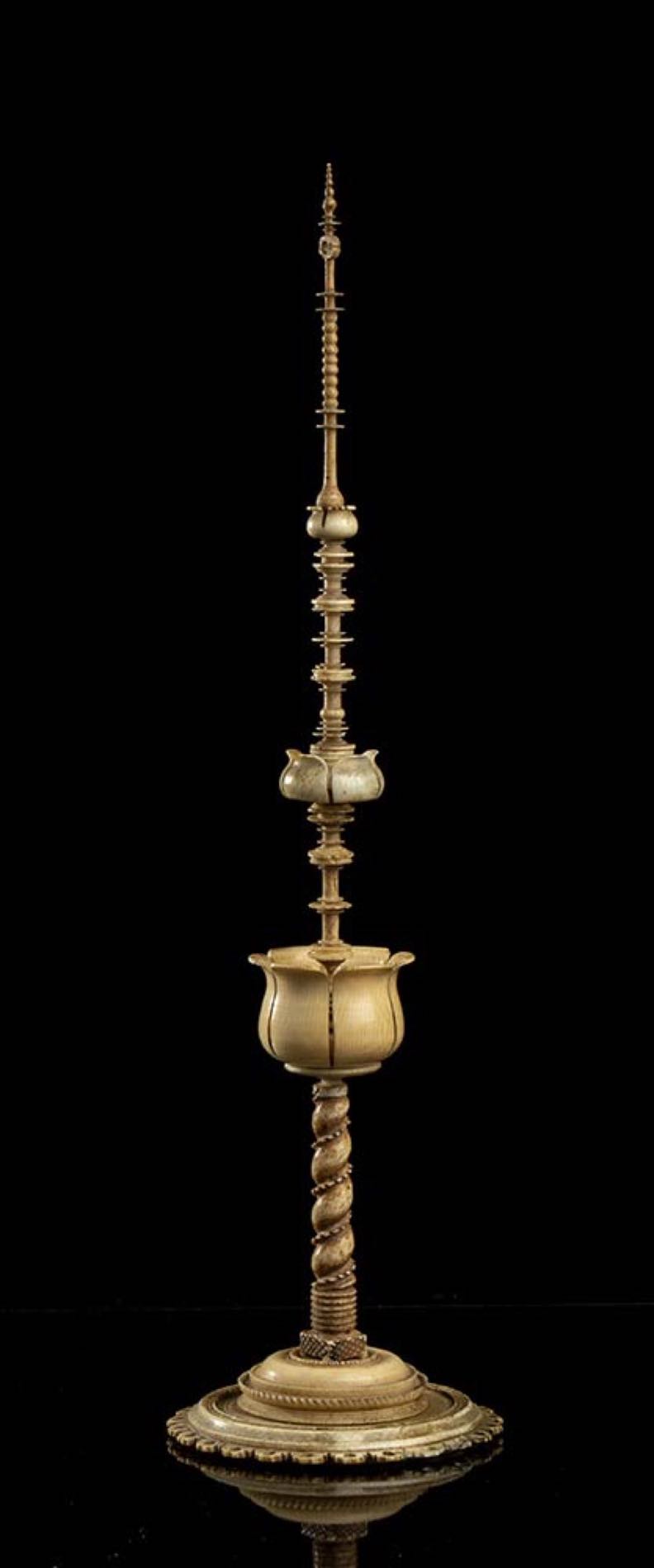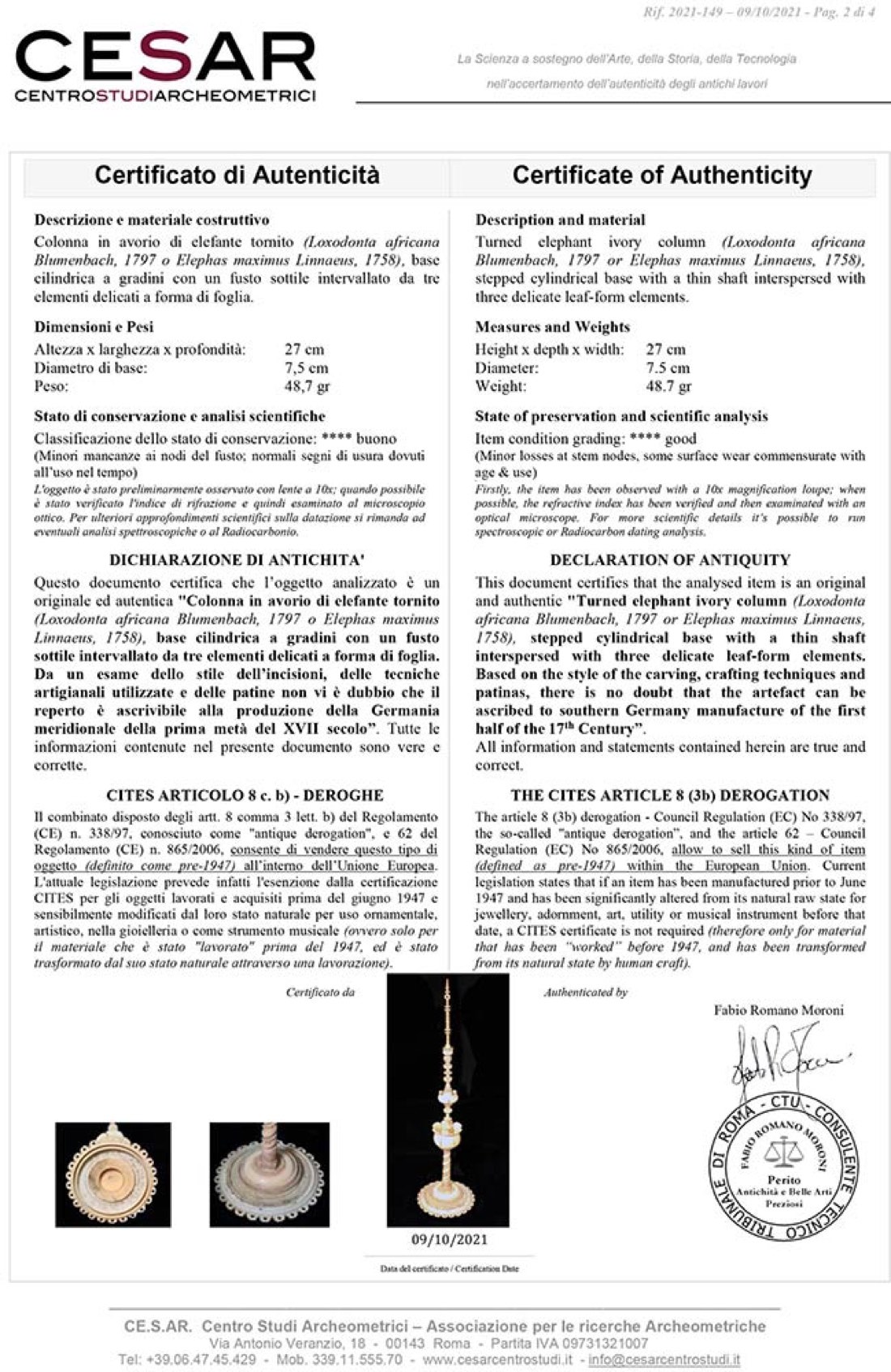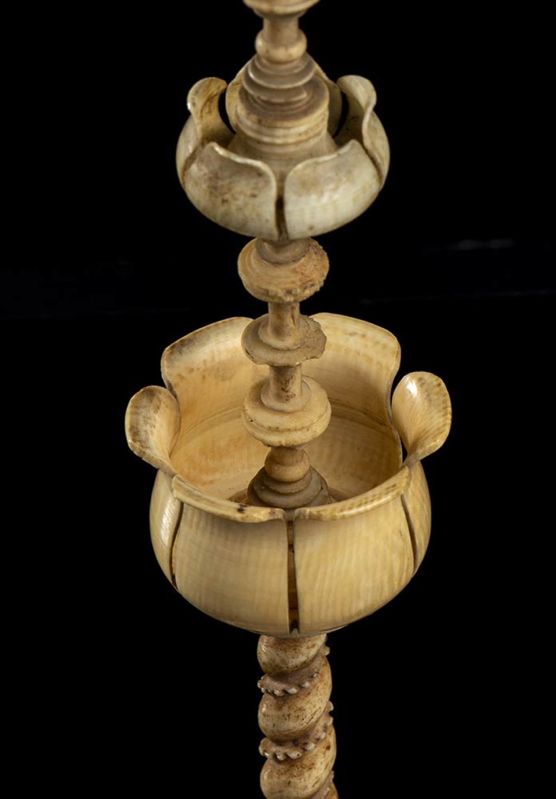 in avorio di elefante tornito (Loxodonta africana Blumenbach, 1797 o Elephas maximus Linnaeus, 1758), base cilindrica a gradini con un fusto sottile intervallato da tre elementi delicati a forma di foglia. Altezza 27 cm, diametro base 7,5 cm. Peso 48,7 gr. Stato di conservazione: **** buono (minori mancanze ai nodi del fusto; normali segni di usura dovuti all’uso nel tempo). Accompagnato da certificato di autenticità Ce.S.Ar. Centro Studi Archeometrici (pre-1947).