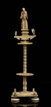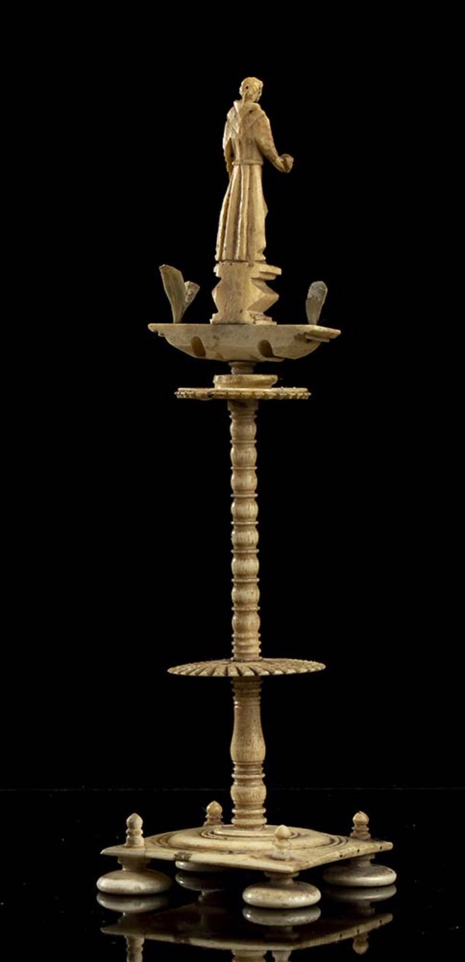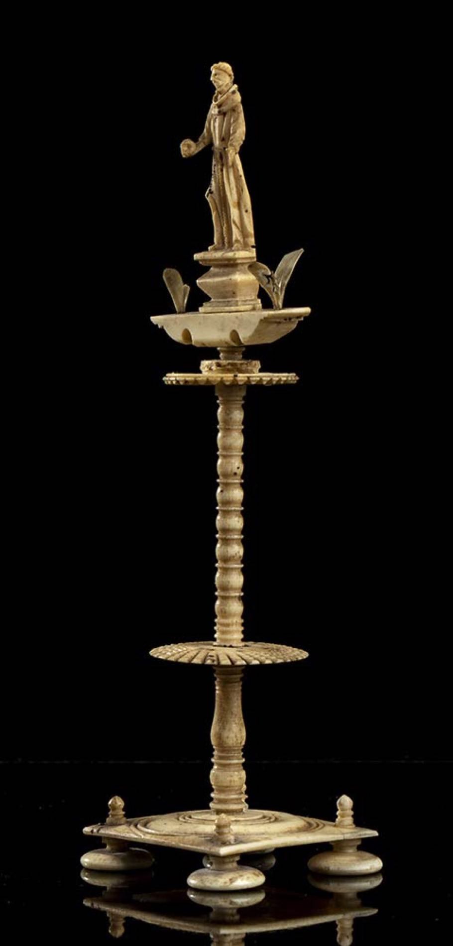 in avorio di elefante tornito (Loxodonta africana Blumenbach, 1797 o Elephas maximus Linnaeus, 1758), base quadrata poggiante su quattro piedini e sottile fusto intervallato da elementi sferici; sulla sommità la figura di un santo francescano con rosario. Altezza 15 cm, larghezza 4,5 cm. Peso 24,3 gr. Stato di conservazione: **** buono (minori mancanze; normali segni di usura dovuti all’uso nel tempo). Accompagnato da certificato di autenticità Ce.S.Ar. Centro Studi Archeometrici (pre-1947).