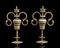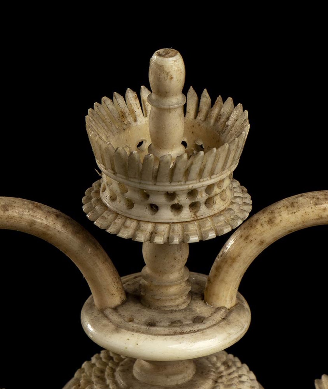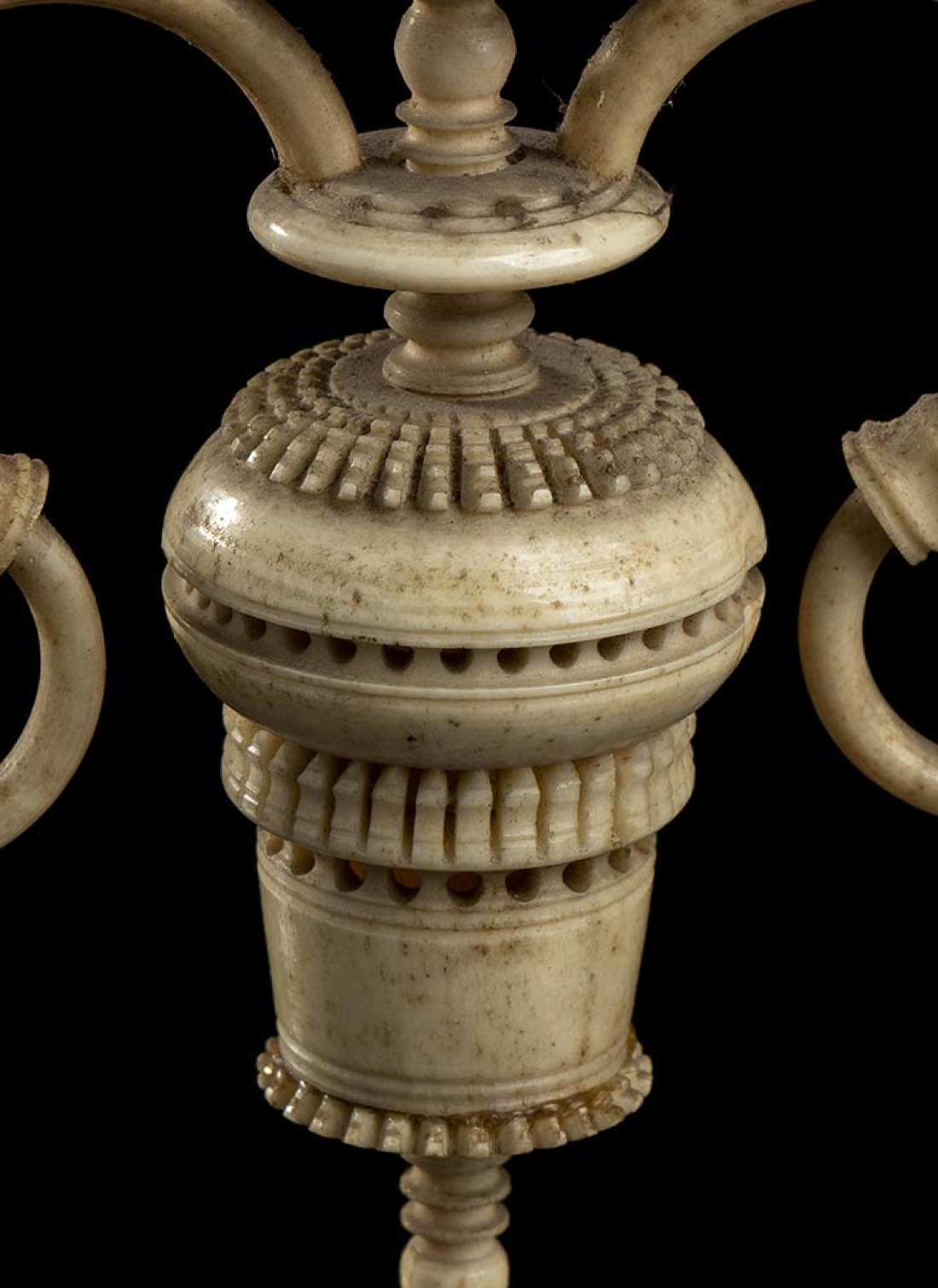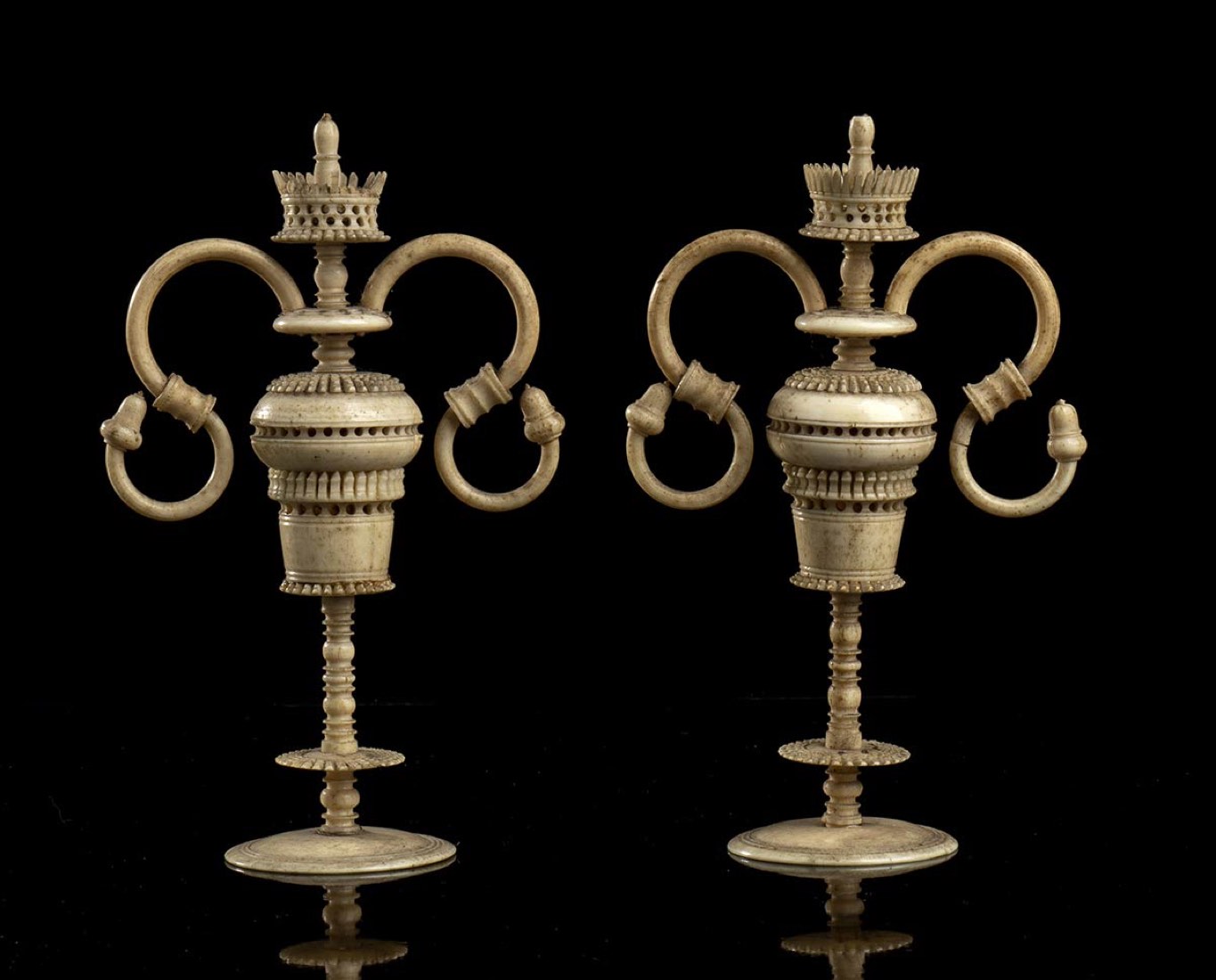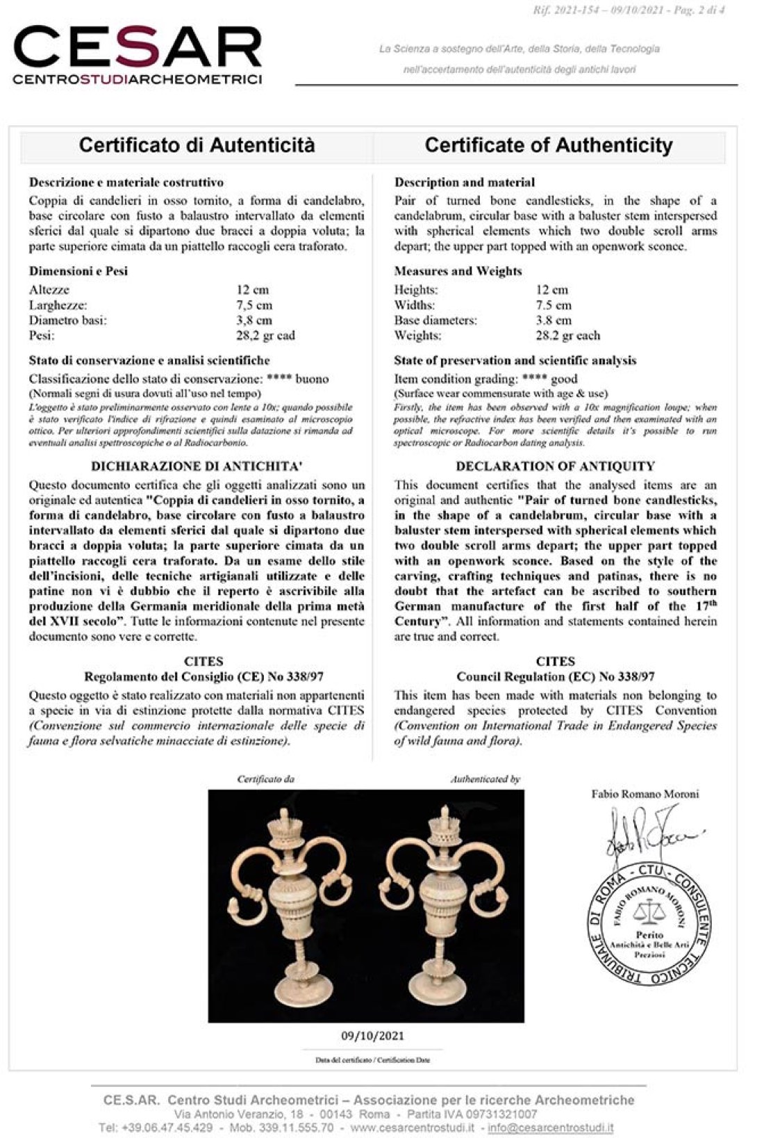 in osso tornito, a forma di candelabro, base circolare con fusto a balaustro intervallato da elementi sferici dal quale si dipartono due bracci a doppia voluta; la parte superiore cimata da un piattello raccogli cera traforato. Altezze 12 cm, larghezze 7,5 cm, diametro basi 3,8 cm. Pesi 28,2 gr cad. Stato di conservazione: **** buono (normali segni di usura dovuti all’uso nel tempo). Accompagnato da certificato di autenticità Ce.S.Ar. Centro Studi Archeometrici.