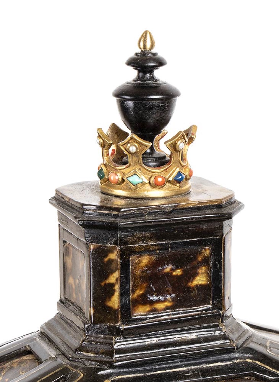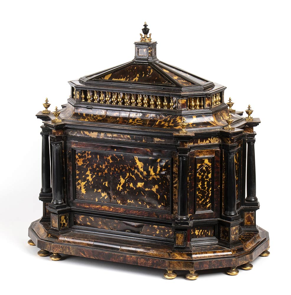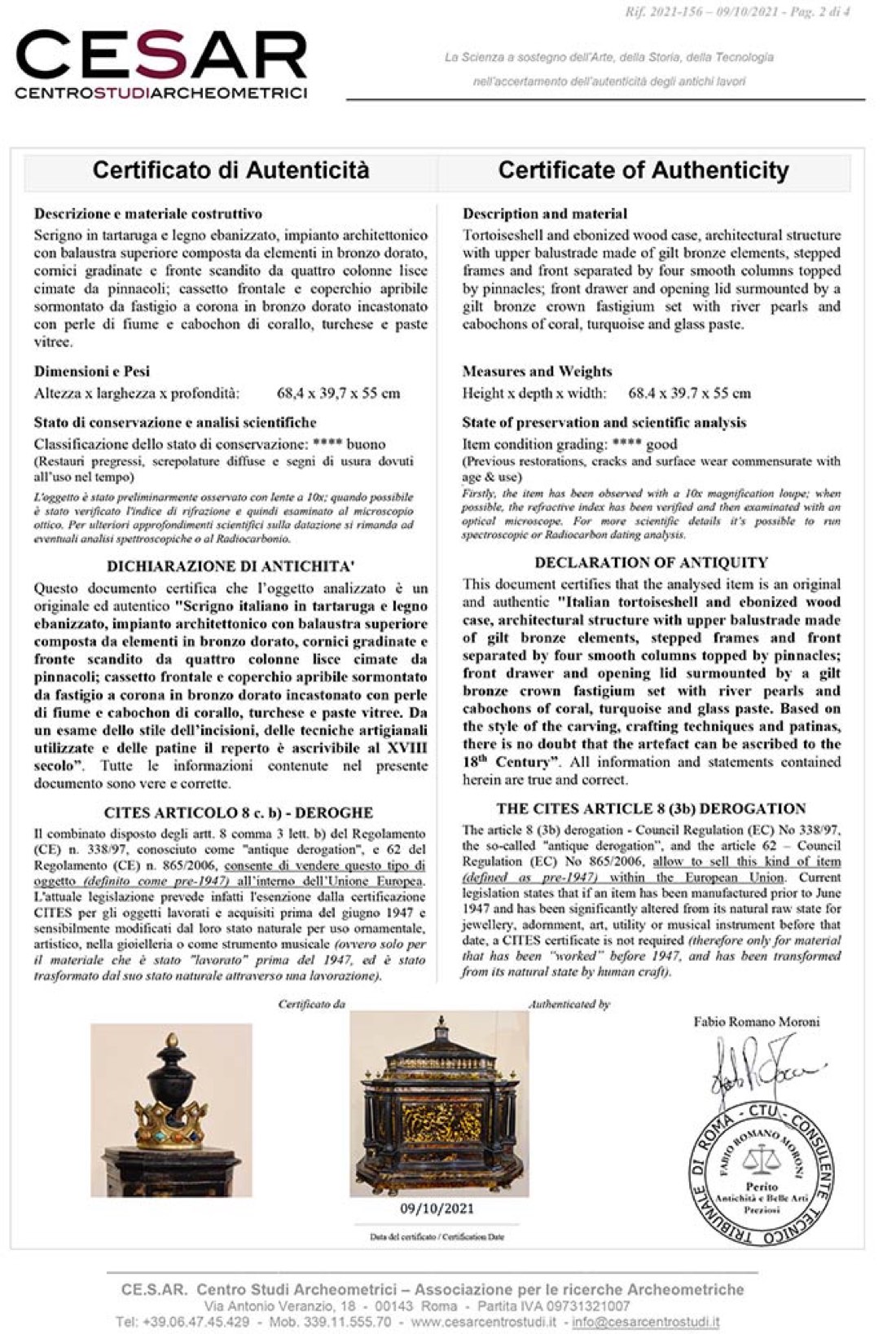 in tartaruga e legno ebanizzato, impianto architettonico con balaustra superiore composta da elementi in bronzo dorato, cornici gradinate e fronte scandito da quattro colonne lisce cimate da pinnacoli; cassetto frontale e coperchio apribile sormontato da fastigio a corona in bronzo dorato incastonato con perle di fiume e cabochon di corallo, turchese e paste vitree. Altezza x larghezza x profondità 68,4 x 39,7 x 55 cm. Stato di conservazione: **** buono (restauri pregressi, screpolature diffuse e segni di usura dovuti all’uso nel tempo). Accompagnato da certificato di autenticità Ce.S.Ar. Centro Studi Archeometrici (pre-1947).