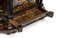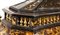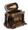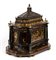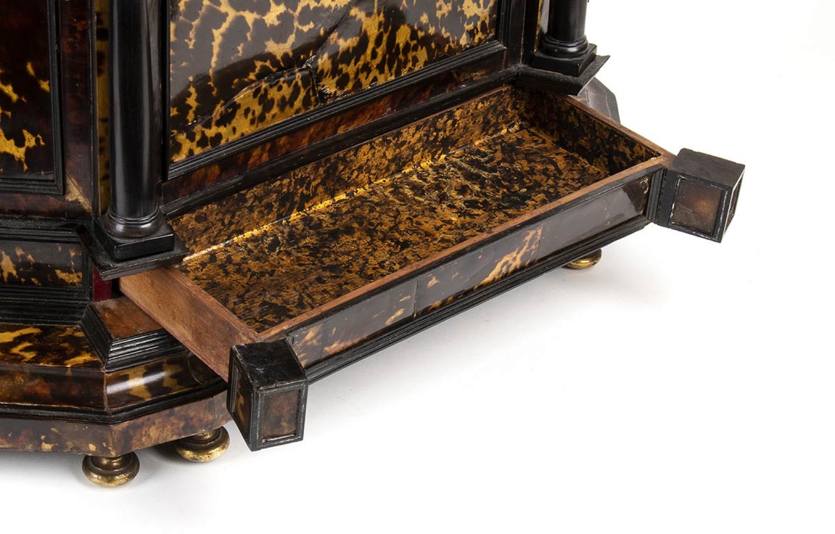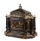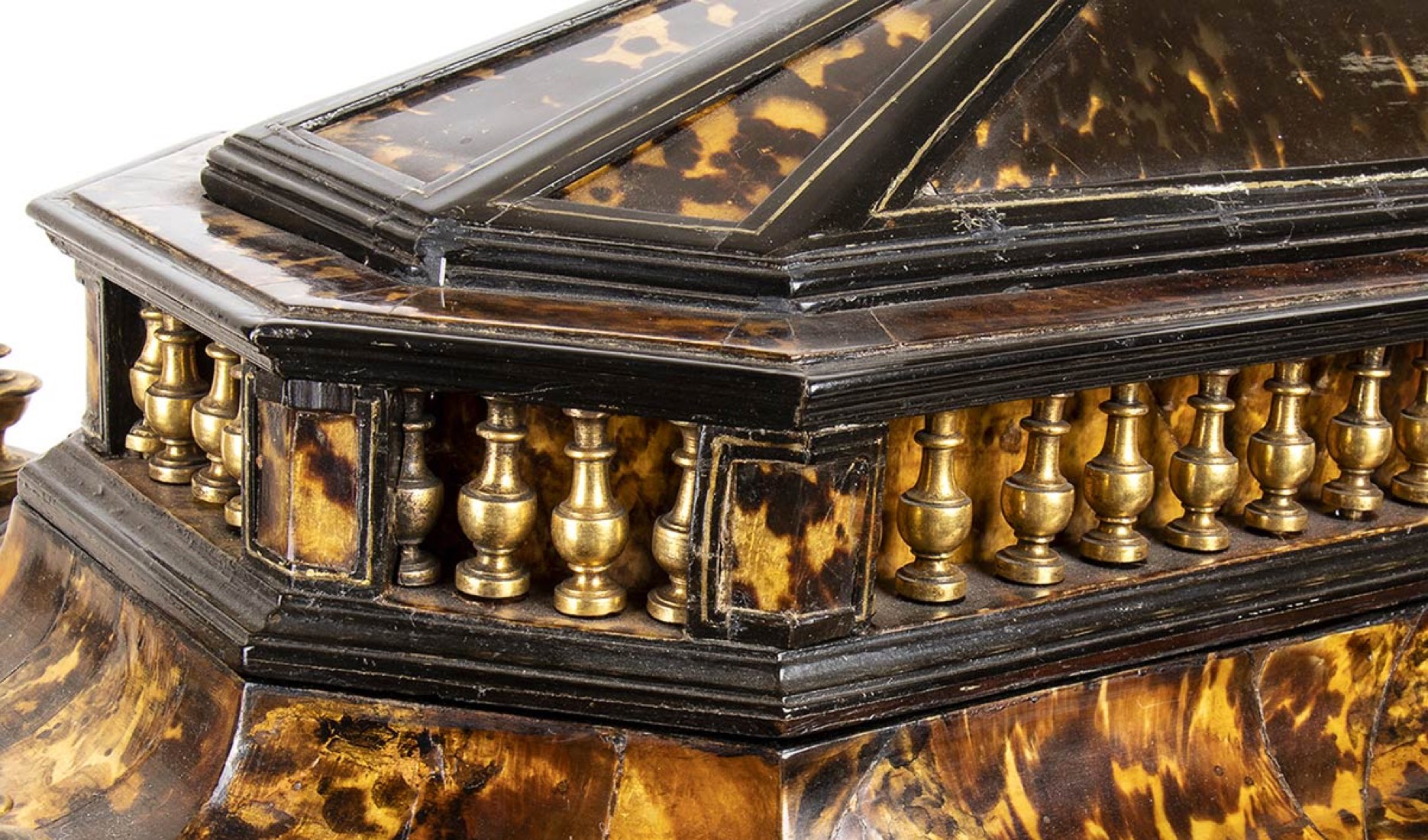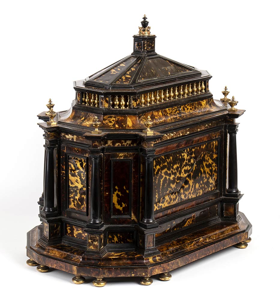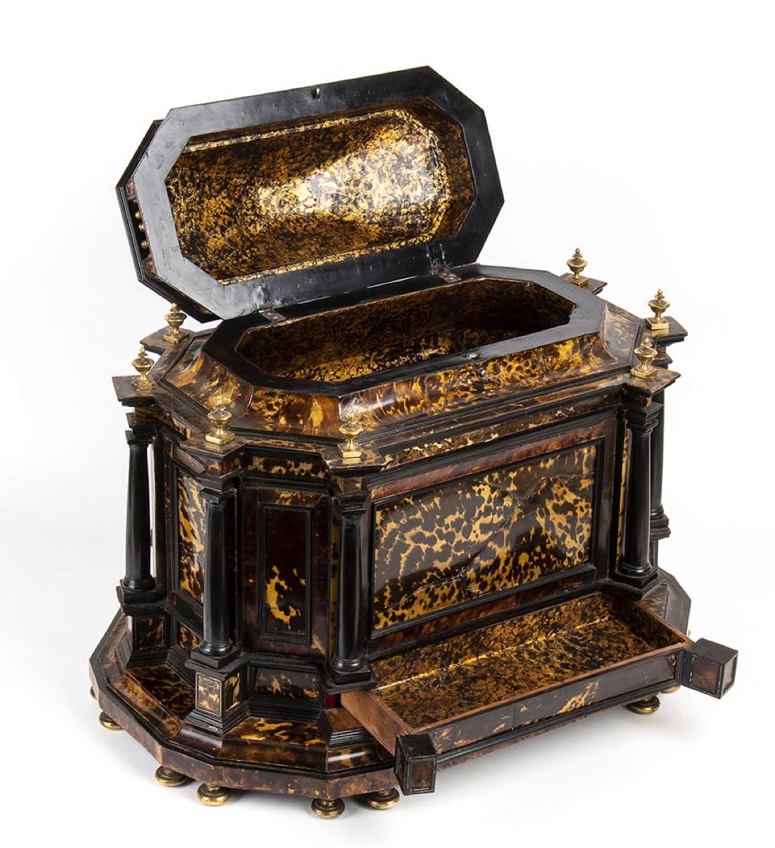 in tartaruga e legno ebanizzato, impianto architettonico con balaustra superiore composta da elementi in bronzo dorato, cornici gradinate e fronte scandito da quattro colonne lisce cimate da pinnacoli; cassetto frontale e coperchio apribile sormontato da fastigio a corona in bronzo dorato incastonato con perle di fiume e cabochon di corallo, turchese e paste vitree. Altezza x larghezza x profondità 68,4 x 39,7 x 55 cm. Stato di conservazione: **** buono (restauri pregressi, screpolature diffuse e segni di usura dovuti all’uso nel tempo). Accompagnato da certificato di autenticità Ce.S.Ar. Centro Studi Archeometrici (pre-1947).