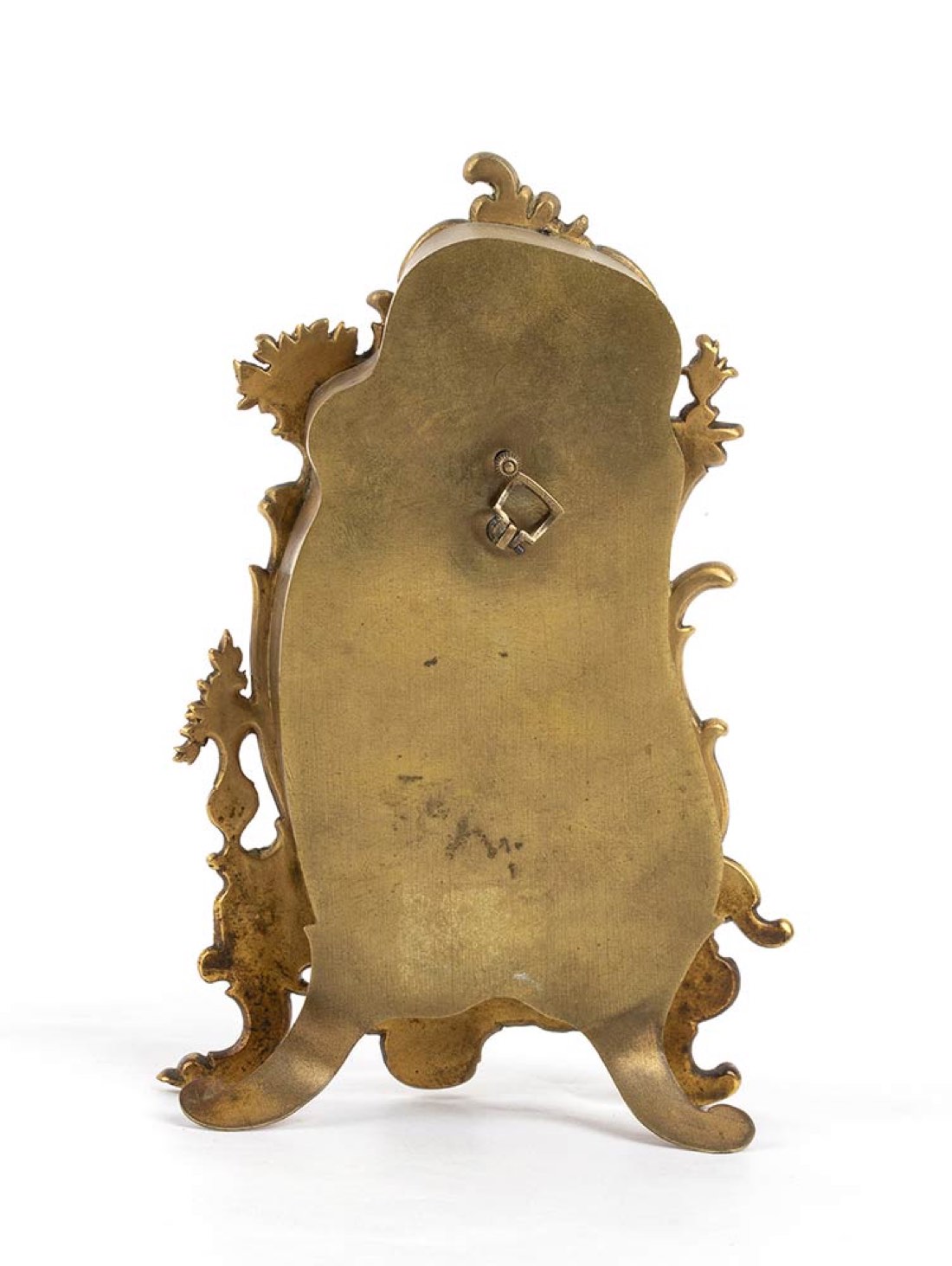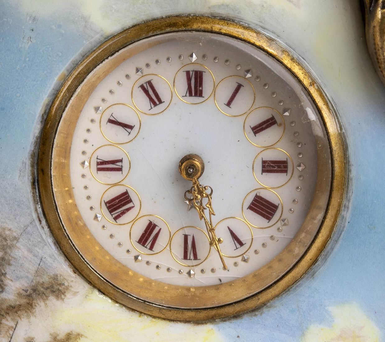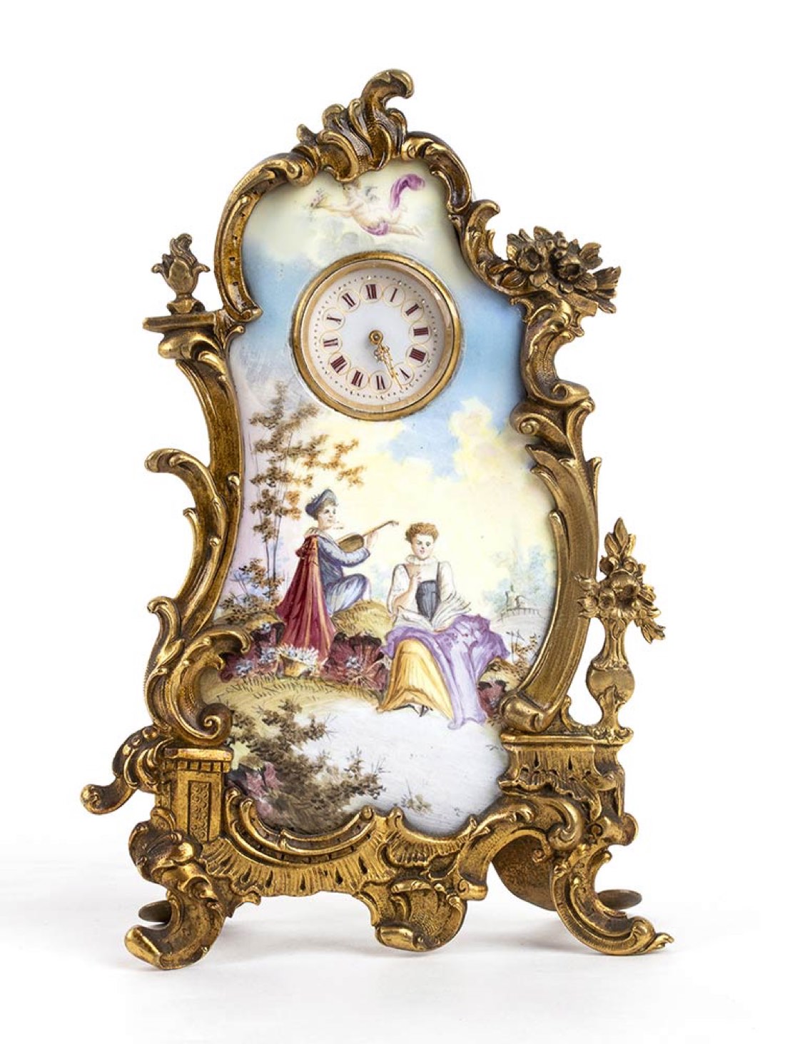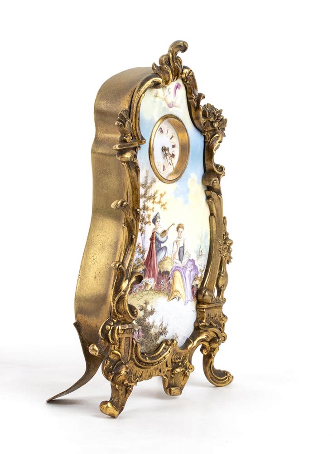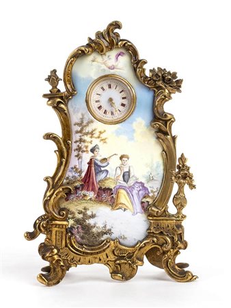 in bronzo dorato e porcellana dipinta a mano e smaltata con la raffigurazione di signore alla moda in scene di campagna, orologio con quadrante bianco e blu con numeri romani. Dimensioni 15 x 10 x 3 cm. Stato di conservazione: **** buono; orologio funzionante ma non revisionato.