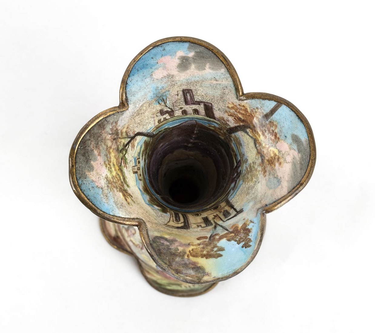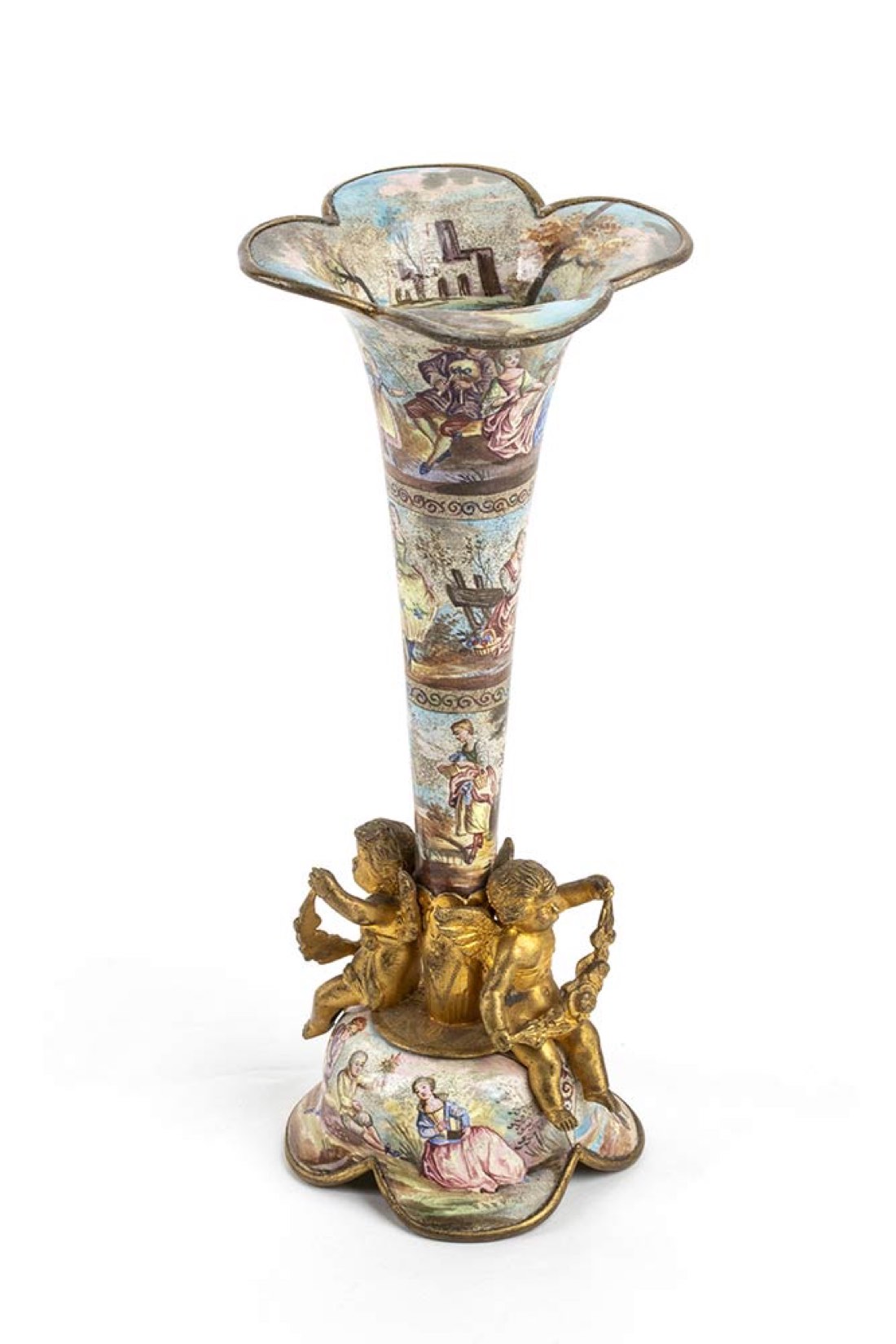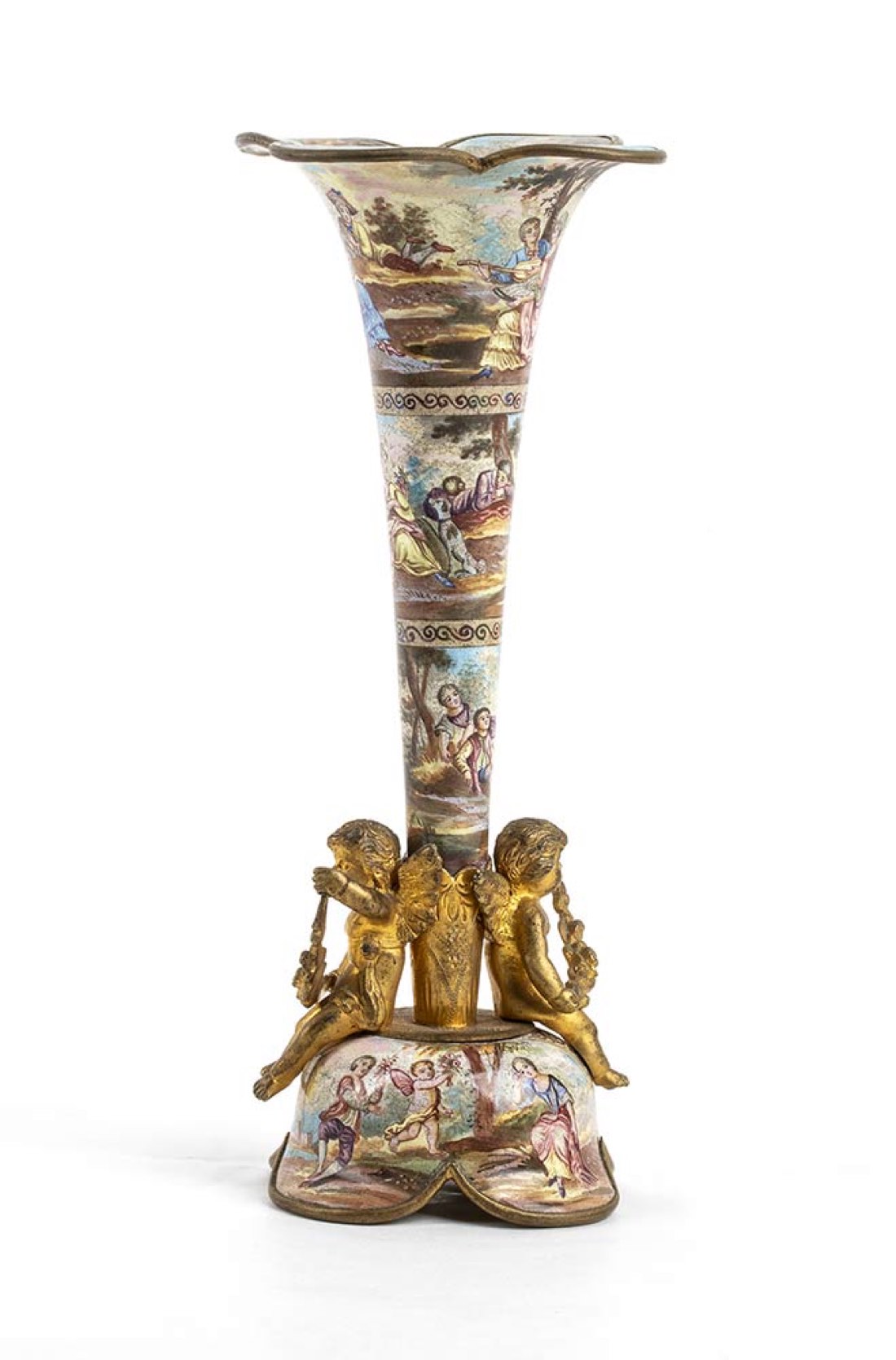 in bronzo dorato con due putti alati dipinto a mano e smaltato con la raffigurazione di di scene di campagna. Dimensioni 16 x 6,8 x 6,8 cm. Stato di conservazione: **** buono.