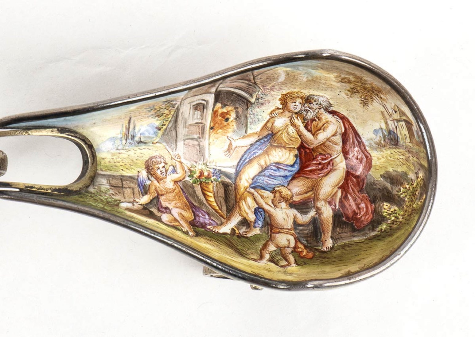 in bronzo dorato, dipinto a mano e smaltato con scene policrome. Dimensioni 5,5 x 10,8 x 4 cm. Stato di conservazione: **** buono.