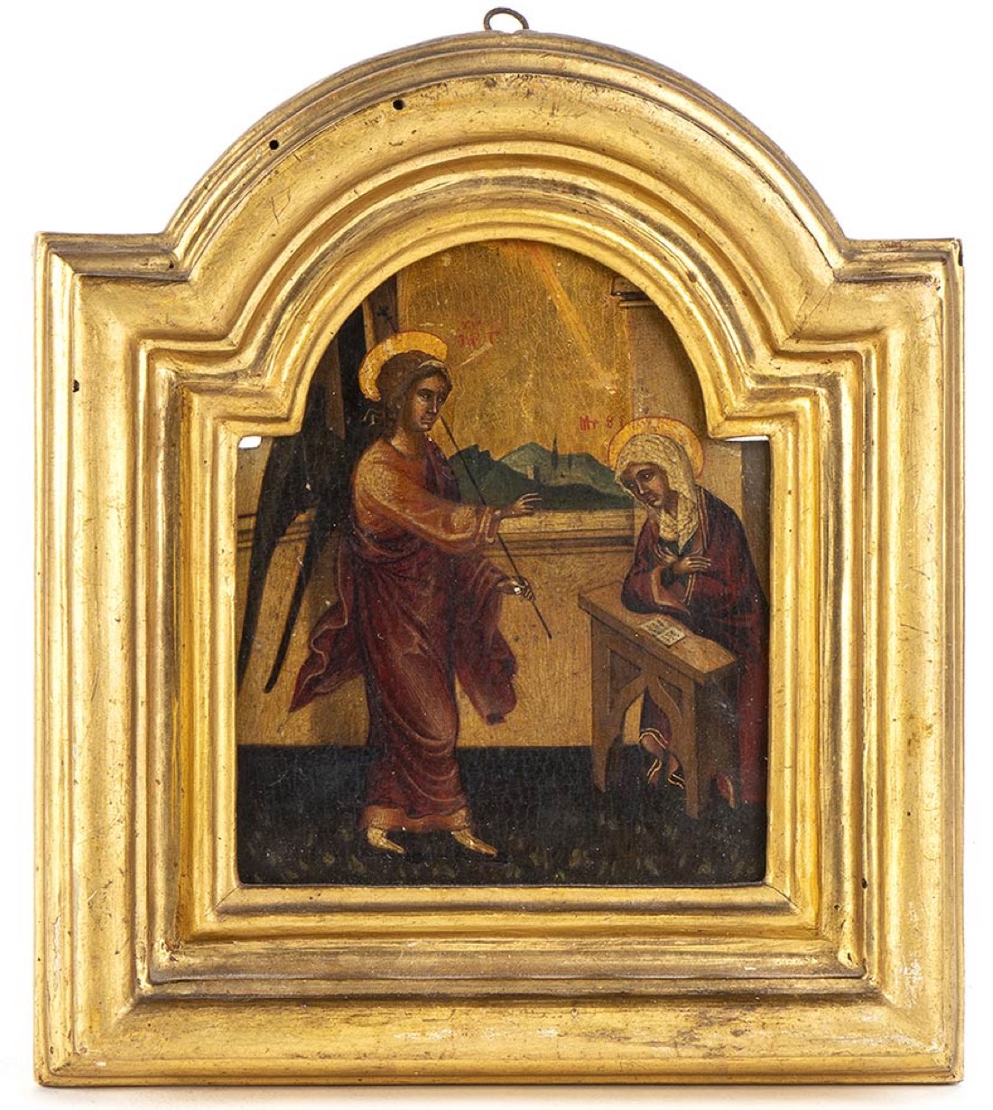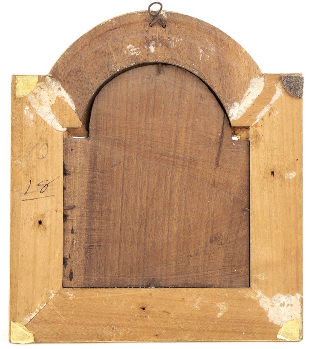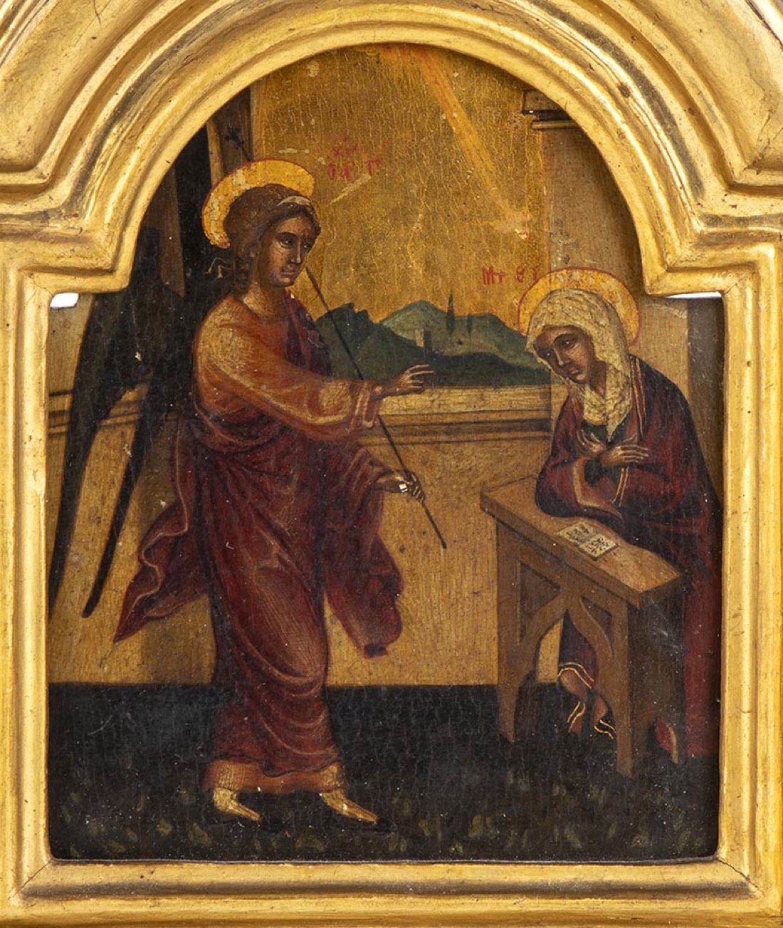 tempera su tavola, raffigurante l'Arcangelo Gabriele. Dimensioni 12,5 x 10 cm, entro cornice lignea 19 x 16,8 cm. Stato di conservazione: **** buono.