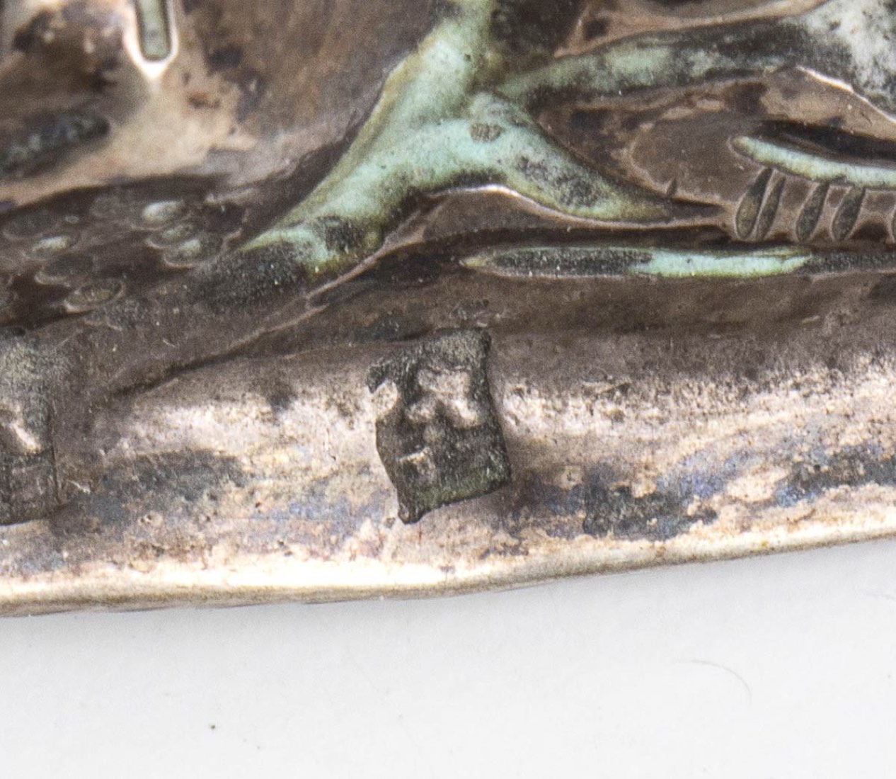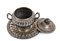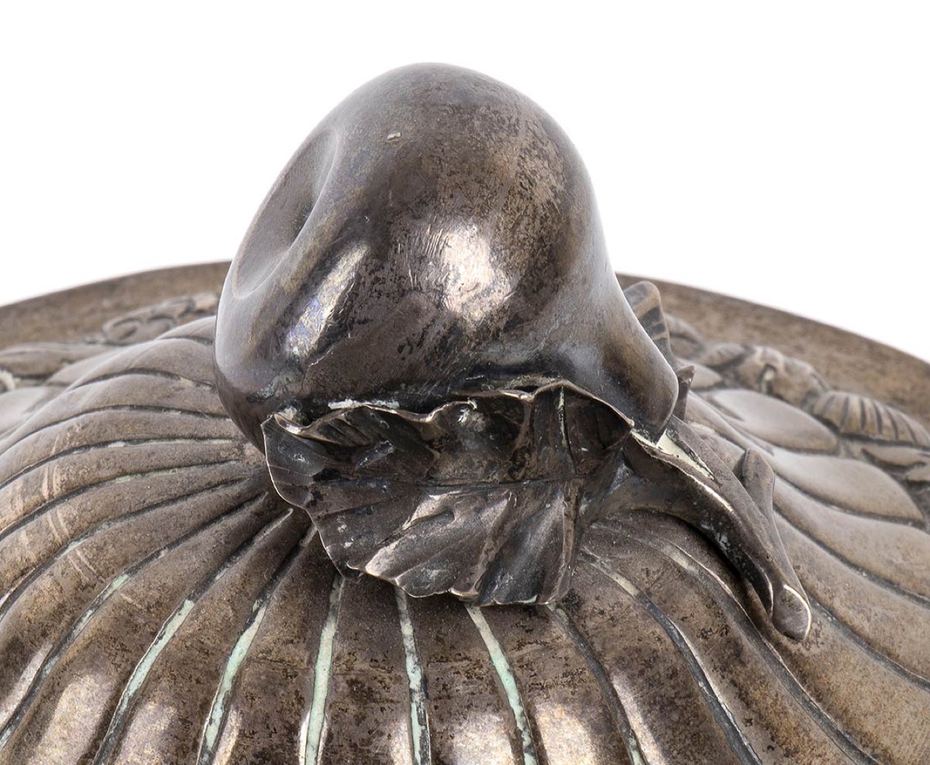 piatto circolare con decorazione sbalzata a "cocciolette", corpo e coperchio con decorazioni analoghe, manici laterali e fastigio a forma di pera. Punzonata due volte con il marchio in uso alla corporazione degli orefici di Napoli per l'argento al titolo di 833/1000 o 10 once, 1832-1872.