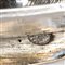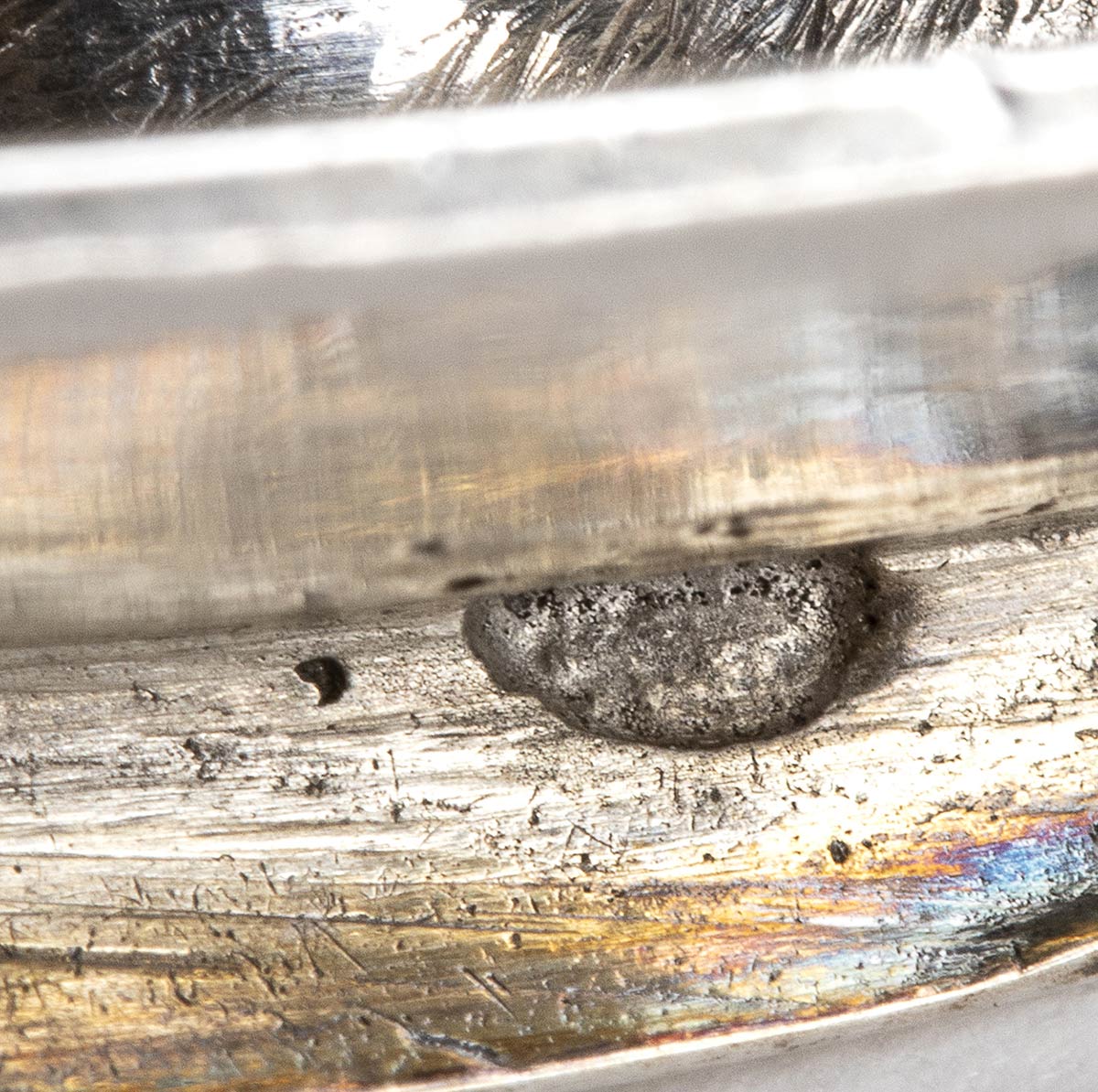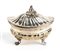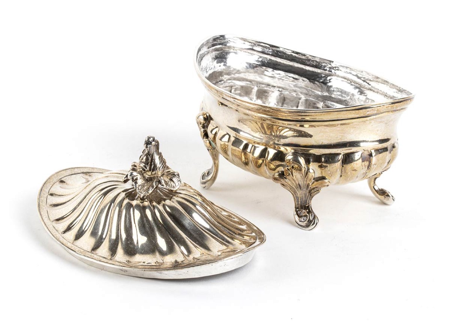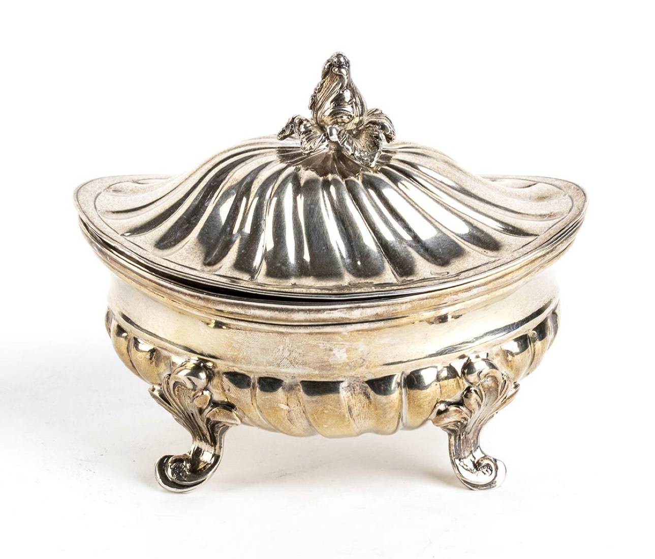 corpo di forma ovale decorato da scanalature a lenta curva poggiante su quattro piedini; stesso andamento sul coperchio terminante con motivo di bocciolo fogliato. Assaggiatore e contrassaggiatore, maestro orafo argentiere Carlo Micha (Rif. Bargoni, Maestri orafi e e argentieri in piemonte, pag. 27 e Tav. II nr. 3 e 4). Altezza 11 cm. Peso 320 gr.