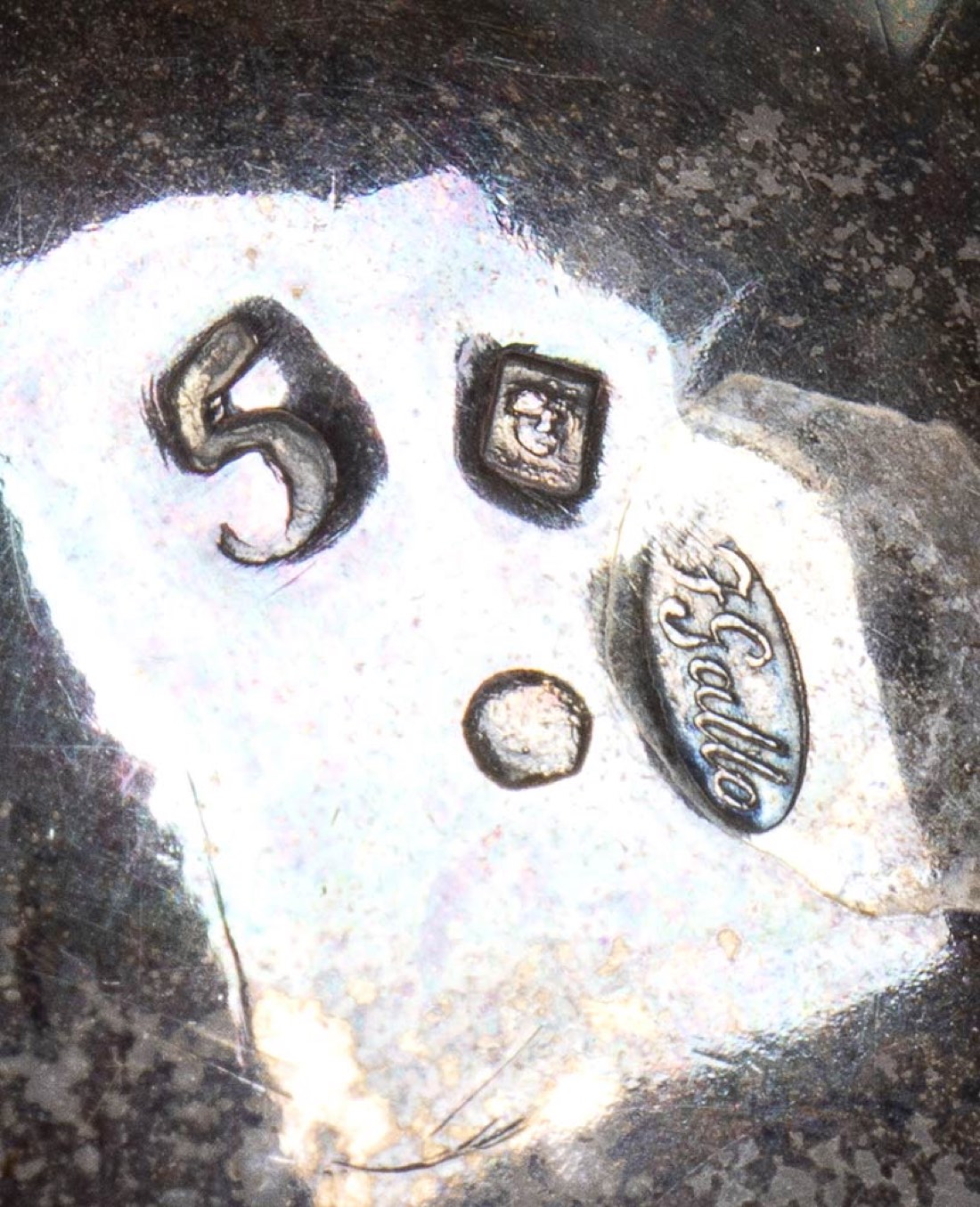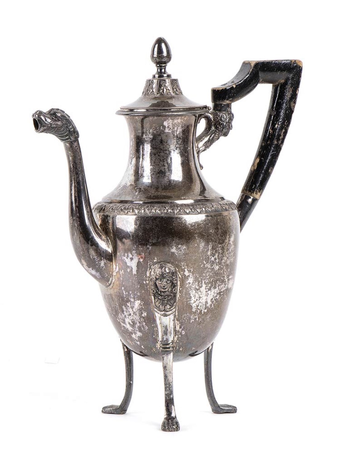 a tre piedini, corpo a uovo con versatoio zoomorfo, coperchio con cimasa a forma di pigna e manico in legno con attacco antropomorfo e Punzonata con il marchio in uso alla corporazione degli orefici di Napoli per l'argento al titolo di 833/1000, 1809-1823, argentiere argentiere Francesco Gallo (Rif. Elio e Corrado Catello, argenti napoletani pag. 139).