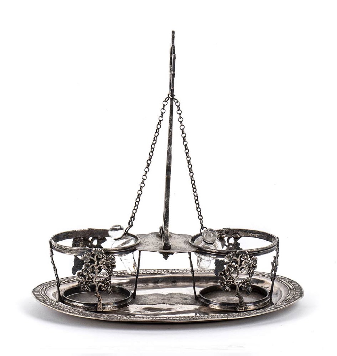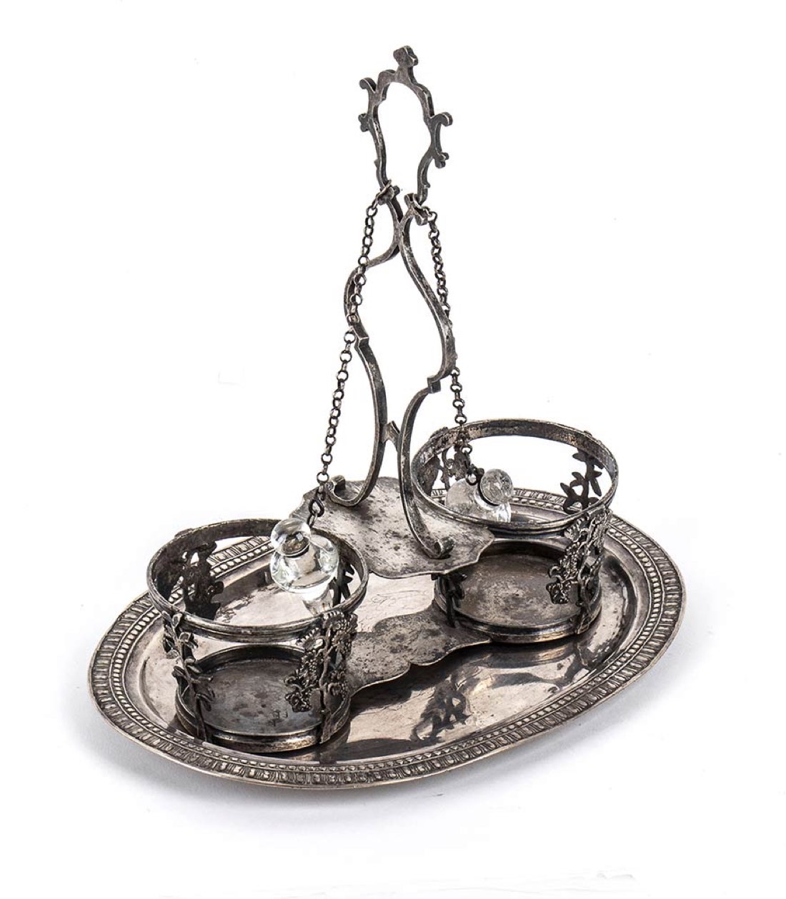 Ampolliniera, 24 x 20 x 7,5 cm, peso 369 gr; vassoietto 24 x 17,5 cm, peso 239 gr. Peso totale 608 gr.