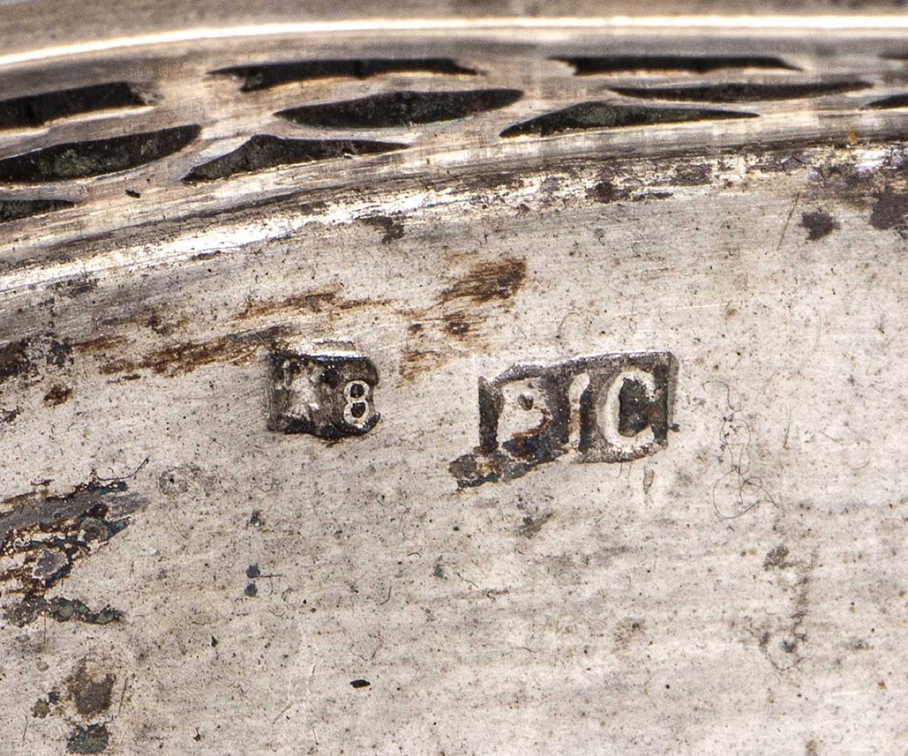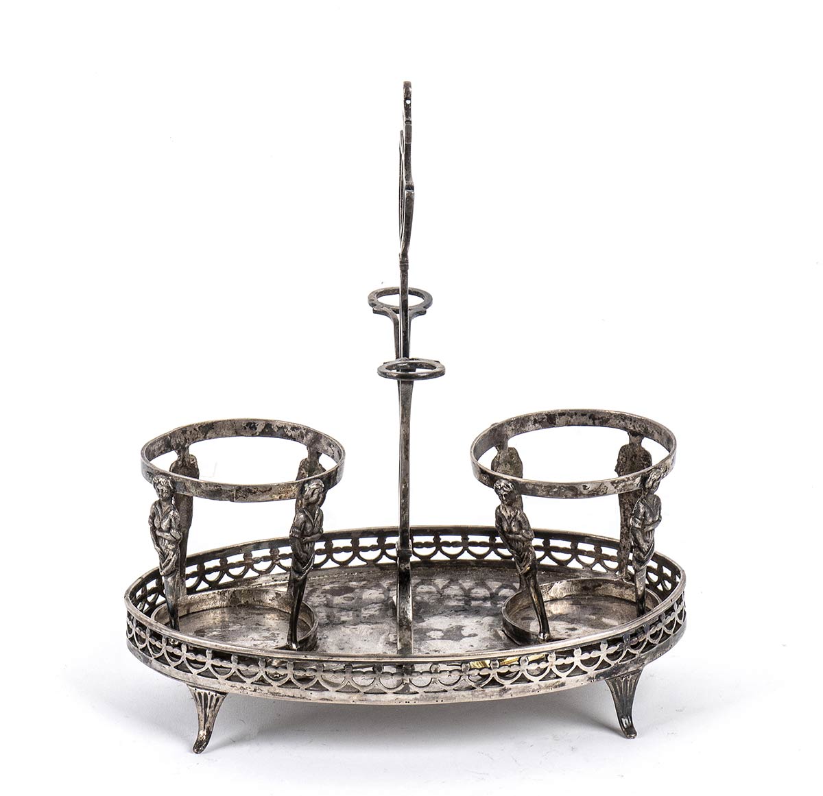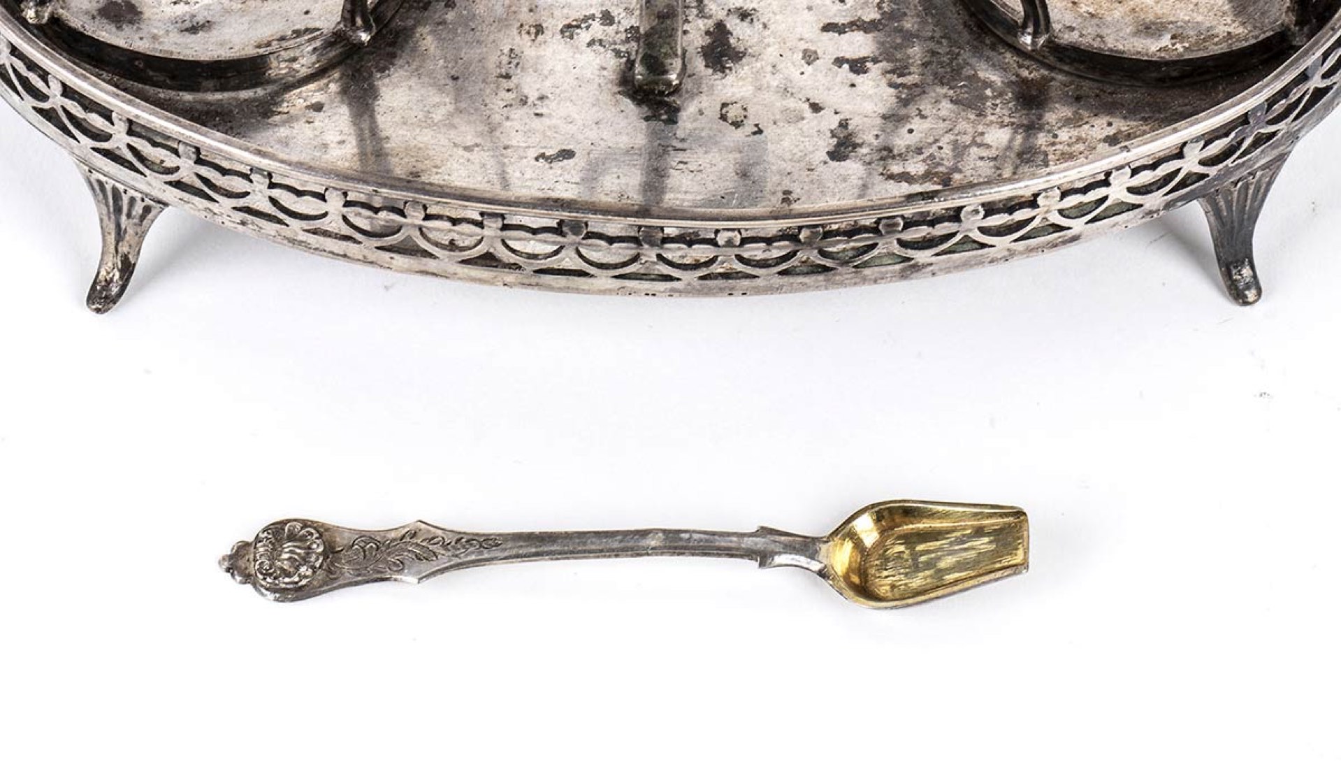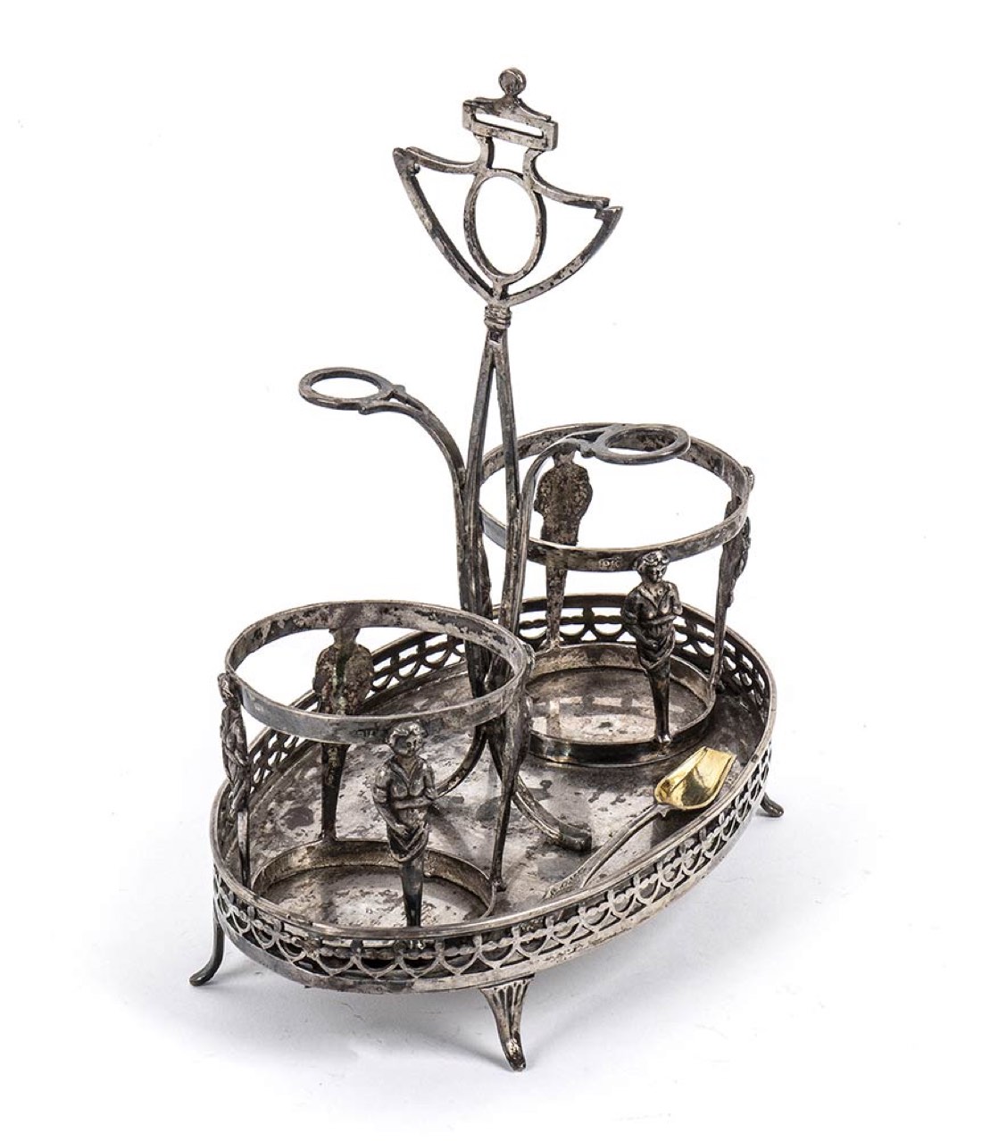 a base ovale con bordo traforato poggiante su quattro piedini. Punzonata con il marchio in uso alla corporazione degli orefici di Napoli per l'argento al titolo di 833/1000, 1824-1832.