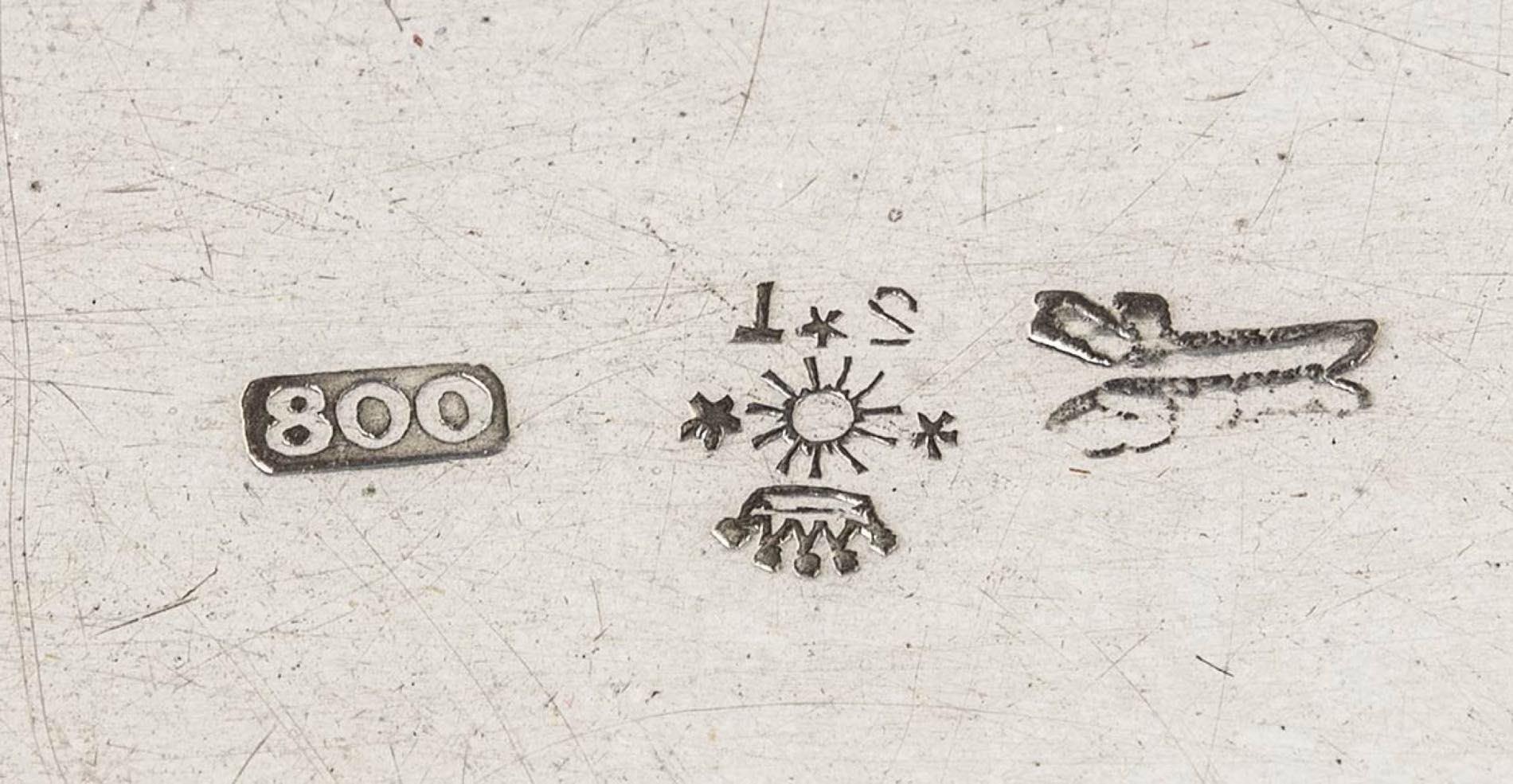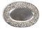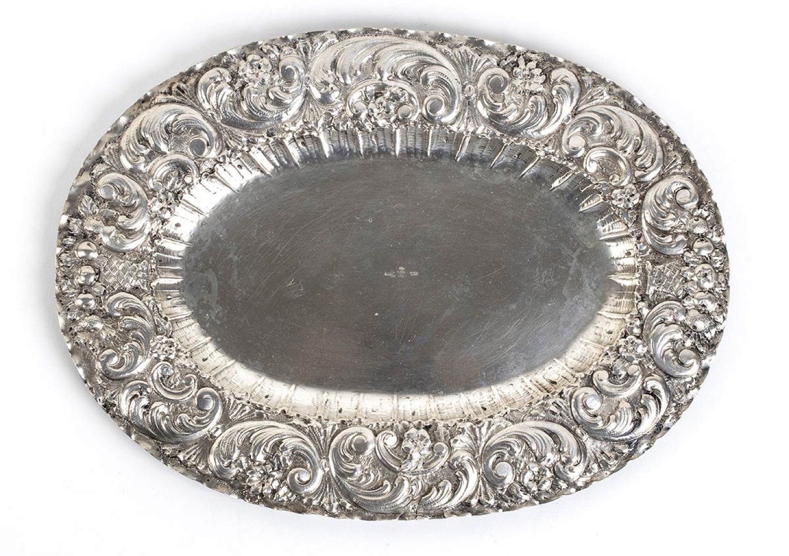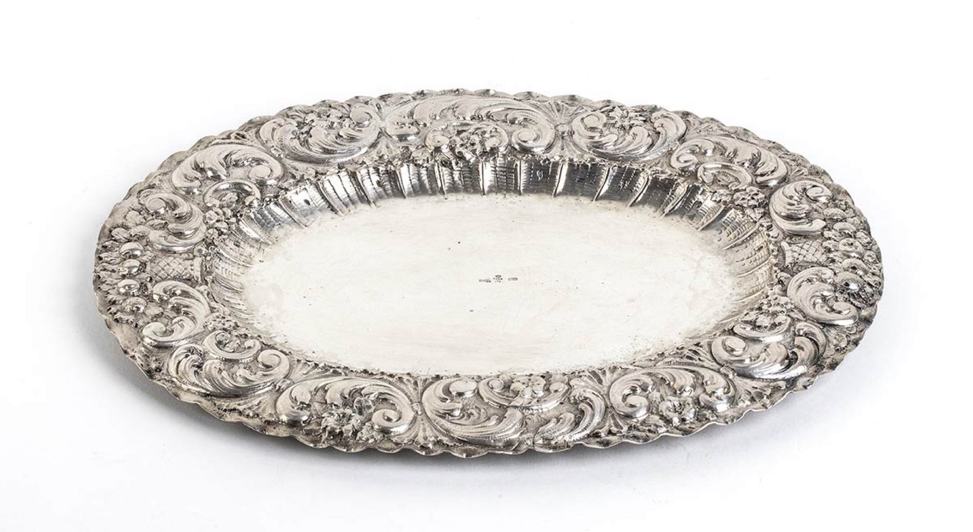 di forma ovale sbalzata e cesellata con volute fogliate. Punzonata "800". Dimensioni 29,5 x 21,5 cm. Peso 395 gr. Stato di conservazione: **** buono.