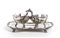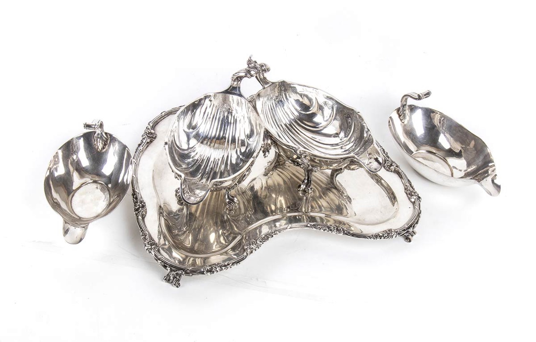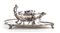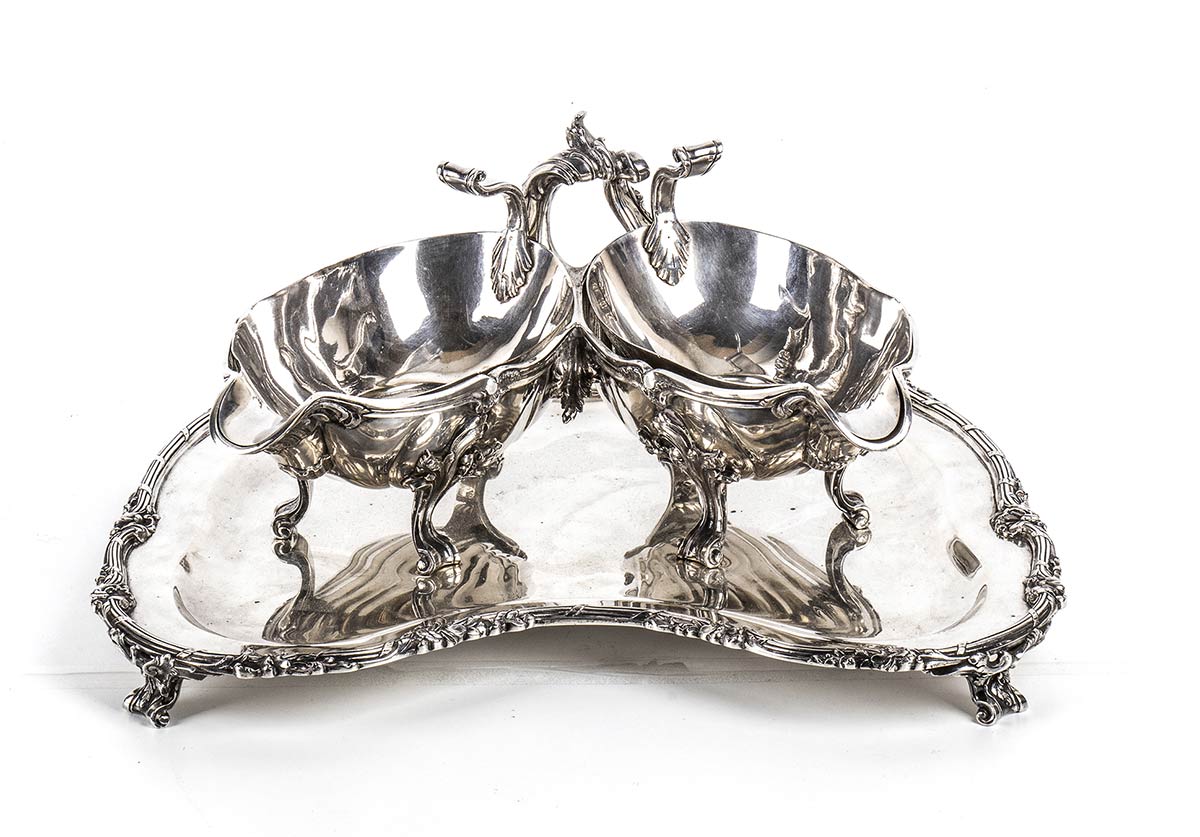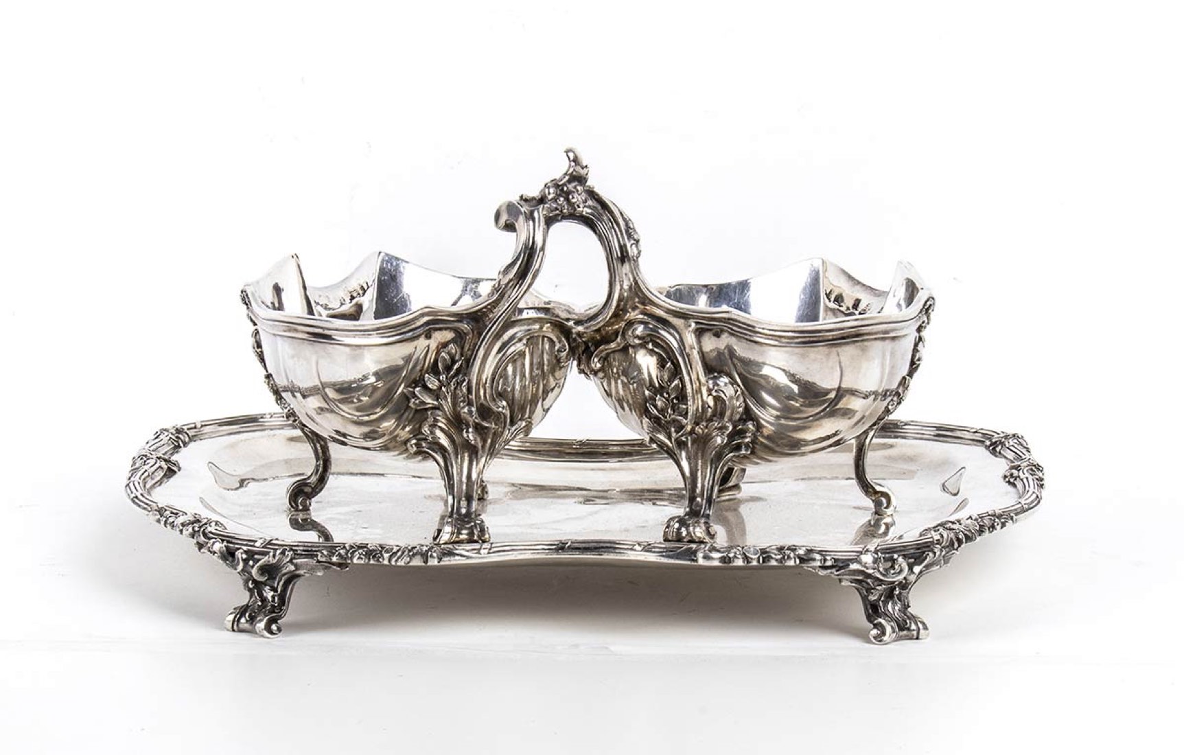 base mistilinea con bordi decorati a nastri e foglie d'acanto, poggiante su piedini fogliati, sopra la quale si innestano due salsiere con contenitori removibili. Punzonata con marchi francesi post 1838 in uso a Parigi per l'argento 950/1000, argentieri Georges Boin and Emile Taburet.