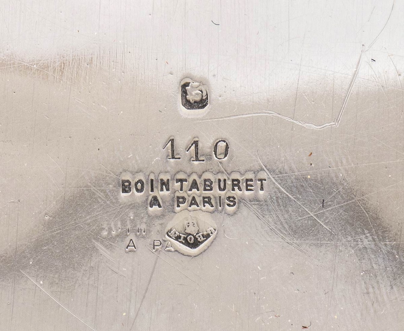 La fabbrica Boin-Taburet fu fondata nel 1873 dall'argentiere George Boin e da suo suocero, il fabbricante di gioielli Emile Taburet. Questi argentieri sono accreditati con la rinascita dell'argento in stile Luigi XV negli anni '80 del XIX secolo e vinsero una medaglia d'oro all'Esposizione Universale di Parigi 1889 per il loro monumentale lavoro storicista.Altezza x larghezza x profondità 14 x 34 x 30 cm. Peso 2426 gr. Stato di conservazione: ***** eccellente.