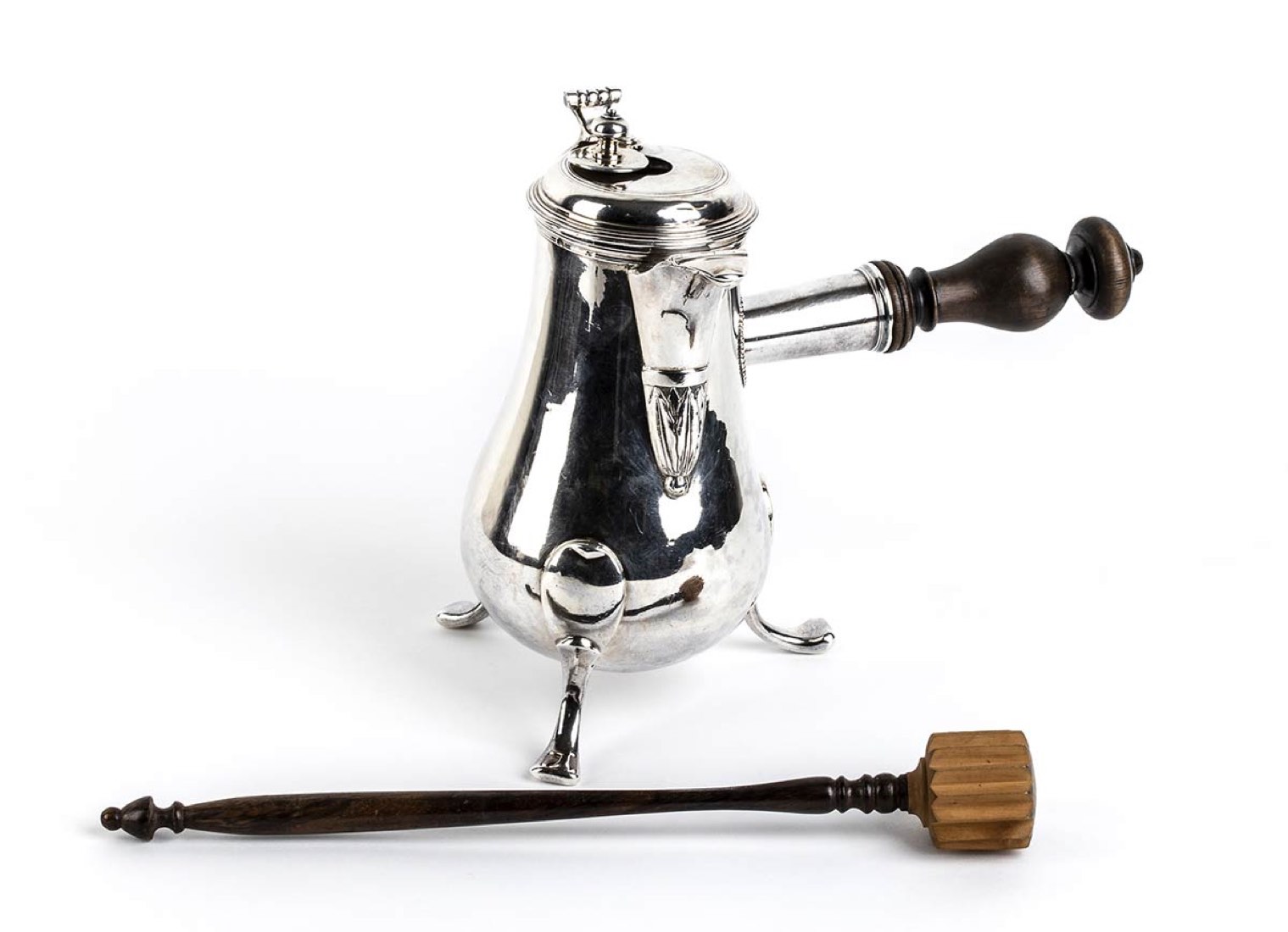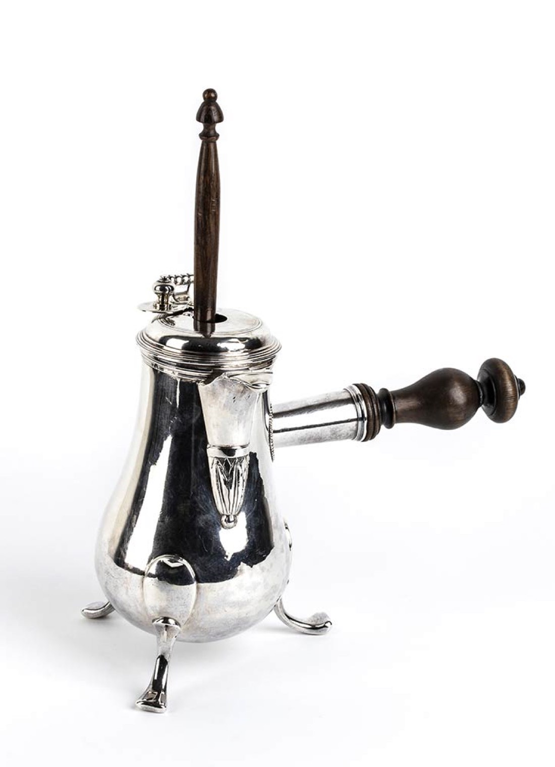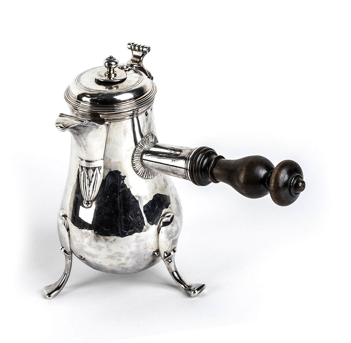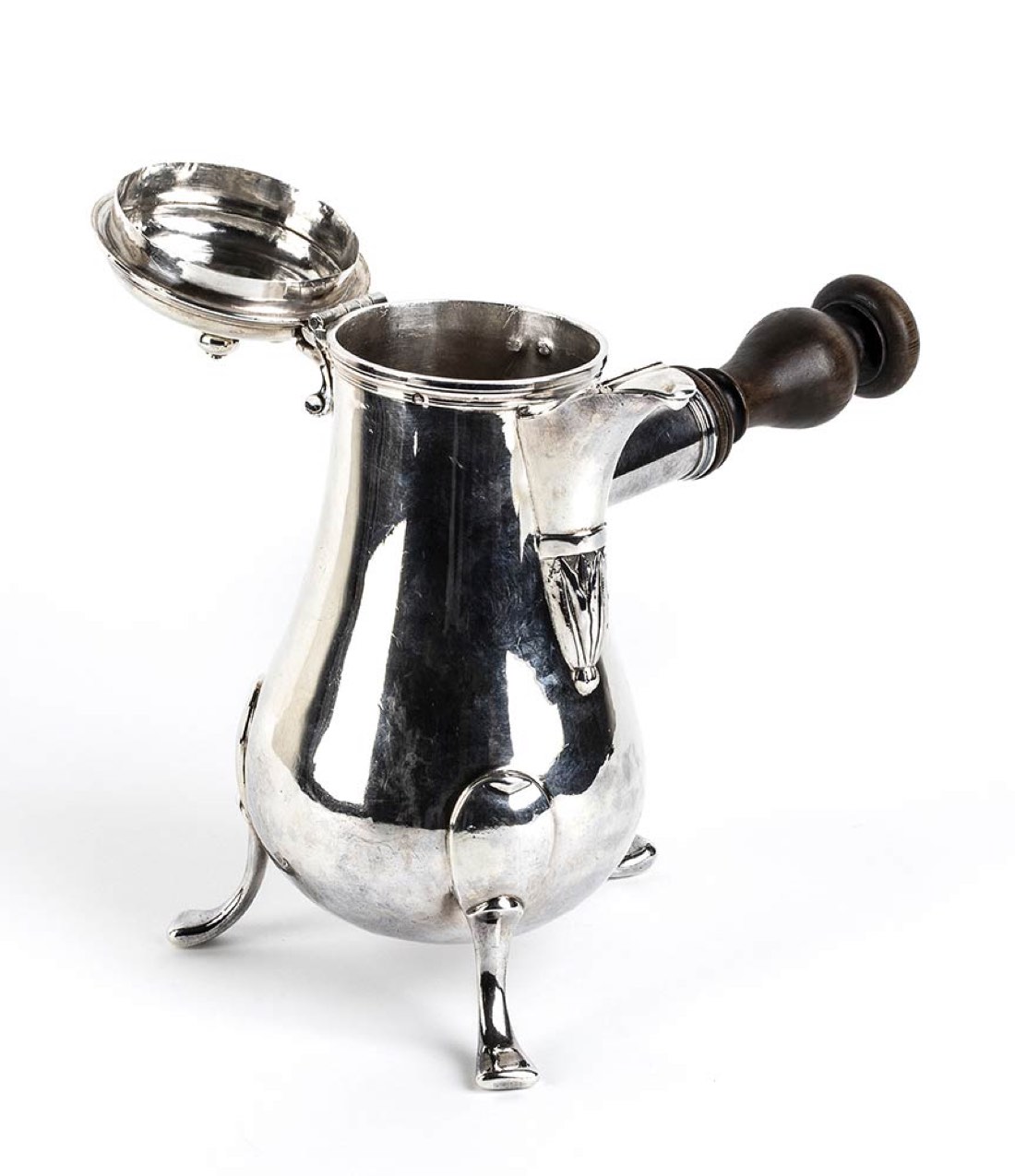 corpo piriforme poggiante sutre piedi, versatoio a becco aderente al corpo con decoro fogliato alla base, poggiadito a voluta fogliata e manico laterale in legno tornito. Al centro del coperchio incernierato una cimatura a pomolo a celare un foro per l'originale frusta di legno intagliato. Serie completa di marchi Parigi 1735, fermiere Hubert Louvet (Rif. L.Carré pag. 33), ricontrollato a Chartres nel 1819-1838 (Rif. L.Carré pag. 200-201). Diametro 10 cm, altezza 21,5 cm, larghezza con manico 23 cm. Peso totale 895 gr (840+55). Stato di conservazione: **** buono.