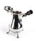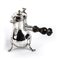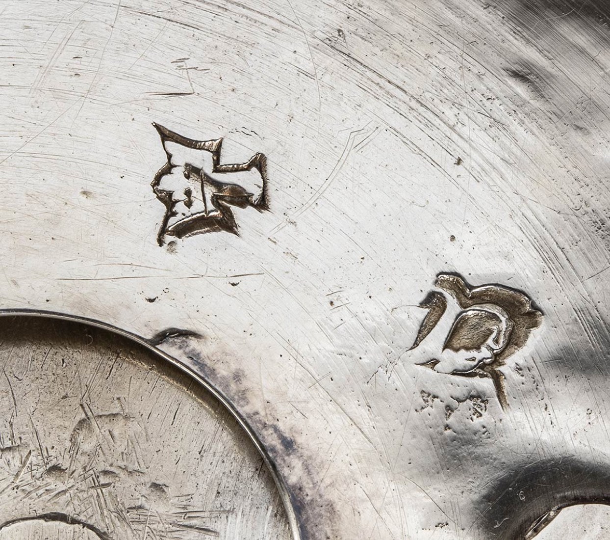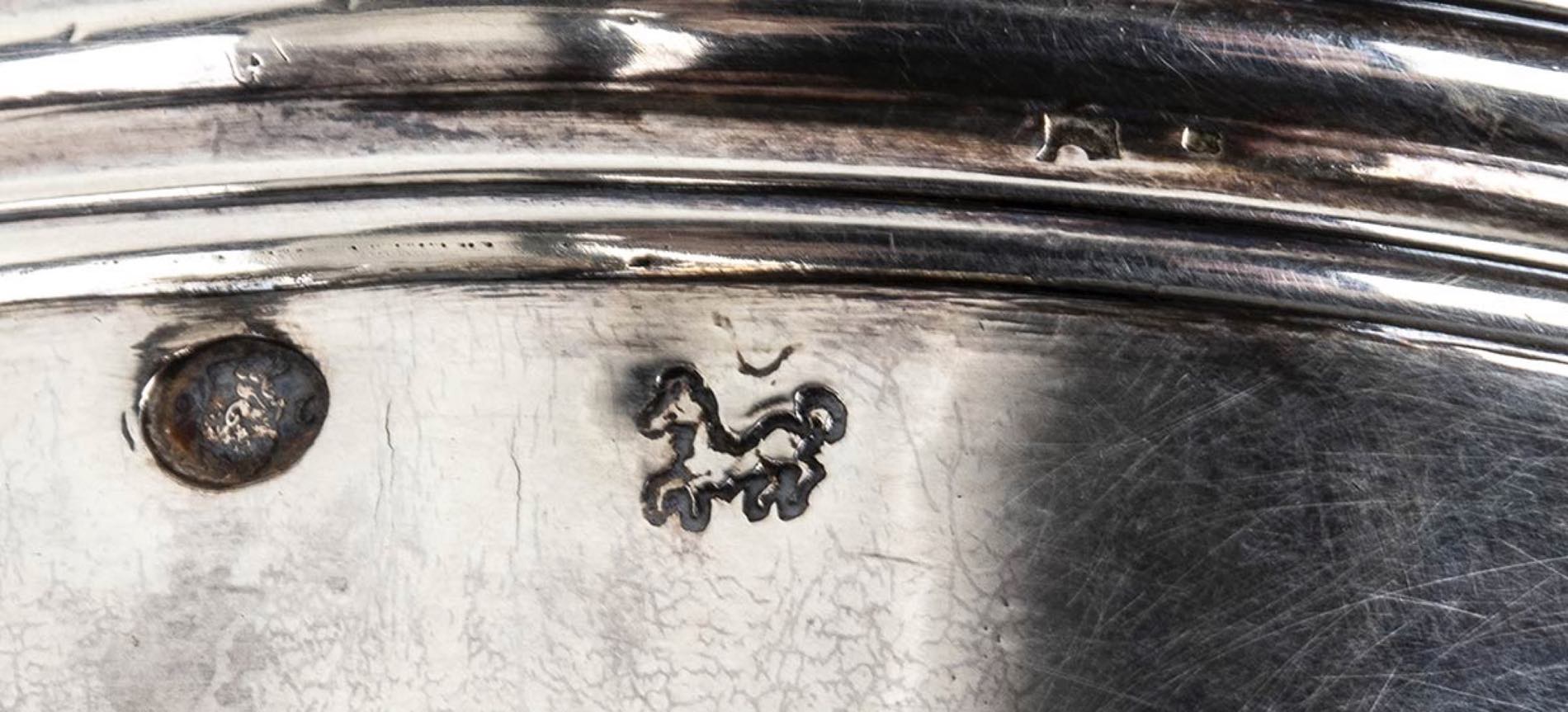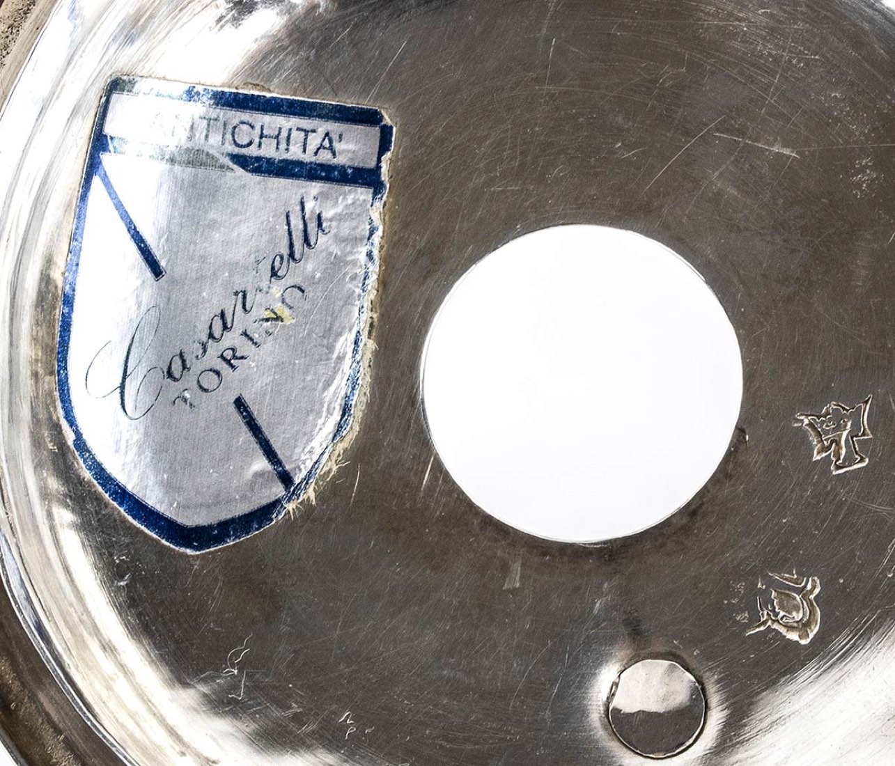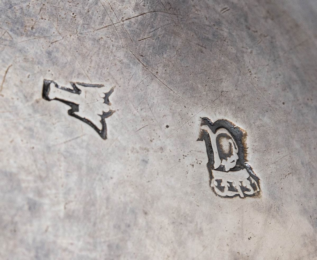 corpo piriforme poggiante sutre piedi, versatoio a becco aderente al corpo con decoro fogliato alla base, poggiadito a voluta fogliata e manico laterale in legno tornito. Al centro del coperchio incernierato una cimatura a pomolo a celare un foro per l'originale frusta di legno intagliato. Serie completa di marchi Parigi 1735, fermiere Hubert Louvet (Rif. L.Carré pag. 33), ricontrollato a Chartres nel 1819-1838 (Rif. L.Carré pag. 200-201). Diametro 10 cm, altezza 21,5 cm, larghezza con manico 23 cm. Peso totale 895 gr (840+55). Stato di conservazione: **** buono.