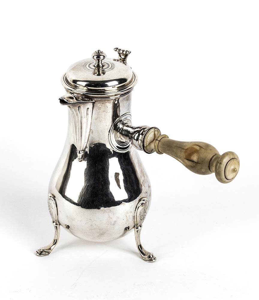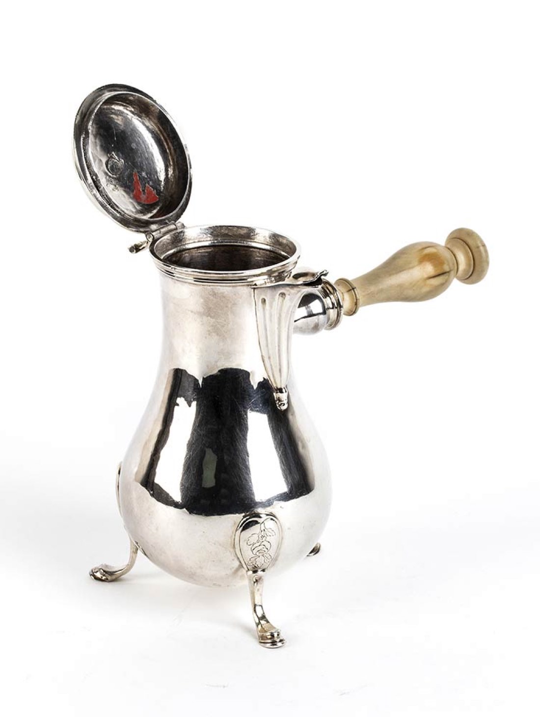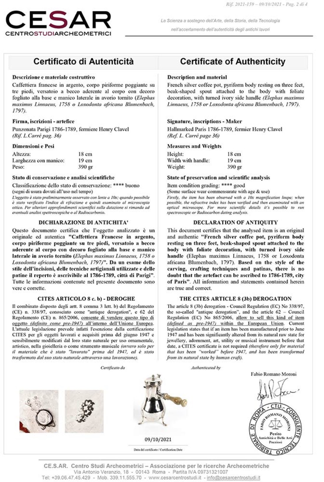 corpo piriforme poggiante su tre piedi, versatoio a becco aderente al corpo con decoro fogliato alla base e manico laterale in avorio tornito (Elephas maximus Linnaeus, 1758 o Loxodonta africana Blumenbach, 1797). Punzonata Parigi 1786-1789, fermiere Henry Clavel (Rif. L.Carré pag. 36). Altezza 18 cm, larghezza con manico 19 cm. Peso 390 gr. Stato di conservazione: **** buono. Accompagnato da certificato di autenticità Ce.S.Ar. Centro Studi Archeometrici (pre-1947).