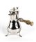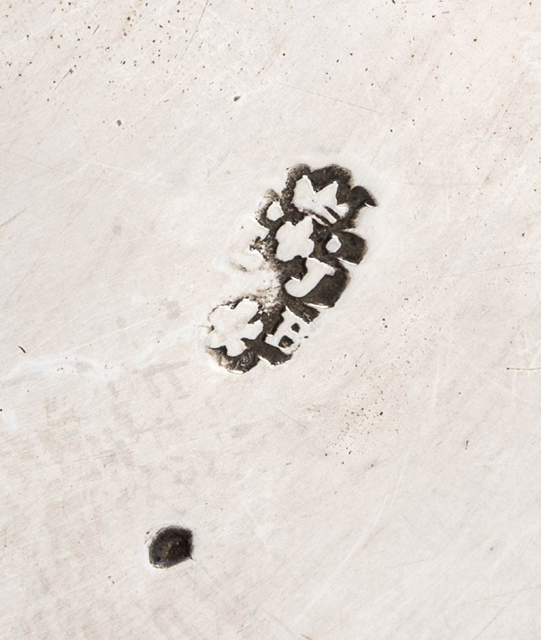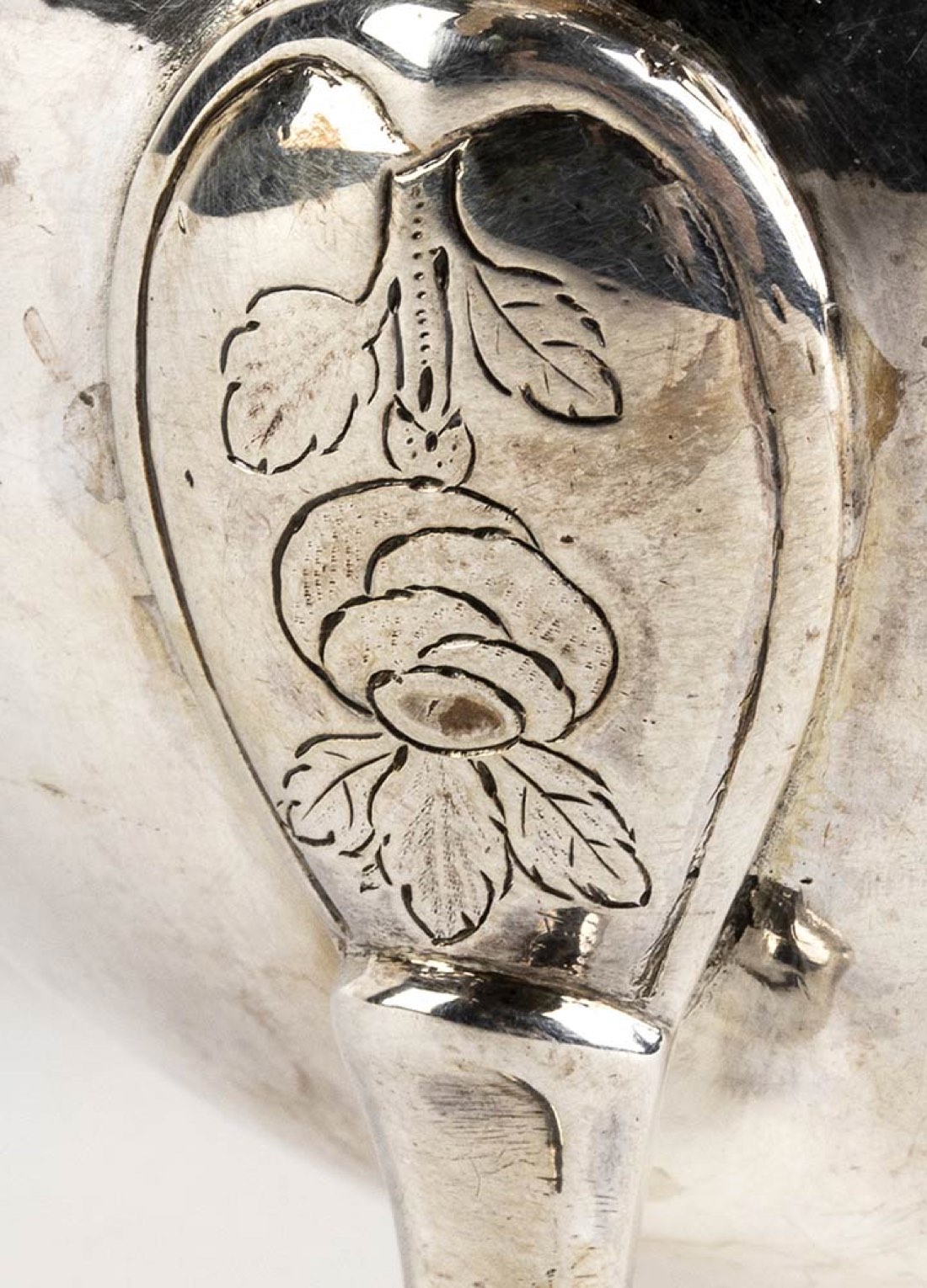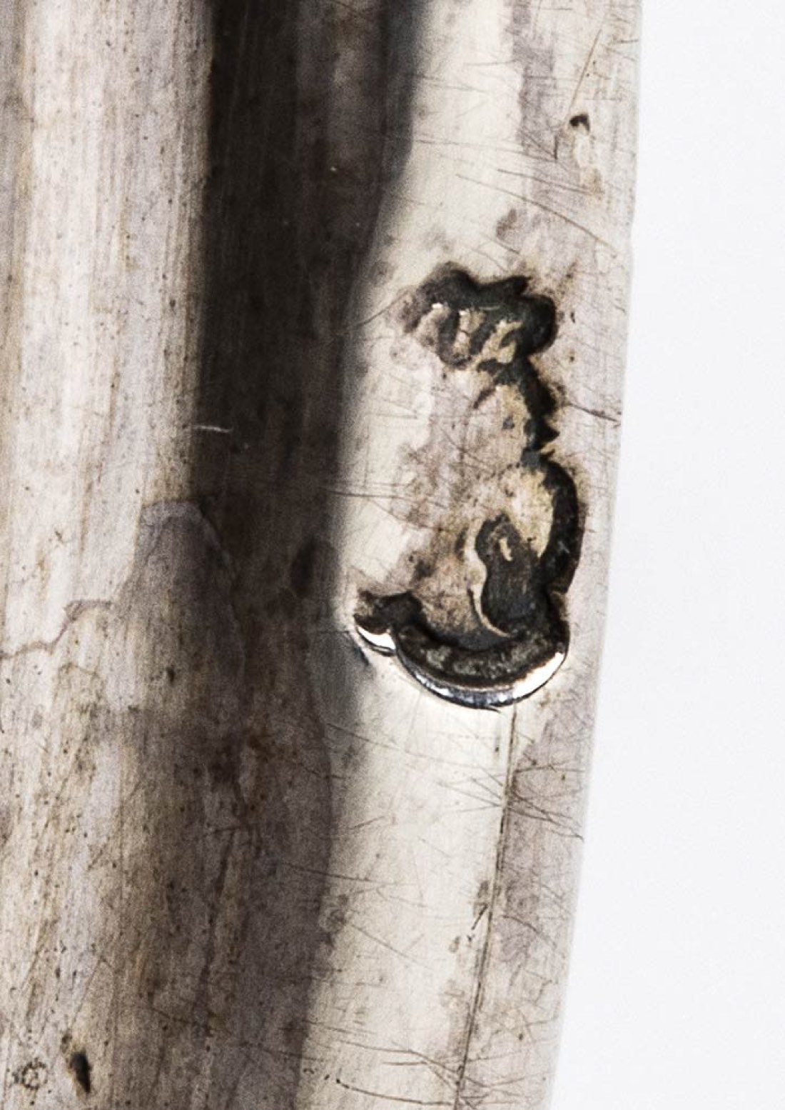 corpo piriforme poggiante su tre piedi, versatoio a becco aderente al corpo con decoro fogliato alla base e manico laterale in avorio tornito (Elephas maximus Linnaeus, 1758 o Loxodonta africana Blumenbach, 1797). Punzonata Parigi 1786-1789, fermiere Henry Clavel (Rif. L.Carré pag. 36). Altezza 18 cm, larghezza con manico 19 cm. Peso 390 gr. Stato di conservazione: **** buono. Accompagnato da certificato di autenticità Ce.S.Ar. Centro Studi Archeometrici (pre-1947).