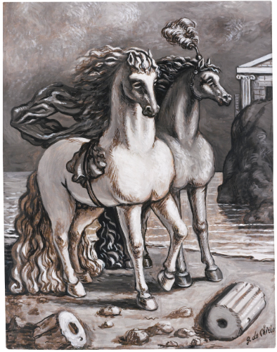 GIORGIO DE CHIRICO 1888 - 1978 CAVALLI ANTICHI signed; signed, titled and inscribed on the reverse, oil on canvas, executed in 1950-55 circa firmato; firmato, intitolato e iscritto sul retro olio su tela cm 90x70 Eseguito nella prima metà degli anni Cinquanta Opera registrata presso la Fondazione Giorgio e Isa de Chirico, Roma, con il n. 010/03/09 OT L'opera è accompagnata da certificato su fotografia rilasciato dalla Fondazione Giorgio e Isa de Chirico, Roma PROVENANCE International Galleries, Chigaco, acquistato direttamente dall'artista Galleria Gissi, Torino, n. 3145 Ivi acquistato della famiglia dell'attuale proprietario negli anni Sessanta EXHIBITED Chicago, International Galleries, Giorgio de Chirico, Venti recenti lavori, 1957 NOTA DEL CATALOGO L’attestato di libera circolazione è stato richiesto per questo lotto